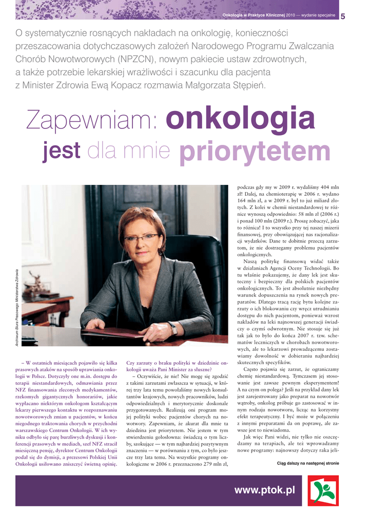 Onkologia w Praktyce Klinicznej 2010 — wydanie specjalne O systematycznie rosnących nakładach na onkologię, konieczności przeszacowania dotychczasowych założeń Narodowego Programu Zwalczania Chorób Nowotworowych (NPZCN), nowym pakiecie ustaw zdrowotnych, a także potrzebie lekarskiej wrażliwości i szacunku dla pacjenta z Minister Zdrowia Ewą Kopacz rozmawia Małgorzata Stępień. Zapewniam: onkologia priorytetem Archiwum Biura Prasowego Ministerstwa Zdrowia jest dla mnie – W ostatnich miesiącach pojawiło się kilka prasowych ataków na sposób uprawiania onkologii w Polsce. Dotyczyły one m.in. dostępu do terapii niestandardowych, odmawiania przez NFZ finansowania zleconych medykamentów, rzekomych gigantycznych honorariów, jakie wypłacano niektórym onkologom kształcącym lekarzy pierwszego kontaktu w rozpoznawaniu nowotworowych zmian u pacjentów, w końcu niegodnego traktowania chorych w przychodni warszawskiego Centrum Onkologii. W ich wyniku odbyło się parę burzliwych dyskusji i konferencji prasowych w mediach, szef NFZ stracił miesięczną pensję, dyrektor Centrum Onkologii podał się do dymisji, a prezesowi Polskiej Unii Onkologii usiłowano zniszczyć świetną opinię. Czy zarzuty o braku polityki w dziedzinie onkologii uważa Pani Minister za słuszne? – Oczywiście, że nie! Nie mogę się zgodzić z takimi zarzutami zwłaszcza w sytuacji, w której trzy lata temu powołaliśmy nowych konsultantów krajowych, nowych pracowników, ludzi odpowiedzialnych i merytorycznie doskonale przygotowanych. Realizują oni program mojej polityki wobec pacjentów chorych na nowotwory. Zapewniam, że akurat dla mnie ta dziedzina jest priorytetem. Nie jestem w tym stwierdzeniu gołosłowna: świadczą o tym liczby, szokujące — w tym najbardziej pozytywnym znaczeniu — w porównaniu z tym, co było jeszcze trzy lata temu. Na wszystkie programy onkologiczne w 2006 r. przeznaczono 279 mln zł, podczas gdy my w 2009 r. wydaliśmy 404 mln zł! Dalej, na chemioterapię w 2006 r. wydano 164 mln zł, a w 2009 r. był to już miliard złotych. Z kolei w chemii niestandardowej te różnice wynoszą odpowiednio: 58 mln zł (2006 r.) i ponad 100 mln (2009 r.). Proszę zobaczyć, jaka to różnica! I to wszystko przy tej naszej mizerii finansowej, przy obowiązującej nas racjonalizacji wydatków. Dane te dobitnie przeczą zarzutom, że nie dostrzegamy problemu pacjentów onkologicznych. Naszą politykę finansową widać także w działaniach Agencji Oceny Technologii. Bo tu właśnie pokazujemy, że dany lek jest skuteczny i bezpieczny dla polskich pacjentów onkologicznych. To jest absolutnie niezbędny warunek dopuszczenia na rynek nowych preparatów. Dlatego tracą rację bytu kolejne zarzuty o ich blokowaniu czy wręcz utrudnianiu dostępu do nich pacjentom, ponieważ wzrost nakładów na leki najnowszej generacji świadczy o czymś odwrotnym. Nie stosuje się już tak jak to było do końca 2007 r. tzw. schematów leczniczych w chorobach nowotworowych, ale to lekarzowi prowadzącemu zostawiamy dowolność w dobieraniu najbardziej skutecznych specyfików. Często pojawia się zarzut, że ograniczamy chemię niestandardową. Tymczasem jej stosowanie jest zawsze pewnym eksperymentem! A na czym on polega? Jeśli na przykład dany lek jest zarejestrowany jako preparat na nowotwór wątroby, onkolog próbuje go zastosować w innym rodzaju nowotworu, licząc na korzystny efekt terapeutyczny. I być może w połączeniu z innymi preparatami da on poprawę, ale zawsze jest to niewiadoma. Jak więc Pani widzi, nie tylko nie oszczędzamy na terapiach, ale też wprowadzamy nowe programy: najnowszy dotyczy raka jeliCiąg dalszy na następnej stronie www.ptok.pl 5 6 Onkologia w Praktyce Klinicznej 2010 — wydanie specjalne Ciąg dalszy ze strony 5 ta grubego, który jest już na ukończeniu. Co roku dokładamy programy leczenia poszczególnych nowotworów. Mało tego: w ramach terapii w chorobach przewlekłych przygotowujemy program znoszenia bólu poprzez nieodpłatne udostępnienie pacjentom preparatów najnowszej generacji, stosowanych szczególnie w onkologii. – Na działający od pięciu lat Narodowy Program Zwalczania Chorób Nowotworowych, oceniany zresztą w różny sposób przez samych onkologów, ustawa przewiduje wydanie 3 mld zł w ciągu dziesięciu lat. Dodatkowo, według danych resortu zdrowia, na rozpoznanie i leczenie różnych odmian nowotworów rocznie wydajemy kolejne 250 mln zł. Jak te kwoty mają się obecnie do realnych potrzeb i czy w związku z kryzysem pozostaną na wspomnianym poziomie? – Dane kwotowe, które przytoczyłam, jasno pokazują, że założone kilka lat temu nakłady stale rosną. A więc nie tylko będą utrzymane, ale i znacznie przekroczone! Co do 250 mln zł rocznie, to ustawa o Narodowym Programie Zwalczania Chorób Nowotworowych gwarantuje tę kwotę, jest ona zapisana w budżecie państwa. Jej uszczuplenie musiałoby pociągnąć za sobą po prostu zmianę ustawy! Nasza rola polega na tym, by ta kwota była możliwie najefektywniej spożytkowana w interesie pacjentów. My także nie jesteśmy zwolennikami dotychczasowego sposobu rozdziału tych pieniędzy. Na szczęście jako minister zdrowia mam możliwość znacznie bardziej racjonalnego rozdysponowania tych środków, między innymi poprzez odpowiednie rozporządzenia. – Skoro jesteśmy przy finansach: jak Pani Minister ocenia kondycję polskiej onkologii na tle innych krajów Europy? Ranking Raportu, opublikowanego w 2008 r. przez Lancet Oncology, uplasował leczenie niemal wszystkich odmian nowotworów złośliwych w naszym www.ptok.pl kraju na samym końcu listy krajów zachodnioeuropejskich. A według Raportu Karolinska bezpośrednie koszty leczenia nowotworów złośliwych w Szwajcarii, Niemczech, Szwecji czy Francji wynoszą ponad 200 euro, podczas gdy w Polsce zaledwie 41 euro na osobę. – Oczywiście we wszystkich dziedzinach możemy czynić tego typu porównania, a