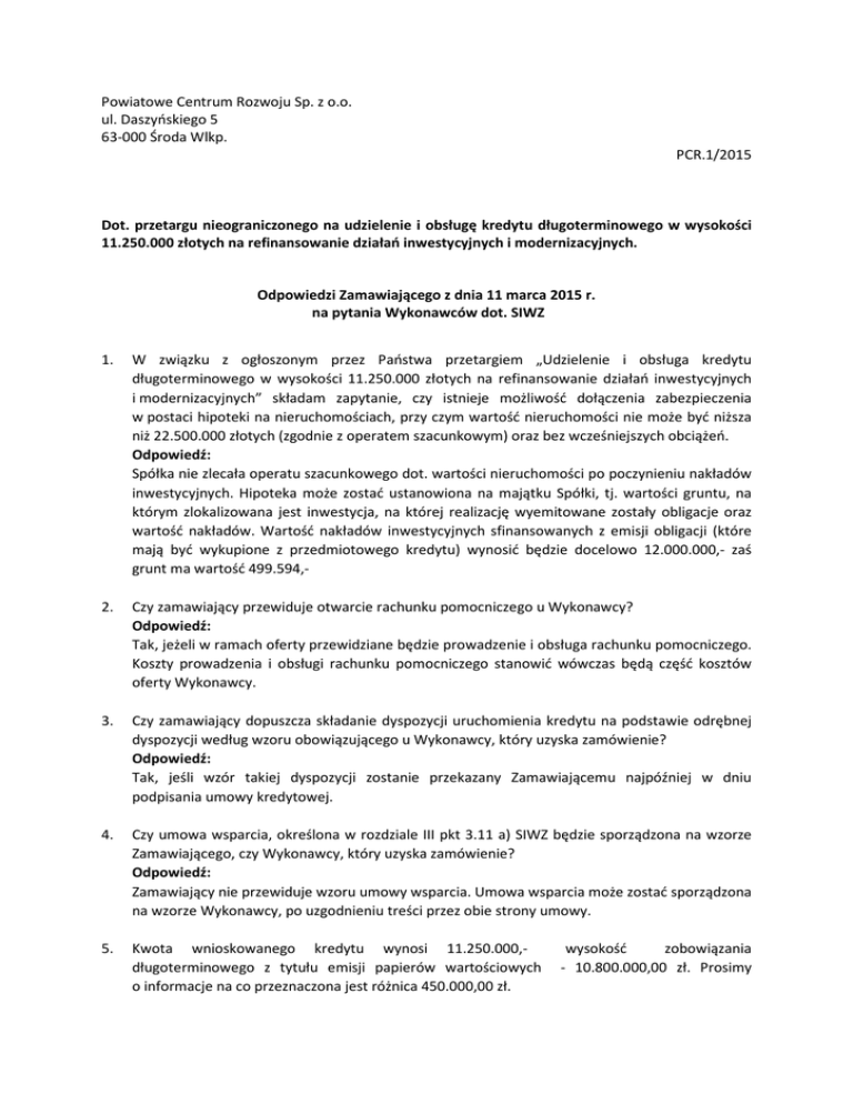 Powiatowe Centrum Rozwoju Sp. z o.o. ul. Daszyńskiego 5 63-000 Środa Wlkp. PCR.1/2015 Dot. przetargu nieograniczonego na udzielenie i obsługę kredytu długoterminowego w wysokości 11.250.000 złotych na refinansowanie działań inwestycyjnych i modernizacyjnych. Odpowiedzi Zamawiającego z dnia 11 marca 2015 r. na pytania Wykonawców dot. SIWZ 1. W związku z ogłoszonym przez Państwa przetargiem „Udzielenie i obsługa kredytu długoterminowego w wysokości 11.250.000 złotych na refinansowanie działań inwestycyjnych i modernizacyjnych” składam zapytanie, czy istnieje możliwość dołączenia zabezpieczenia w postaci hipoteki na nieruchomościach, przy czym wartość nieruchomości nie może być niższa niż 22.500.000 złotych (zgodnie z operatem szacunkowym) oraz bez wcześniejszych obciążeń. Odpowiedź: Spółka nie zlecała operatu szacunkowego dot. wartości nieruchomości po poczynieniu nakładów inwestycyjnych. Hipoteka może zostać ustanowiona na majątku Spółki, tj. wartości gruntu, na którym zlokalizowana jest inwestycja, na której realizację wyemitowane zostały obligacje oraz wartość nakładów. Wartość nakładów inwestycyjnych sfinansowanych z emisji obligacji (które mają być wykupione z przedmiotowego kredytu) wynosić będzie docelowo 12.000.000,- zaś grunt ma wartość 499.594,- 2. Czy zamawiający przewiduje otwarcie rachunku pomocniczego u Wykonawcy? Odpowiedź: Tak, jeżeli w ramach oferty przewidziane będzie prowadzenie i obsługa rachunku pomocniczego. Koszty prowadzenia i obsługi rachunku pomocniczego stanowić wówczas będą część kosztów oferty Wykonawcy. 3. Czy zamawiający dopuszcza składanie dyspozycji uruchomienia kredytu na podstawie odrębnej dyspozycji według wzoru obowiązującego u Wykonawcy, który uzyska zamówienie? Odpowiedź: Tak, jeśli wzór takiej dyspozycji zostanie przekazany Zamawiającemu najpóźniej w dniu podpisania umowy kredytowej. 4. Czy umowa wsparcia, określona w rozdziale III pkt 3.11 a) SIWZ będzie sporządzona na wzorze Zamawiającego, czy Wykonawcy, który uzyska zamówienie? Odpowiedź: Zamawiający nie przewiduje wzoru umowy wsparcia. Umowa wsparcia może zostać sporządzona na wzorze Wykonawcy, po uzgodnieniu treści przez obie strony umowy. 5. Kwota wnioskowanego kredytu wynosi 11.250.000,długoterminowego z tytułu emisji papierów wartościowych o informacje na co przeznaczona jest różnica 450.000,00 zł. wysokość zobowiązania - 10.800.000,00 zł. Prosimy Odpowiedź: Cała kwota kredytu przeznaczona jest na wykup obligacji. Na dzień dzisiejszy zobowiązanie z tytułu wyemitowanych obligacji wynosi 11.250.000,00 zł. 6. Prosimy o podanie terminu uruchomienia kredytu/ transz kredytu wraz z kwotami na potrzeby wyliczenia ceny oferty w celu umożliwienia porównywalności złożonych ofert. Odpowiedź: Wyłącznie na potrzeby wyliczenia ceny oferty należy przyjąć, że kredyt zostanie uruchomiony w jednej transzy w dniu 30 kwietnia 2015r. 7. Prosimy o uzupełnienie sprawozdania finansowego podpisanego przez osoby upoważnione do reprezentowania spółki. Odpowiedź: Zgodnie z zapisami SIWZ załączone sprawozdanie finansowe stanowi wstępne sprawozdanie finansowe na dzień 31.12.2014r. Termin do sporządzenia sprawozdania określony jest w odpowiednich przepisach jako 3 m-ce od dnia bilansowego, zatem w niniejszym przypadku termin sporządzenia sprawozdania to 31 marca 2015r. Tak jak wskazano w SIWZ sprawozdanie zostanie przedłożone przed podpisaniem umowy kredytowej (pkt 3.20 lit d i e SIWZ) 8. Prosimy o dostarczenie następujących dokumentów: 1) Oświadczenie - zgodnie z załączonym wzorem - Odpowiedź: zostanie złożone przed podpisaniem umowy kredytowej. 2) opinie z banków oraz instytucji finansowych, w których klient posiada rachunki Odpowiedź: Spółka nie występowała o opinie z banków oraz instytucji finansowych, 3) opinie z banków oraz instytucji finansowych, w których klient posiada zobowiązania – Odpowiedź: zostaną dostarczone przed podpisaniem umowy kredytowej, jeżeli Wykonawca, który uzyska zamówienie będzie wymagał takich opinii, 4) podstawowe informacje o działalności gospodarczej (wg wzoru) – Odpowiedź: w załączeniu. Druk w zakresie informacji o przychodach, dostawcach i odbiorcach, strukturze wiekowej należności i zobowiązań zostanie wypełniony przed podpisaniem umowy, w przypadku wystąpienia o te informacje przez wykonawcę, którego oferta została wybrana. 5) Uchwała lub postanowienie organu zatwierdzającego za rok 2013 o zatwierdzeniu rocznego sprawozdania finansowego oraz podziale zysku lub pokryciu straty 6) Uchwała lub postanowienie organu zatwierdzającego za rok 2013 o zatwierdzeniu sprawozdania z działalności jednostki i udzieleniu absolutorium członkom jej organów. Odpowiedź: ppkt. 5 i 6 Uchwały Zgromadzenia Wspólników Spółki Nr 4/2014, 5/2014, 6/2014, 7/2014, 8/2014, 9/2014 - w załączeniu. 7) Prognoza finansowa na okres kredytowania obejmujące: bilans, rachunek zysków i strat, rachunek przepływów pieniężnych w układzie rocznym oraz na koniec okresu kredytowania. 8) Główne założenia, na podstawie których została przygotowana prognoza finansowa na okres kredytowania. 9) Model finansowy w formie elektronicznej (w formie MS Exel) z zachowanymi formułami bez odniesień do arkuszy, które nie zostały przekazane do Banku. Odpowiedź: ppkt. 7, 8 i 9 - Na potrzeby niniejszego kredytu nie była sporządzana prognoza finansowa. 10) Sprawozdania Gminy Środa Wlkp.: Rb- 27S, Rb – 28S, Rb – NDS, Rb- N i Rb- Z za okres od początku roku do dnia 31 grudnia 2014r. – Odpowiedź: dostępne są na stronie bip Gminy Środa Wlkp. w zakładce sprawozdania z wykonania budżetu gminy 11) Sprawozdania Powiatu Średzkiego: Rb- 27S, Rb – 28S, Rb – NDS, Rb- N i Rb- Z za okres od początku roku do dnia 31 grudnia 2014r. – w załączeniu 9. Czy zgodnie z umową wsparcia środki przeznaczone na pokryci