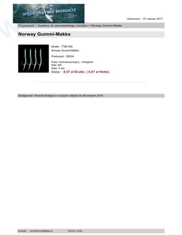 K D Ę W Przywieszki > Systemy do samodzielnego montażu > Norway Gummi-Makks Norway Gummi-Makks Model : 7766 008 Norway Gummi-Makks Producent : DEGA Kolor: luminescencyjny - hologram Hak: 8/0 Ilość: 4 szt. Cena : 8,57 zł Brutto ( 6,97 zł Netto) Dostępność: Produkt dostępny w naszym sklepie od 28 sierpień 2010 kontakt : - [email protected] Strona 1/{nb} Utworzono : 07 marzec 2017