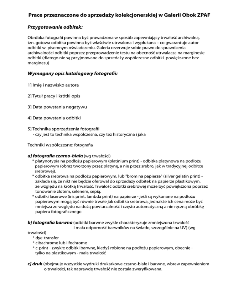 Prace przeznaczone do sprzedaży kolekcjonerskiej w Galerii Obok ZPAF Przygotowanie odbitek: Obróbka fotografii powinna być prowadzona w sposób zapewniający trwałość archiwalną, tzn. gotowa odbitka powinna być właściwie utrwalona i wypłukana – co gwarantuje autor odbitki w pisemnym oświadczeniu. Galeria rezerwuje sobie prawo do sprawdzenia archiwalności odbitki poprzez przeprowadzenie testu na obecność utrwalacza na marginesie odbitki (dlatego nie są przyjmowane do sprzedaży współczesne odbitki powiększone bez marginesu) Wymagany opis katalogowy fotografii: 1] Imię i nazwisko autora 2] Tytuł pracy i krótki opis 3] Data powstania negatywu 4] Data powstania odbitki 5] Technika sporządzenia fotografii - czy jest to technika współczesna, czy też historyczna i jaka Techniki współczesne: fotografia a] fotografia czarno-biała (wg trwałości) * platynotypia na podłożu papierowym (platinium print) - odbitka platynowa na podłożu papierowym (obraz tworzony przez platynę, a nie przez srebro, jak w tradycyjnej odbitce srebrowej). * odbitka srebrowa na podłożu papierowym, lub "brom na papierze" (silver gelatin print) zakłada się, że nikt nie będzie oferował do sprzedaży odbitek na papierze plastikowym, ze względu na krótką trwałość. Trwałość odbitki srebrowej może być powiększona poprzez tonowanie złotem, selenem, sepią. * odbitki laserowe (iris print, lambda print) na papierze - jeśli są wykonane na podłożu papierowym mogą być równie trwałe jak odbitka srebrowa, jednakże ich cena może być mniejsza ze względu na dużą powtarzalność i często automatyczną a nie ręczną obróbkę papieru fotograficznego b] fotografia barwna (odbitki barwne zwykle charakteryzuje zmniejszona trwałość i mała odporność barwników na światło, szczególnie na UV) (wg trwałości) * dye-transfer * cibachrome lub ilfochrome * c-print - zwykłe odbitki barwne, kiedyś robione na podłożu papierowym, obecnie tylko na plastikowym - mała trwałość c] druk (obejmuje wszystkie wydruki drukarkowe czarno-białe i barwne, wbrew zapewnieniom o trwałości, tak naprawdę trwałość nie została zweryfikowana. Techniki historyczne: dagerotypia, cyjanotypia, albumina itp. (historycznie, ze względu na krótki czas istnienia tej techniki ) 6] Kategoria odbitki Odbitki historyczne lub autorstwa twórców, którzy nie zajmują się w chwili obecnej fotografią: * Odbitka unikalna – (unique print) jedyna istniejąca fotografia bez negatywu (np. dagerotyp, kolaż, luksografia itp.) lub z negatywu, który zaginął lub został zniszczony. * Odbitka autorska wczesna - wykonana przez autora z oryginalnego negatywu, zaraz po powstaniu negatywu (vintage print). Zwykle jest to pierwsze powiększenie z negatywu. Sygnowana i datowana przez autora. * Odbitka autorska późna - wykonana przez autora fotografii z oryginalnego negatywu w późniejszym okresie po powstaniu negatywu (life time print). Powinna być oznaczona przez autora datą wykonania negatywu i datą wykonania powiększenia. * Odbitka nieautorska - wykonana nie przez autora fotografii z oryginalnego negatywu (reprint). Powinna być oznaczona datą wykonania negatywu i datą wykonania powiększenia oraz nazwą firmy lub nazwiskiem kopisty. * Reprodukcja oryginału - kopia odbitki oryginalnej (copy print). Powinna być oznaczona datą wykonania negatywu i datą wykonania odbitki, z której wykonano reprodukcję, datą wykonania reprodukcji oraz nazwą firmy kopiującej lub nazwiskiem kopisty. Odbitki twórców żyjących i aktywnych twórczo: * Odbitka współczesna (modern print) - wykonana przez autora fotografii z oryginalnego negatywu. Powinna być oznaczona przez autora datą wykonania negatywu i datą wykonania powiększenia. 7] Numer odbitki i wielkość nakładu - numer kolejny odbitki oraz wielkość nakładu (zwykle max. 25 szt.). Niektórzy za nakład uważają liczbę wszystkich odbitki z jednego negatywu niezależnie od formatów, inni z kolei numerują każdy format odbitki oddzielnie. 8] Pochodzenie (historia) odbitki - (kto był właścicielem, itp. - wpływa na wartość kolekcjonerską odbitki) 9] Stan techniczny odbitki - (uszkodzenia mechaniczne, uszkodzenia chemiczne - przebarwienia itp.) - awers i rewers 10] Rozmiar odbitki - wymiary zewnętrze i wymiary obrazu fotograficznego 11] Obecność odbitki w innych kolekcjach 12] Ranga autora – rola w historii fotografii itp. Warunki zachowania trwałości archiwalnej odbitek srebrowych na podłożu papierowym: * Fotografie nie mogą mieć żadnego kontaktu z substancjami chemicznymi takimi jak rozpuszczalniki, kleje, farby, związki siarki, agresywne płyny do mycia szyb, kwasy. * Fotografie muszą być przechowywane w ciemności, w niskiej temperaturze o umiarkowanej wilgotności, nie mogą być przechowywane w atmosferze kwaśnej lub zasiarczonej, nie mogą być przechowywane razem z malarstwem. * Fotografie nie mogą mieć bezpośredniego kontaktu z drewnem i wyrobami drewnopochodnymi, a w szczególności nie mogą być oprawiane w ramy o „plecach” z płyt spilśnionych lub sklejki. Fotografie powinny być oprawione w passe-partout z tektury bezkwasowej (najlepiej z atestem P.A.T. - Photography Archival Test) – awers i rewers. * Fotografie powinny być mocowane do passe-partout bez użycia kleju - wyłącznie za pośrednictwem bezkwasowych narożników fotograficznych lub taśmy bezkwasowej. * Fotografie powinny być eksponowane wyłącznie w oprawie, awers fotografii nie może dotykać szyby. * Maksymalne natężenie światła przy ekspozycji fotografii nie powinno przekraczać 350 luksów. * Fotografie mogą być sygnowanie wyłącznie ołówkiem grafitowym twardości F. * Wszelkie sygnatury piórem, długopisem lub stemple postawione na rewersie po pewnym czasie pojawiają się na awersie. * Należy unikać dotykania fotografii dłońmi bez rękawiczek. Niedotrzymanie wyżej wymienionych. warunków może spowodować zmian