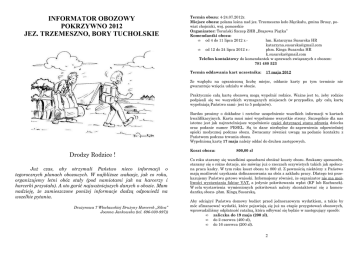 INFORMATOR OBOZOWY POKRZYWNO 2012 JEZ. TRZEMESZNO, BORY TUCHOLSKIE Termin obozu: 4-24.07.2012r. Miejsce obozu: polana leśna nad jez. Trzemeszno koło Męcikału, gmina Brusy, powiat chojnicki, woj. pomorskie Organizator: Toruński Szczep ZHR „Brązowa Piątka” Komendantki obozu: • od 4 do 11 lipca 2012 r.hm. Katarzyna Susarska HR [email protected] • od 12 do 24 lipca 2012 r.phm. Kinga Susarska HR [email protected] Telefon kontaktowy do komendantek w sprawach związanych z obozem: 781 488 523 Termin oddawania kart uczestnika: 17 maja 2012 Ze względu na ograniczoną liczbę miejsc, oddanie karty po tym terminie nie gwarantuje wzięcia udziału w obozie. Praktycznie całą kartę obozową mogą wypełnić rodzice. Ważne jest to, żeby rodzice podpisali się we wszystkich wymaganych miejscach (w przypadku, gdy całą kartę wypełniają Państwo sami- jest to 5 podpisów). Bardzo prosimy o dokładne i rzetelne uzupełnienie wszelkich informacji w kartach kwalifikacyjnych. Karta musi mieć wypełnione wszystkie strony. Szczególnie dla nas istotne jest jak najrzetelniejsze wypełnienie części dotyczącej stanu zdrowia dziecka oraz podanie numer PESEL. Są to dane niezbędne do zapewnienia odpowiedniej opieki medycznej podczas obozu. Zwracamy również uwagę na podanie kontaktu z Państwem podczas trwania obozu. Wypełnioną kartę 17 maja należy oddać do druhen zastępowych. Drodzy Rodzice ! Już czas, aby otrzymali Państwo nieco informacji o tegorocznych planach obozowych. W najbliższe wakacje, jak co roku, organizujemy letni obóz stały (pod namiotami jak na harcerzy i harcerki przystało). A oto garść najważniejszych danych o obozie. Mam nadzieję, że zamieszczone poniżej informacje dadzą odpowiedź na wszelkie pytania. Drużynowa 7 Włocławskiej Drużyny Harcerek „Silva” Joanna Jankowska (tel. 696-030-997)) Koszt obozu: 800,00 zł Co roku staramy się wszelkimi sposobami obniżać koszty obozu. Szukamy sponsorów, staramy się o różne dotacje, nie mówiąc już o rzeczach oczywistych takich jak społeczna praca kadry. W tym roku koszt obozu to 800 zł. Z pewnością niektórzy z Państwa mają możliwość uzyskania dofinansowania na obóz z zakładu pracy. Dlatego też przekazujemy Państwu gotowe wnioski. Informujemy również, że organizator nie ma możliwości wystawiania faktur VAT, a jedynie pokwitowania wpłat (KP lub Rachunek). W celu wystawienia wymienionych pokwitowań należy skontaktować się z komendantką obozu- phm. Kingą Susarską. Aby odciążyć Państwa domowy budżet przed jednorazowym wydatkiem, a także by móc sfinansować wydatki, które pojawiają się już na etapie przygotowań obozowych, wprowadziliśmy odpłatność ratalną, która odbywać się będzie w następujący sposób: • zaliczka do 19 maja (200 zł), • do 2 czerwca (400 zł), • do 16 czerwca (200 zł). 2 Oczywiście istnieje także możliwość dokonania jednej, całościowej wpłaty. Rachunek odbiorcy: 91 1140 2004 0000 3102 7339 5019 Nazwa odbiorcy: Toruński Szczep ZHR „Brązowa Piątka” (ul. Warneńczyka 4/57, 87-100 Toruń) Tytuł przelewu: składka program. OBOZ 2012, Silva, imię i nazwisko uczestnika (przykład: OBOZ 2012, Silva, Anna Kowalska). Kto jedzie? W obozie weźmie udział 8 drużyn ze środowiska włocławskiego, toruńskiego i konińskiego. Dla dużej części harcerek i harcerzy będzie to pierwszy obóz. Na obóz pojadą drużyny harcerek: 7 Włocławska Drużyna Harcerek „Silva” 5 Lubicka Drużyna Harcerek „Grań 5 Toruńska Drużyna Harcerek „Wetlina” 5 Toruńska Drużyna Harcerek „Połoniny” im. Olgi DrahonowskiejMałkowskiej 5 próbna Toruńska Drużyna Harcerzy im. Andrzeja Małkowskiego 10 Bydgoska Drużyna Harcerzy „Zjawa” im. Józefa Grzesiaka „Czarnego” 77 Konińska Drużyna Harcerzy „Wataha” 3 Męska Drużyna Harcerska „Nietykalni” w Koninie O obozie: Nasz obóz będzie tradycyjnym obozem harcerskim. Co to znaczy? Mieszkać będziemy w namiotach (po 5-7 osób). Każdy zastęp osobno. Spać będziemy na pryczach (łóżkach zbudowanych własnoręcznie przez harcerki i harcerzy. W namiotach zastępy będą budować sobie półki, wieszaki i inne potrzebne „umeblowanie”. Harcerze i harcerki będą zaangażowani nie tylko w prace programowe obozu, ale i w pomoc w funkcjonowaniu całego obozu (warty, służba w kuchni). Obóz składał się będzie z kilku podobozów ustawionych w oddzielne kręgi. Spełnione będą oczywiście wszelkie wymagania stawiane przez prawo oraz przepisy ZHR (zgody sanepidu, straży pożarnej, wpis do ewidencji placówek wypoczynku w Kuratorium Oświaty itd.) Na obóz jadą z nami osoby odpowiedzialne za kuchnię i zaopatrzenie, ratownik WOPR oraz wykwalifikowana kadra wychowawcza. 3 Mały poradnik przydatnych przedmiotów: UBRANIA: - MUNDUR (standardowo: bluza, spódnica, getry i wywijki, kapelusz, pas + wieszak) – co do szczegółów polecamy kontakt z zastępowymi - dres (do spania), sweter, ciepła bluza, - deszczówka (najlepiej typu kangurka lub pałatka, podgumowana), - bluzki, koszula, bielizna, skarpety (w tym również ciepłe), - długie spodnie (min. 2 pary), krótkie spodnie (min. 2 pary), - strój kąpielowy/kąpielówki, - buty (2-3 pary), w tym turystyczne (np. wojskowe) i sportowe, - czapka z daszkiem albo chusta na głowę (na upały), - strój fabularny (celtycki- najlepiej długa suknia lniana- polecamy sklepy tzw. second-handy :) - czasami przydaje się jakaś ładniejsza letnia sukienka np. na dzień odwiedzin rodziców :) ŚRODKI HIGIENICZNE: - ręczniki (min. dwa: kąpielowy i do mycia), - pasta + szczoteczka do zębów, mydło, szampon, - środek na komary, - inne „gadżety” kosmetyczne, - proszek do prania (o ile przewiduje się pranie), - przydatne są chusteczki nawilżające INNE: - ŚPIWÓR, - prześcieradło (obowiązkowe) - MENAŻKA + kubek + niezbędnik (lub łyżka i widelec), - legitymacja szkolna (ważna i podstemplowana) - lata