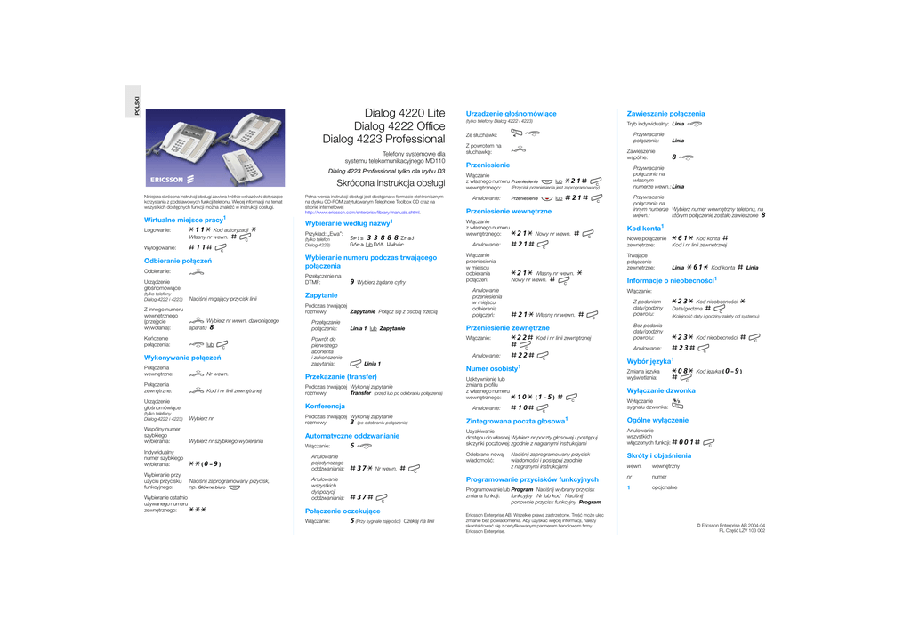POLSKI Dialog 4220 Lite Dialog 4222 Office Dialog 4223 Professional Telefony systemowe dla systemu telekomunikacyjnego MD110 Dialog 4223 Professional tylko dla trybu D3 ? Skrócona instrukcja obsługi Niniejsza skrócona instrukcji obsługi zawiera krótkie wskazówki dotyczące korzystania z podstawowych funkcji telefonu. Więcej informacji na temat wszystkich dostępnych funkcji można znaleźć w instrukcji obsługi. Wirtualne miejsce pracy1 Logowanie: Wylogowanie: *11* # í* #11# í Kod autoryzacji Własny nr wewn. Odbieranie połączeń Odbieranie: Urządzenie głośnomówiące: (tylko telefony Dialog 4222 i 4223) Z innego numeru wewnętrznego (przejęcie wywołania): Kończenie połączenia: u 8 Powrót do pierwszego abonenta i zakończenie zapytania: í Nr wewn. Połączenia zewnętrzne: u Kod i nr linii zewnętrznej Wybieranie ostatnio używanego numeru zewnętrznego: Wybierz nr Wybierz nr szybkiego wybierania ** 0 9 – Linia 1 lub Zapytanie Ô Zawieszanie połączenia (tylko telefony Dialog 4222 i 4223) Tryb indywidualny: Linia Ze słuchawki: Âd Z powrotem na słuchawkę: u Anulowanie: Anulowanie: Włączanie przeniesienia w miejscu odbierania połączeń: Anulowanie przeniesienia w miejscu odbierania połączeń: *21# í #21# í ÕÔ lub *21* #21# í #í *21* * Nowy nr wewn. #í Własny nr wewn. Nowy nr wewn. #21* Własny nr wewn. Przeniesienie zewnętrzne Anulowanie: Linia 1 Przeniesienie Przeniesienie wewnętrzne Włączanie z własnego numeru wewnętrznego: Anulowanie: 3 Przywracanie połączenia na innym numerze Wybierz numer wewnętrzny telefonu, na wewn.: którym połączenie zostało zawieszone Kod 8 konta1 Nowe połączenie zewnętrzne: *61* Trwające połączenie zewnętrzne: Linia Informacje o *# 2 2 # í #22# í Bez podania daty/godziny powrotu: Kod i nr linii zewnętrznej Anulowanie: *10* 1 5 # í #10# í – ) *23* #23# í #í (Kolejność daty i godziny zależy od systemu) Kod nieobecności *# 0í 8* Wyłączanie sygnału dzwonka: Anulowanie wszystkich włączonych funkcji: Odebrano nową wiadomość: Skróty i objaśnienia Anulowanie wszystkich dyspozycji oddzwaniania: Nr wewn. #í #37# í Połączenie oczekujące Włączanie: 5 (Przy sygnale zajętości) Czekaj na linii – ) #001# í wewn. wewnętrzny Programowanie przycisków funkcyjnych nr numer Programowanie lub Program Naciśnij wybrany przycisk zmiana funkcji: funkcyjny Nr lub kod Naciśnij ponownie przycisk funkcyjny Program 1 opcjonalne Ericsson Enterprise AB. Wszelkie prawa zastrzeżone. Treść może ulec zmianie bez powiadomienia. Aby uzyskać więcej informacji, należy skontaktować się z certyfikowanym partnerem handlowym firmy Ericsson Enterprise. 0 9 É Automatyczne oddzwanianie #37* Kod języka ( Wyłączanie dzwonka Ogólne wyłączenie Naciśnij zaprogramowany przycisk wiadomości i postępuj zgodnie z nagranymi instrukcjami Linia * Kod nieobecności Data/godzina Uzyskiwanie dostępu do własnej Wybierz nr poczty głosowej i postępuj skrzynki pocztowej: zgodnie z nagranymi instrukcjami 6d # *23* # í Zintegrowana poczta głosowa1 Włączanie: Kod konta Wybór języka1 Zmiana języka wyświetlania: ( *61* nieobecności1 Z podaniem daty/godziny powrotu: #í # Kod konta Kod i nr linii zewnętrznej Włączanie: Numer osobisty1 Uaktywnienie lub zmiana profilu z własnego numeru wewnętrznego: 8d Przywracanie połączenia na własnym numerze wewn.: Linia Włączanie lub z własnego numeru Przeniesienie (Przycisk przeniesienia jest zaprogramowany) wewnętrznego: Ô d Linia Zawieszenie wspólne: Przeniesienie Włączanie: í Przywracanie połączenia: Podczas trwającej Wykonaj zapytanie (po odebraniu połączenia) rozmowy: Anulowanie pojedynczego oddzwaniania: ) Naciśnij zaprogramowany przycisk, np. Główne biuro *** Wybierz żądane cyfry Podczas trwającej Wykonaj zapytanie rozmowy: Transfer (przed lub po odebraniu połączenia) Konferencja ( 9 Przekazanie (transfer) Urządzenie głośnomówiące: Wybieranie przy użyciu przycisku funkcyjnego: Zapytanie d lub 33888 Znaj Spis GÓra lub DÓt WybÓr Wybieranie numeru podczas trwającego połączenia Przełączanie połączenia: u Indywidualny numer szybkiego wybierania: (tylko telefon Dialog 4223) Wybierz nr wewn. dzwoniącego aparatu Połączenia wewnętrzne: Wspólny numer szybkiego wybierania: Przykład: „Ewa”: nazwy1 Podczas trwającej rozmowy: Zapytanie Połącz się z osobą trzecią Wykonywanie połączeń (tylko telefony Dialog 4222 i 4223) Wybieranie według Przełączenie na DTMF: Naciśnij migający przycisk linii u Pełna wersja instrukcji obsługi jest dostępna w formacie elektronicznym na dysku CD-ROM zatytułowanym Telephone Toolbox CD oraz na stronie internetowej http://www.ericsson.com/enterprise/library/manuals.shtml. Urządzenie głośnomówiące © Ericsson Enterprise AB 2004-04 PL Część LZV 103 002