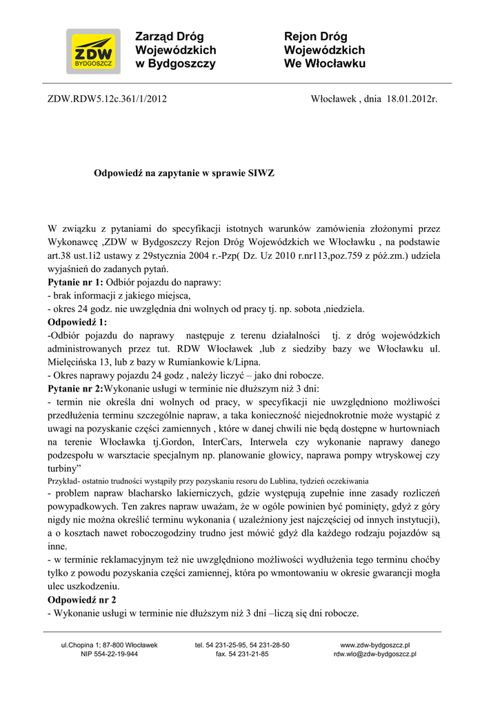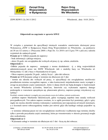Zarząd Dróg Wojewódzkich w Bydgoszczy Rejon Dróg Wojewódzkich We Włocławku Włocławek , dnia 18.01.2012r. ZDW.RDW5.12c.361/1/2012 Odpowiedź na zapytanie w sprawie SIWZ W związku z pytaniami do specyfikacji istotnych warunków zamówienia złożonymi przez Wykonawcę ,ZDW w Bydgoszczy Rejon Dróg Wojewódzkich we Włocławku , na podstawie art.38 ust.1i2 ustawy z 29stycznia 2004 r.-Pzp( Dz. Uz 2010 r.nr113,poz.759 z póź.zm.) udziela wyjaśnień do zadanych pytań. Pytanie nr 1: Odbiór pojazdu do naprawy: - brak informacji z jakiego miejsca, - okres 24 godz. nie uwzględnia dni wolnych od pracy tj. np. sobota ,niedziela. Odpowiedź 1: -Odbiór pojazdu do naprawy następuje z terenu działalności tj. z dróg wojewódzkich administrowanych przez tut. RDW Włocławek ,lub z siedziby bazy we Włocławku ul. Mielęcińska 13, lub z bazy w Rumiankowie k/Lipna. - Okres naprawy pojazdu 24 godz , należy liczyć – jako dni robocze. Pytanie nr 2:Wykonanie usługi w terminie nie dłuższym niż 3 dni: - termin nie określa dni wolnych od pracy, w specyfikacji nie uwzględniono możliwości przedłużenia terminu szczególnie napraw, a taka konieczność niejednokrotnie może wystąpić z uwagi na pozyskanie części zamiennych , które w danej chwili nie będą dostępne w hurtowniach na terenie Włocławka tj.Gordon, InterCars, Interwela czy wykonanie naprawy danego podzespołu w warsztacie specjalnym np. planowanie głowicy, naprawa pompy wtryskowej czy turbiny” Przykład- ostatnio trudności wystąpiły przy pozyskaniu resoru do Lublina, tydzień oczekiwania - problem napraw blacharsko lakierniczych, gdzie występują zupełnie inne zasady rozliczeń powypadkowych. Ten zakres napraw uważam, że w ogóle powinien być pominięty, gdyż z góry nigdy nie można określić terminu wykonania ( uzależniony jest najczęściej od innych instytucji), a o kosztach nawet roboczogodziny trudno jest mówić gdyż dla każdego rodzaju pojazdów są inne. - w terminie reklamacyjnym też nie uwzględniono możliwości wydłużenia tego terminu choćby tylko z powodu pozyskania części zamiennej, która po wmontowaniu w okresie gwarancji mogła ulec uszkodzeniu. Odpowiedź nr 2 - Wykonanie usługi w terminie nie dłuższym niż 3 dni –liczą się dni robocze. ul.Chopina 1; 87-800 Włocławek NIP 554-22-19-944 tel. 54 231-25-95, 54 231-28-50 fax. 54 231-21-85 www.zdw-bydgoszcz.pl [email protected] - W przypadku trudności w pozyskiwaniu części Zamawiający nie uwzględnił przedłużenia terminu szczególnych napraw z uwagi na to, iż uważamy ,że w obecnych czasach ,dostępność w pozyskiwaniu części zamiennych jest bardzo ułatwiona i bezproblemowa, - Problem napraw blacharsko – lakierniczych - dotyczy wyłącznie drobnych napraw blacharskich i lakierniczych z wyłączeniem tzw powypadkowych. - Termin reklamacyjny ,również Zamawiający nie widzi potrzeby wydłużenia terminu napraw . Pytanie 3 : Bardzo ogólnikowo omówiono sprawę części zamiennych. W innych instytucjach sprawa ta traktowana jest w formie upustów czy rabatów np.20% od cen detalicznych w głównych hurtowniach. Uważamy ,że ta forma byłaby dla państwa bardziej ekonomicznie uzasadniona. Forma zaproponowana zmusza nas pod daną naprawę kupować oddzielnie towar ,aby móc go następnie refakturować. Odpowiedź 3 Zgodnie z Istotnymi Postanowieniami Umowy § 4 ust.4 Wykonawca zobowiązany jest dołączyć do faktury za usługę kopię faktury za wmontowane części i materiały potrzebne do naprawy danego pojazdu i może to być również kopia faktury z hurtowni w której Państwo wcześniej się zaopatrywaliście i uważamy że nie koniecznie musicie kupować oddzielnie pod daną naprawę daną część , gdyż na pewno w Państwa firmie prowadzona jest gospodarka magazynowa części, gdzie materiały (części) przyjmowane są na magazyn i wydawane są do naprawy zgodnie z Waszą ceną. System rozliczeniowy przedstawiony w IPU § 4 ust.4 działa w tut RDW od wielu lat i jest sprawdzony. Niniejsze pismo stanowi integralną część Specyfikacji Istotnych Warunków Zamówienia Termin składania i otwarcia ofert pozostaje bez zmian. Podpisał Kierownik RDW inż. Sławomir Woźniak Kontakt w sprawach merytorycznych: Stefan Wysocki,Tel.54 231-25-95 wew.33 Sprawę prowadzi: Starszy Specjalista w RDW Włocławek Teresa Krzeszewska Tel.54231-25-95 wew.34 Email:[email protected] ul. Chopina 1 87-800 Włocławek NIP 554-22-19-944 tel. 54-231-25-95 ,54 231-28-50 fax. 54-231-21-85 www.zdw-bydgoszcz.pl [email protected]