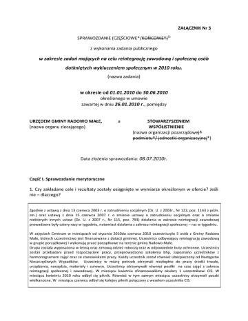 ZAŁĄCZNIK Nr 3 SPRAWOZDANIE (CZĘŚCIOWE*/KOOCOWE*)1) z wykonania zadania publicznego w zakresie zadao mających na celu reintegrację zawodową i społeczną osób dotkniętych wykluczeniem społecznym w 2010 roku. (nazwa zadania) w okresie od 01.01.2010 do 30.06.2010 określonego w umowie zawartej w dniu 26.01.2010 r., pomiędzy URZĘDEM GMINY RADOWO MAŁE, (nazwa organu zlecającego) a STOWARZYSZENIEM WSPÓŁISTNIENIE (nazwa organizacji pozarządowej* podmiotu*/ jednostki organizacyjnej*) Data złożenia sprawozdania: 08.07.2010r. Część I. Sprawozdanie merytoryczne 1. Czy zakładane cele i rezultaty zostały osiągnięte w wymiarze określonym w ofercie? Jeśli nie – dlaczego? Zgodnie z ustawą z dnia 13 czerwca 2003 r. o zatrudnieniu socjalnym (Dz. U. z 2003r., Nr 122, poz. 1143 z późn. zm.) oraz ustawą z dnia 15 czerwca 2007 r. o zmianie ustawy o zatrudnieniu socjalnym oraz o zmianie niektórych innych ustaw (Dz. U. z 2007 r., Nr 115, poz. 793) działania w zakresie reintegracji zawodowej prowadzone były cztery razy w tygodniu, natomiast działania z zakresu reintegracji społecznej – raz w tygodniu. W zajęciach Centrum w miesiącach od stycznia 2010do czerwca 2010 uczestniczyło 5 osób z Gminy Radowo Małe, których uczestnictwo jest finansowane z dotacji gminnej. Uczestnicy odbywający reintegrację zawodową w grupie porządkowej i wykonują prace porządkowe na terenie gminy Radowo Małe. Grupa została wyposażona w letnią oraz zimową odzież roboczą oraz w odpowiednie buty ochronne. Uczestnicy zostali przebadani przed rozpoczęciem pracy, przeprowadzono szkolenia bhp, zapoznano uczestników z harmonogramem zajęd oraz ze stanowiskami pracy. Każdy uczestnik został również ubezpieczony od Następstw Nieszczęśliwych Wypadków. Uczestnicy w miarę potrzeb otrzymali niezbędne do pracy środki trwałe, urządzenia, narzędzia, materiały i surowce. Uczestnicy otrzymywali również posiłki na czas zajęd z zakresu reintegracji społecznej i zawodowej. W miesiącu kwietniu sfinansowaliśmy okulary 1 uczestnikowi CIS. W miesiącu kwietniu 2010 roku odbył się piknik. Również w tym samym miesiącu uczestnicy otrzymali paczki wielkanocne. W miesiącu czerwcu odbył się kolejny piknik połączony z weselem uczestnika CIS. 2. Opis wykonania zadania z wyszczególnieniem działao partnerów i podwykonawców2) Partnerami przy realizacji zadania są: - Powiatowy Urząd Pracy w Łobzie – zabezpieczenie środków z Funduszu Pracy na świadczenia integracyjne, - Starostwo Powiatowe w Łobzie – współpraca w zakresie promocji działao i osiągnięd CIS, - Urząd Miejski w Radowie Małym – udostępnienie pomieszczeo na realizację zadao z zakresu reintegracji społecznej - Powiatowe Centrum Pomocy Rodzinie w Łobzie – współpraca dotycząca działao w zakresie udzielania pomocy socjalnej uczestnikom; ścisła współpraca z pracownikiem socjalnym CIS na rzecz odzyskania władzy rodzicielskiej nad swoimi dziedmi przez uczestników wymagających takiej pomocy; poradnictwo specjalistów, którego nie obejmuje zakres „usług” świadczonych przez specjalistów zatrudnionych w CIS, - gminy Powiatu Łobeskiego: Łobez, Dobra, Resko, Radowo Małe, Węgorzyno – zabezpieczenie środków finansowych na bieżącą działalnośd CIS, - Ośrodki Pomocy Społecznej – pomoc w rekrutacji i selekcji uczestników, bieżąca współpraca dotycząca działao socjalnych na rzecz uczestników CIS i ich rodzin, - Przedsiębiorcy i firmy prywatne – współpraca przy organizacji zadao z zakresu reintegracji zawodowej 3. Liczbowe określenie skali działao, zrealizowanych w ramach zadania, /należy użyd tych samych miar, które były zapisane w ofercie realizacji zadania, w części II pkt 5/. Centrum Integracji Społecznej „Od Nowa” w Łobzie w okresie od 01 stycznia 2010 r. do 30 czerwca 2010 r. swoimi działaniami obejmowało 5 osób, z których uczestnictwo pięciu jest dofinansowane przez Gminę Radowo Małe. Główną przyczyną skierowao do uczestnictwa w zajęciach Centrum Integracji Społecznej „Od Nowa” było długotrwałe bezrobocie oraz zagrożenie wykluczeniem społecznym. Działania mające na celu reintegrację społeczną prowadzone były w Centrum Integracji Społecznej raz w tygodniu, natomiast działania z zakresu reintegracji zawodowej przez cztery dni w tygodniu. W ramach reintegracji społecznej uczestnicy biorą udział w zajęciach prowadzonych przez: - psychologa; - terapeutę uzależnieo; - doradcę społecznego; - doradcę zawodowego - pracownika socjalnego. Zajęcia prowadzone są w formie wykładów, warsztatów i wolnej dyskusji. Oprócz zajęd grupowych uczestnicy korzystają z indywidualnych spotkao z każdym ze specjalistów. Specjaliści zrealizowali wobec uczestników następujące zagadnienia: W miesiącu styczniu 2010 roku: TERAPEUTA UZALEŻNIEO: - proces mediacyjny – spotkania indywidualne z uczestnikami, - warsztaty pt.: „Poznajmy siebie i swoje zasoby”, DORADCA SPOŁECZNY: - warsztaty dot. komunikacji interpersonalnej – częśd I. /k. werbalna, k. niewerbalna, poziomy komunikacji, strefy przestrzeni. PSYCHOLOG: - zajęcia na temat aktywności życiowej człowieka /potrzeby człowieka, wzmacnianie motywacji/, - konsultacje indywidualne z uczestnikami. PRACOWNIK SOCJALNY: - wizyta w miejscu zamieszkania uczestników, - pomoc w rozliczeniu z Urzędem Skarbowym, - rozwiązywanie bieżących problemów uczestników wraz ze specjalistami ds. reintegracji społecznej, - stały kontakt z OPS-em, - organizacja zajęd z reintegracji społecznej. W miesiącu lutym 2010 roku: DORADCA SPOŁECZNY: - warsztaty „aktywnego słuchania” w komunikacji interpersonalnej. PSYCHOLOG: - zajęcia na temat rozwoju choroby alkoholowej /współuzależnienie, interwencja/, - konsultacje indywidualne z uczestnikami. PRACOWNIK SOCJALNY: - wizyty w miejscu zamieszkania, - pomoc w rozliczeniu z Urzędem Skarbowym, - konsultacje indywidualne z uczest