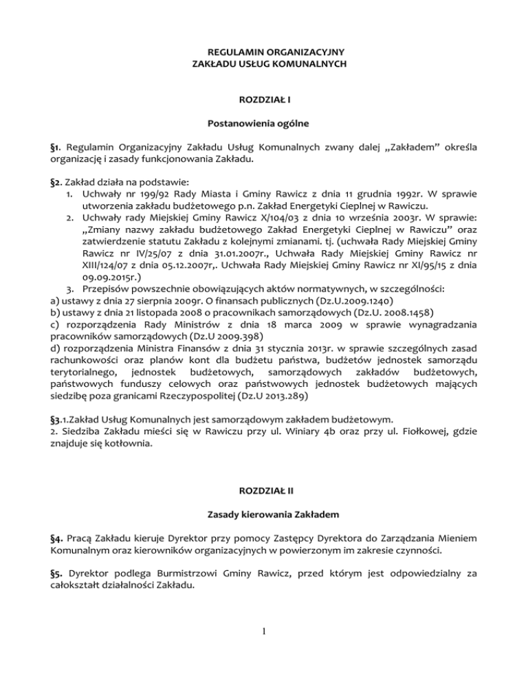 REGULAMIN ORGANIZACYJNY ZAKŁADU USŁUG KOMUNALNYCH ROZDZIAŁ I Postanowienia ogólne §1. Regulamin Organizacyjny Zakładu Usług Komunalnych zwany dalej „Zakładem” określa organizację i zasady funkcjonowania Zakładu. §2. Zakład działa na podstawie: 1. Uchwały nr 199/92 Rady Miasta i Gminy Rawicz z dnia 11 grudnia 1992r. W sprawie utworzenia zakładu budżetowego p.n. Zakład Energetyki Cieplnej w Rawiczu. 2. Uchwały rady Miejskiej Gminy Rawicz X/104/03 z dnia 10 września 2003r. W sprawie: „Zmiany nazwy zakładu budżetowego Zakład Energetyki Cieplnej w Rawiczu” oraz zatwierdzenie statutu Zakładu z kolejnymi zmianami. tj. (uchwała Rady Miejskiej Gminy Rawicz nr IV/25/07 z dnia 31.01.2007r., Uchwała Rady Miejskiej Gminy Rawicz nr XIII/124/07 z dnia 05.12.2007r,. Uchwała Rady Miejskiej Gminy Rawicz nr XI/95/15 z dnia 09.09.2015r.) 3. Przepisów powszechnie obowiązujących aktów normatywnych, w szczególności: a) ustawy z dnia 27 sierpnia 2009r. O finansach publicznych (Dz.U.2009.1240) b) ustawy z dnia 21 listopada 2008 o pracownikach samorządowych (Dz.U. 2008.1458) c) rozporządzenia Rady Ministrów z dnia 18 marca 2009 w sprawie wynagradzania pracowników samorządowych (Dz.U 2009.398) d) rozporządzenia Ministra Finansów z dnia 31 stycznia 2013r. w sprawie szczególnych zasad rachunkowości oraz planów kont dla budżetu państwa, budżetów jednostek samorządu terytorialnego, jednostek budżetowych, samorządowych zakładów budżetowych, państwowych funduszy celowych oraz państwowych jednostek budżetowych mających siedzibę poza granicami Rzeczypospolitej (Dz.U 2013.289) §3.1.Zakład Usług Komunalnych jest samorządowym zakładem budżetowym. 2. Siedziba Zakładu mieści się w Rawiczu przy ul. Winiary 4b oraz przy ul. Fiołkowej, gdzie znajduje się kotłownia. ROZDZIAŁ II Zasady kierowania Zakładem §4. Pracą Zakładu kieruje Dyrektor przy pomocy Zastępcy Dyrektora do Zarządzania Mieniem Komunalnym oraz kierowników organizacyjnych w powierzonym im zakresie czynności. §5. Dyrektor podlega Burmistrzowi Gminy Rawicz, przed którym jest odpowiedzialny za całokształt działalności Zakładu. 1 §6. Do zakresu działania Dyrektora należy: 1. reprezentowanie Zakładu na zewnątrz. 2. Wydawanie wewnętrznych aktów prawnych, których projekty sporządzają kierownicy oraz inspektor ds organizacyjno-prawnych. 3. Określenie organizacji Zakładu w formie regulaminu. 4. Opracowywanie planów i harmonogramów pracy Zakładu oraz przekazywanie sprawozdań z ich wykonywania Burmistrzowi Gminy Rawicz. 5. Realizacja budżetu Zakładu. 6. Przedkładanie Burmistrzowi Gminy Rawicz bieżących informacji na temat sytuacji finansowej Zakładu. 7. Zawieranie umów cywilnoprawnych. 8. Nadzorowanie realizacji zadań remontowych i zakupów inwestycyjnych. 9. Ustalanie zadań dla komórek organizacyjnych oraz kontrola ich przy pomocy Zastępcy, Głównego Księgowego i Kierowników. 10. Rozstrzyganie sporów pomiędzy komórkami organizacyjnymi oraz koordynacja ich działalności dla uzyskania pełnej realizacji zadań i osiągnięcia właściwych wskaźników techniczno - ekonomicznych. 11. Zapewnienie sprawnej organizacji Zakładu i racjonalnej gospodarki zarządzanymi środkami. §7. W razie nieobecności Dyrektora Zakładem zarządza Zastępca Dyrektora do Zarządzania Mieniem Komunalnym. §8.1. Poszczególnymi działami zarządzają kierownicy, którzy ponoszą odpowiedzialność za prawidłową, zgodną z prawem i rzetelną realizację zadań działu. 2. W przypadku nieobecności kierownika jego obowiązki przejmuje wyznaczony przez niego pracownik. 3. Do szczególnych obowiązków i uprawnień kierowników i samodzielnych stanowisk pracy należy: a) przestrzeganie obowiązujących przepisów prawnych, zarządzeń, regulaminów i instrukcji w kierowanym dziale, b) przyjmowanie wpływających do działu akt, pism, dokumentów, faktur, c) terminowe i zgodne pod względem formalnym i rzeczowym wykonywanie wszystkich prac wynikających z zakresu czynności pracowników działu, d) organizowanie pracy w podległych komórkach oraz nadzór nad wykonywaniem zadań podległych pracowników, e) ocenianie pracowników, f) opiniowanie kandydatów do pracy, h) organizowanie pracy w podległych komórkach oraz nadzór nad wykonywaniem zadań podległych pracowników, i) przestrzeganie dyscypliny finansowej w podejmowanych decyzjach, j) dbanie o dobro i wizerunek Zakładu, k) sporządzanie sprawozdań merytoryczno-finansowych 2 ROZDZIAŁ III Struktura organizacyjna §9. Wzajemne powiązania Działów przedstawia schemat organizacyjny ZUK stanowiący załącznik nr 1 do regulaminu organizacyjnego. §10. W strukturze organizacyjnej Zakładu wyodrębnia się następujące Działy i samodzielne stanowiska pracy: 1. Dział ekonomiczn0- księgowy (DEK). 2. Dział zieleni miejskiej i oczyszczania miasta (DziOM). 3. Dział gospodarki mieszkaniowej (DGM). 4. Dział energetyki cieplnej (DEC). 5. Dział targowiska miejskiego (DTM). 6. Inspektor ds kadr. 7. Inspektor ds organizacyjno - prawnych. 8. Radca Prawny (usługi w ramach outsourcingu). §11. Zakres czynności dla Zastępcy Dyrektora do Zarządzania Mieniem Komunalnym, Głównego Księgowego, Kierowników poszczególnych działów oraz pracowników na samodzielnych stanowiskach ustala Dyrektor. §12. Zakres czynności dla podległych pracowników ustala Kierownik Działu w porozumieniu z Dyrektorem Zakładu lub Zastępcą. §13. Zakład może realizować zadania poprzez powierzenie ich wykonania innym podmiotom i osobom na podstawie zawartych umów. §14. W Zakładzie tworzy się następujące stanowiska kierownicze i samodzielne stanowiska: 1. Zastępca Dyrektora ds Zarządzania Mieniem Komunalnym. 2. Główny Księgowy. 3. Kierownik Działu Ekonomiczn0-Księgowego. 4. Kierownik Działu Zieleni Miejskiej i Oczyszczania Miasta. 5. Kierownik Działu Gospodarki Mieszkaniowej. 6. Kierownik Działu Energetyki Cieplnej. 7. Inspekt