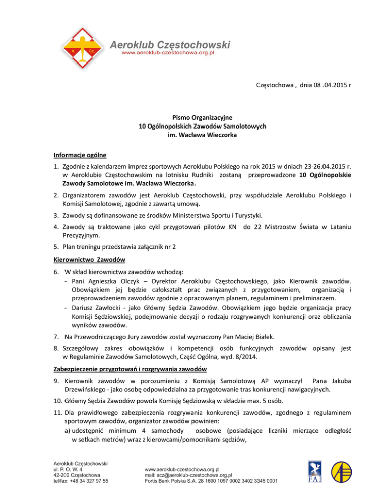 Częstochowa , dnia 08 .04.2015 r Pismo Organizacyjne 10 Ogólnopolskich Zawodów Samolotowych im. Wacława Wieczorka Informacje ogólne 1. Zgodnie z kalendarzem imprez sportowych Aeroklubu Polskiego na rok 2015 w dniach 23-26.04.2015 r. w Aeroklubie Częstochowskim na lotnisku Rudniki zostaną przeprowadzone 10 Ogólnopolskie Zawody Samolotowe im. Wacława Wieczorka. 2. Organizatorem zawodów jest Aeroklub Częstochowski, przy współudziale Aeroklubu Polskiego i Komisji Samolotowej, zgodnie z zawartą umową. 3. Zawody są dofinansowane ze środków Ministerstwa Sportu i Turystyki. 4. Zawody są traktowane jako cykl przygotowań pilotów KN do 22 Mistrzostw Świata w Lataniu Precyzyjnym. 5. Plan treningu przedstawia załącznik nr 2 Kierownictwo Zawodów 6. W skład kierownictwa zawodów wchodzą: - Pani Agnieszka Olczyk – Dyrektor Aeroklubu Częstochowskiego, jako Kierownik zawodów. Obowiązkiem jej będzie całokształt prac związanych z przygotowaniem, organizacją i przeprowadzeniem zawodów zgodnie z opracowanym planem, regulaminem i preliminarzem. - Dariusz Zawłocki - jako Główny Sędzia Zawodów. Obowiązkiem jego będzie organizacja pracy Komisji Sędziowskiej, podejmowanie decyzji o rodzaju rozgrywanych konkurencji oraz obliczania wyników zawodów. 7. Na Przewodniczącego Jury zawodów został wyznaczony Pan Maciej Białek. 8. Szczegółowy zakres obowiązków i kompetencji osób funkcyjnych zawodów opisany jest w Regulaminie Zawodów Samolotowych, Część Ogólna, wyd. 8/2014. Zabezpieczenie przygotowań i rozgrywania zawodów 9. Kierownik zawodów w porozumieniu z Komisją Samolotową AP wyznaczył Pana Jakuba Drzewińskiego - jako osobę odpowiedzialna za przygotowanie tras konkurencji nawigacyjnych. 10. Główny Sędzia Zawodów powoła Komisję Sędziowską w składzie max. 5 osób. 11. Dla prawidłowego zabezpieczenia rozgrywania konkurencji zawodów, zgodnego z regulaminem sportowym zawodów, organizator zawodów powinien: a) udostępnić minimum 4 samochody osobowe (posiadające liczniki mierzące odległość w setkach metrów) wraz z kierowcami/pomocnikami sędziów, b) udostępnić jeden samolot do oblotu kontrolnego tras nawigacyjnych lub kontroli złych warunków meteorologicznych, c) 2 kamery video wraz z obsługą dla rejestracji przebiegu konkurencji lądowań zawodniczych, d) zabezpieczyć odpowiednią ilość materiałów biurowych oraz kserokopiarkę. 12. Dla sprawdzenia przygotowania samolotów do zawodów, Kierownik zawodów wyznaczy Pana Daniela Sosnowskiego jako koordynatora technicznego zawodów, który dokona sprawdzenia ważności obowiązujących dokumentów i ubezpieczeń . 13. Dla prawidłowego zabezpieczenia ruchu lotniczego Kierownik zawodów obowiązkowo wyznaczy na czas zawodów osobę odpowiedzialną za nadzór nad ruchem lotniczym w trakcie zawodów, która wraz ze służbą startową będzie odpowiedzialna za prawidłowe przygotowanie i zabezpieczenie ruchu lotniczego na lotnisku i w jego rejonie, w tym rozłożenia pasa lądowań, jego obsługi podczas konkurencji i prawidłowej oceny lądowań. Regulamin zawodów, wyposażenie zawodnicze 14. Zawody będą rozgrywane według Regulaminu zawodów samolotowych – Cześć Ogólna, Wyd. 8/2014 oraz aktualny Regulamin Zawodów w Lataniu Precyzyjnym – 2015 . 15. Wyniki zawodów wliczane są do Samolotowego Pucharu Polski Pilotów. 16. Każdy pilot - zawodnik jest zobowiązany do posiadania urządzenia (loggera) rejestrującego lot nawigacyjny. Warunki uczestnictwa, zgłoszenia 17. Piloci biorący udział w zawodach powinni posiadać: a) ważną licencję pilota samolotowego lub odpowiednio świadectwo kwalifikacji, b) ważne, odpowiednie do posiadanej licencji lub świadectwa kwalifikacji badania l-l, c) ważne kontrole wiedzy i umiejętności praktycznych, d) ważne kwalifikacje do wykonywania lotów na danym statku powietrznym. 18. Zawodnik musi posiadać ważną licencję sportową Aeroklubu Polskiego w sporcie samolotowym. 19. Wszyscy zawodnicy są zobowiązani do dnia 19 .04.2015 r. dokonać zgłoszenia udziału w zawodach na druku zgłoszenia wg załącznika nr 1 do Kierownika Zawodów - [email protected] lub Komisji Samolotowej - [email protected] UWAGA! W przypadku gdy z powodów losowych zgłoszony zawodnik nie będzie mógł uczestniczyć w zawodach, należy powiadomić niezwłocznie o tym fakcie Kierownika Zawodów. W przypadku nie odwołania swojego udziału do dnia 21.04.2015 r. organizator ma prawo obciążyć kosztami rezerwacji hotelu nieobecnych uczestników. 20. Zwolnienia z udziału w zawodach pilotom KN może udzielić KS AP. 21. Koszty uczestnictwa w zawodach wynoszą: - koszty zakwaterowania, wg aktualnych stawek zakwaterowania (Hotel Grand - 165 zł. pokój 2 os./doba ze śniadaniem, internat - 40 zł. os/doba – ilość miejsc ograniczona); - koszty wyżywienia, wg aktualnych stawek wyżywienia (45 zł. całodzienne wyżywienie /os. na terenie lotniska w Kawiarence); - opłata organizacyjna (koszt map, zdjęć nawigacyjnych i instrukcji na konkurencje, udział w zakończeniu zawodów, dokumentacja) 200 zł. /pilot; - koszty paliwa wg zużytej ilości (przewidywana cena paliwa LL 100 z podatkiem VAT–ok 6,90. zł./l) 2 UWAGA ! 1. Rezerwację zakwaterowania i wyżywienia należy dokonać indywidualnie. 2. Istnieje możliwość zakwaterowania w: - Hotel Grand . – tel. 34 368 30 22 ; [email protected] - Internat ACz – tel. 34 327 97 55 ; [email protected] 22. Opłatę organizacyjną należy wnieść do 22.04.2014 r. na konto bankowe organizatora Nr 28 1600 1097 0002 3402 3345 0001 z dopiskiem – „Opłata organizacyjna - zawody samolotowe – imię i nazwisko uczestnika”. UWAGA ! 1. W przypadku wpłaty w późniejszych terminach opłata uczestnika będzie pobierana w wysokości powiększonej o 20%. 2. W przypadku pokrywania kosztów uczestnictwa pilota w zawodach przez jego klub sportowy, na zgłoszeniu wymagany jest podpis Dyrektora i Głównej Księgowe