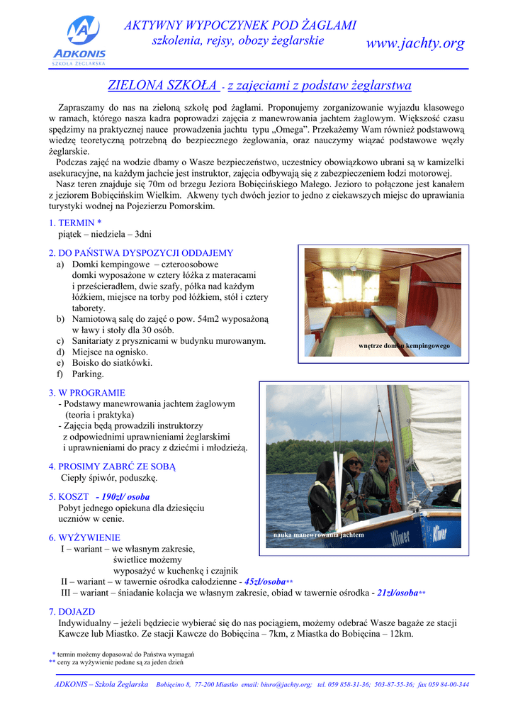 AKTYWNY WYPOCZYNEK POD ŻAGLAMI szkolania, rajsy, obozy żaglarskia www.jachty.org ZIELONA SZKOŁA - z zajęciami z podstaw żaglarstwa Zapraszamy do nas na zieloną szkołę pod żaglami. Proponujemy zorganizowanie wyjazdu klasowego w ramach, którego nasza kadra poprowadzi zajęcia z manewrowania jachtem żaglowym. Większość czasu spędzimy na praktycznej nauce prowadzenia jachtu typu „Omega”. Przekażemy Wam również podstawową wiedzę teoretyczną potrzebną do bezpiecznego żeglowania, oraz nauczymy wiązać podstawowe węzły żeglarskie. Podczas zajęć na wodzie dbamy o Wasze bezpieczeństwo, uczestnicy obowiązkowo ubrani są w kamizelki asekuracyjne, na każdym jachcie jest instruktor, zajęcia odbywają się z zabezpieczeniem łodzi motorowej. Nasz teren znajduje się 70m od brzegu Jeziora Bobięcińskiego Małego. Jezioro to połączone jest kanałem z jeziorem Bobięcińskim Wielkim. Akweny tych dwóch jezior to jedno z ciekawszych miejsc do uprawiania turystyki wodnej na Pojezierzu Pomorskim. 1. TERMIN * piątek – niedziela – 3dni 2. DO PAŃSTWA DYSPOZYCJI ODDAJEMY a) Domki kempingowe – czteroosobowe domki wyposażone w cztery łóżka z materacami i prześcieradłem, dwie szafy, półka nad każdym łóżkiem, miejsce na torby pod łóżkiem, stół i cztery taborety. b) Namiotową salę do zajęć o pow. 54m2 wyposażoną w ławy i stoły dla 30 osób. c) Sanitariaty z prysznicami w budynku murowanym. d) Miejsce na ognisko. e) Boisko do siatkówki. f) Parking. wnętrze domku kempingowego 3. W PROGRAMIE - Podstawy manewrowania jachtem żaglowym (teoria i praktyka) - Zajęcia będą prowadzili instruktorzy z odpowiednimi uprawnieniami żeglarskimi i uprawnieniami do pracy z dziećmi i młodzieżą. 4. PROSIMY ZABRĆ ZE SOBĄ Ciepły śpiwór, poduszkę. 5. KOSZT - 190zł/ osoba Pobyt jednego opiekuna dla dziesięciu uczniów w cenie. nauka manewrowania jachtem 6. WYŻYWIENIE I – wariant – we własnym zakresie, świetlice możemy wyposażyć w kuchenkę i czajnik II – wariant – w tawernie ośrodka całodzienne - 45zł/osoba** III – wariant – śniadanie kolacja we własnym zakresie, obiad w tawernie ośrodka - 21zł/osoba** 7. DOJAZD Indywidualny – jeżeli będziecie wybierać się do nas pociągiem, możemy odebrać Wasze bagaże ze stacji Kawcze lub Miastko. Ze stacji Kawcze do Bobięcina – 7km, z Miastka do Bobięcina – 12km. * termin możemy dopasować do Państwa wymagań ** ceny za wyżywienie podane są za jeden dzień ADKONIS – Szkoła Żaglarska Bobięcino 8, 77-200 Miastko amail: [email protected]; tal. 059 858-31-36; 503-87-55-36; fax 059 84-00-344
