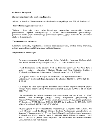 dr Dorota Szczęśniak Zajmowane stanowisko służbowe, Katedra: Adiunkt w Katedrze Literaturoznawstwa Zachodnioeuropejskiego, pok. 301, ul. Studencka 5 Prowadzone zajęcia dydaktyczne: Weimar i Jena jako centra ruchu literackiego, seminarium magisterskie, literatura porównawcza, wykład monograficzny z zakresu literaturoznawstwa germańskiego, praktyczna nauka języka niemieckiego (sprawność czytania), język niemiecki dla studentów studiów doktoranckich Zainteresowania badawcze: Literatura austriacka, współczesna literatura niemieckojęzyczna, krótkie formy literackie, polsko-niemieckie związki literackie, dydaktyka literatury Najważniejsze publikacje: Zum Aphorismus der Wiener Moderne: Arthur Schnitzler, Hugo von Hofmannsthal, Karl Kraus. ibidem-Verlag: Stuttgart 2006, S. 237. ISBN 3-89821-732-9 Jewish Inspirations in the Literary Work od Stanisław Jerzy Lec. W: Poles Jews : history - culture - education / Mariusz Misztal and Piotr Trojański. Kraków : Wydawnictwo Naukowe Uniwersytetu Pedagogicznego, 2011, S. 158-166 „Weniger ist mehr" : ein Plädoyer für den Einsatz von Aphorismen im DaFUnterricht.W: Deutsch als Fremdsprache in der Ukraine. ZdUDGV. - 2009, Heft 21, S. 60-64 Od klasyki po slam. Dydaktyczne przesłanki zastosowania liryki na lekcjach języka obcego. Języki obce w szkole. Wrzesień/październik 2009, nr 4/2009, S. 61-65, ISSN 0446-7965 Die Sprachkritik der Wiener Moderne: Die Aphorismen von Karl Kraus. W: Józef Bremer, Josef Rothhaupt (Hrsg.): Ludwig Wittgenstein „przydzielony do Krakowa“/“Krakau zugeteilt“. Wyższa Szkoła Filozoficzno-Pedagogiczna Ignatianum. Wydawnictwo WAM: Kraków 2009. S. 467-477. (w j. polskim: S. 455-465). ISBN 978-83-7614-004-9, ISBN 978-83-7505-345-6 Krytyka języka w epoce modernizmu wiedeńskiego. Aforyzmy Karla Krausa. W: Józef Bremer, Josef Rothhaupt (Hrsg.): Ludwig Wittgenstein „przydzielony do Krakowa“/“Krakau zugeteilt“. Wyższa Szkoła Filozoficzno-Pedagogiczna Ignatianum. Wydawnictwo WAM: Kraków 2009. S. 455-465. ISBN 978-83-7614-004-9, ISBN 978-83-7505-345-6 (polska wersja artykułu: Die Sprachkritik der Wiener Moderne: Die Aphorismen von Karl Kraus) Aphorismen im DaF-Unterricht: Aufgaben, Beispiele und Tipps. W: Edward Białek, Krzysztof Huszcza (Hrsg.): Förderung der Lesekompetenz im schulischen und universitären Bereich. Beiträge zur Literatur- und Fremdsprachendidaktik. Neisse Verlag: Dresden-Wrocław 2009. S. 87-94. ISSN 1426-7241, ISBN 978-3-940310-743, ISBN 978-83-7432-524-0 Form und Ziele der Gesellschaftskritik in „Die letzten Tage der Menschheit” von Karl Kraus. W: Małgorzata Leyko, Artur Pełka, Karolina Pyrkowska-Michalak (Hrsg.): Felix Austria. Dekonstruktion eines Mythos? Das österreichische Drama und Theater seit Beginn des 20. Jahrhunderts. Litblockin Verlag 2009. S. 158-167. ISBN 978-3932289-07-1 Vielfalt und Einzigartigkeit der Wiener Moderne. W: Philologische Ostsee-Studien. Hrsg. von Anna Mrożewska. Wydawnictwo Uczelniane Politechniki Koszalińskiej: Koszalin 2009. S. 263-273 The art of literary precision: on the specificity of aphoristic style. W: Stil/Style.International Journal. Wyd. Milosav Carkic 7/2008. Belgrade S. 61-68. ISSN: 1451-3145 Die Kraft der Pointe. Form und Gehalt des polnischen Aphorismus. ForumSchulstiftung. Zeitschrift für die katholischen freien Schulen der Erzdiözese Freiburg. 18. Jahrgang. Juni 2008. S. 116-125. ISSN 1611-342X Max Frisch. Der andorranische Jude. In: Alina Kowalczyk, Sebastian Mrożek (Hrsg.): Helvetia Literarisch. Eine Anthologie der Texte Schweizer Autoren mit Aufgaben mit einer Einführung von Prof. Dr. Joanna Jabłkowska. Neisse Verlag: Dresden-Wrocław 2008. S. 153-164. ISBN 978-83-7432-363-5, ISBN 978-3-940310-37-8 Aspekty tyfloglottodydaktyczne nauczania języków obcych. W: Anna MichońskaStadnik, Zdzisław Wąsik (red.): Nowe spojrzenia na motywację w dydaktyce języków obcych. Wydawnictwo Wyższej Szkoły Filologicznej we Wrocławiu: Wrocław 2008. S. 277-284. ISBN 978-83-60097-01-4 Od Achleitnera do Zweiga – trzy dekady literatury austriackiej w Polsce. (rec. Literatura austriacka w Polsce w latach 1980-2008, red. Edward Białek, Katarzyna Nowakowska, Wrocław 2009) w: Przekładaniec. Półrocznik Katedry UNESCO do Badań nad Przekładem i Komunikacją Międzykulturową UJ. Kraków 2011. 2/20091/2010. Nr 22-23, s. 320-326. Kontakt telefoniczny: Telefon służbowy na UP: Adres email: [email protected] +48 12-662-6753