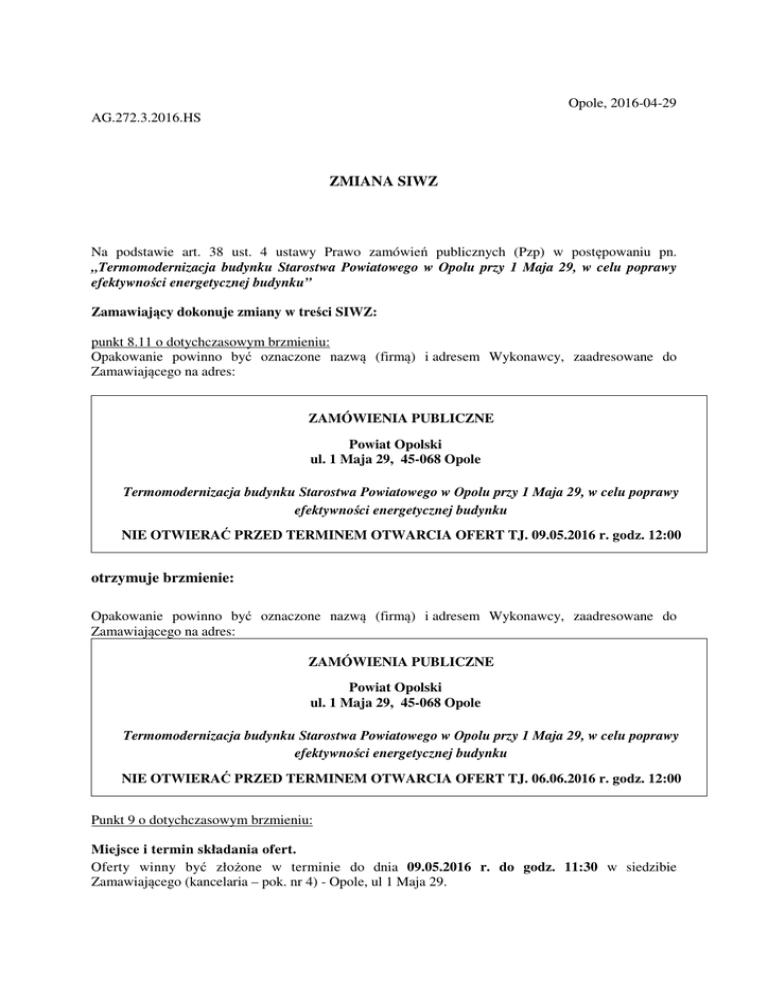 Opole, 2016-04-29 AG.272.3.2016.HS ZMIANA SIWZ Na podstawie art. 38 ust. 4 ustawy Prawo zamówień publicznych (Pzp) w postępowaniu pn. „Termomodernizacja budynku Starostwa Powiatowego w Opolu przy 1 Maja 29, w celu poprawy efektywności energetycznej budynku” Zamawiający dokonuje zmiany w treści SIWZ: punkt 8.11 o dotychczasowym brzmieniu: Opakowanie powinno być oznaczone nazwą (firmą) i adresem Wykonawcy, zaadresowane do Zamawiającego na adres: ZAMÓWIENIA PUBLICZNE Powiat Opolski ul. 1 Maja 29, 45-068 Opole Termomodernizacja budynku Starostwa Powiatowego w Opolu przy 1 Maja 29, w celu poprawy efektywności energetycznej budynku NIE OTWIERAĆ PRZED TERMINEM OTWARCIA OFERT TJ. 09.05.2016 r. godz. 12:00 otrzymuje brzmienie: Opakowanie powinno być oznaczone nazwą (firmą) i adresem Wykonawcy, zaadresowane do Zamawiającego na adres: ZAMÓWIENIA PUBLICZNE Powiat Opolski ul. 1 Maja 29, 45-068 Opole Termomodernizacja budynku Starostwa Powiatowego w Opolu przy 1 Maja 29, w celu poprawy efektywności energetycznej budynku NIE OTWIERAĆ PRZED TERMINEM OTWARCIA OFERT TJ. 06.06.2016 r. godz. 12:00 Punkt 9 o dotychczasowym brzmieniu: Miejsce i termin składania ofert. Oferty winny być złożone w terminie do dnia 09.05.2016 r. do godz. 11:30 w siedzibie Zamawiającego (kancelaria – pok. nr 4) - Opole, ul 1 Maja 29. otrzymuje brzmienie: Miejsce i termin składania ofert. Oferty winny być złożone w terminie do dnia 06.06.2016 r. do godz. 11:30 w siedzibie Zamawiającego (kancelaria – pok. nr 4) - Opole, ul 1 Maja 29. Punkt 12. o dotychczasowym brzmieniu: Wskazanie miejsca i terminu otwarcia ofert. Publiczne otwarcie ofert odbędzie się dnia 09.05.2016 r. o godz. 12:00 w siedzibie Zamawiającego w budynku biurowym w Opolu przy ul. 1 Maja 29, Sala Konferencyjna, pok. nr 400 (I piętro segment B). otrzymuje brzmienie: Wskazanie miejsca i terminu otwarcia ofert. Publiczne otwarcie ofert odbędzie się dnia 06.06.2016 r. o godz. 12:00 w siedzibie Zamawiającego w budynku biurowym w Opolu przy ul. 1 Maja 29, Sala Konferencyjna, pok. nr 400 (I piętro segment B). Punkt 14.1 o dotychczasowym brzmieniu: Kryteria oceny ofert Lp. Kryterium Waga 1. Cena 95 % 2. Gwarancja 5% a. C Kryterium (1%=1 pkt) ceny ofertowej – wartość punktowa 95% Wartość punktowa w kryterium wyliczana będzie wg wzoru: wartość punktowa C = 95% x Cmin. / Cn gdzie: Cmin – cena brutto najniższa spośród nieodrzuconych ofert Cn – cena brutto badanej oferty b. G - Kryterium czasu gwarancji (w pełnych latach) – wartość punktowa 5% (1%=1 pkt) Wartość punktowa w kryterium wyliczana będzie wg wzoru: wartość punktowa T = 5% x Tn / Tmax. gdzie: Tn – gwarancja w badanej ofercie Tmax – najdłuższa gwarancja spośród nieodrzuconych ofert Minimalna oferowana przez Wykonawcę gwarancja na materiały i wykonane roboty budowlane wynosi 3 lata Gwarancję należy liczyć od dnia odbioru końcowego całego przedmiotu umowy z wyjątkiem urządzeń lub materiałów na które producenci udzielili dłuższego okres gwarancji – obowiązuje gwarancja producenta. Całkowita liczba punktów = C + G Zamawiający zastosuje zaokrąglenie każdego wyniku do dwóch miejsc po przecinku. otrzymuje brzmienie: Kryteria oceny ofert Lp. 1) Kryterium Waga 1. Cena 95 % 2. Gwarancja 5% C Kryterium (1%=1 pkt) ceny ofertowej – wartość punktowa 95% Wartość punktowa w kryterium wyliczana będzie wg wzoru: wartość punktowa C = 95% x Cmin. / Cn gdzie: Cmin – cena brutto najniższa spośród nieodrzuconych ofert Cn – cena brutto badanej oferty 2) G - Kryterium czasu gwarancji (w pełnych latach tj. 3,4,5) – wartość punktowa 5% (1%=1 pkt) Wartość punktowa w kryterium wyliczana będzie wg wzoru: gwarancja oferty ocenianej nieodrzuconej – gwarancja minimalna -----------------------------------------------------------------------gwarancja maksymalna – gwarancja minimalna x 100 x 5 % UWAGA: MINIMALNY wymagany przez Zamawiającego okres gwarancji na wykonane roboty i zabudowane materiały wynosi 3 lata. W przypadku podania przez Wykonawcę krótszego niż wymagany okresu gwarancji lub nie podanie (wpisanie) gwarancji, oferta Wykonawcy zostanie odrzucona na podstawie art. 89 ust.1 pkt 2 ustawy Prawo zamówień publicznych, jako niezgodną z SIWZ. MAKSYMALNY okres gwarancji na roboty budowlane do oceny ofert wynosi 5 lat. Jeżeli Wykonawca zaoferuje okres gwarancji dłuższy niż 5 lat do oceny ofert zostanie przyjęty okres 5 lat. Wykonawca, który zaoferuje najkorzystniejszy okres (5 lat) otrzymuje maksymalna liczbę punktów w ramach kryterium gwarancja. Gwarancję należy liczyć od dnia odbioru końcowego całego przedmiotu umowy z wyjątkiem urządzeń lub materiałów na które producenci udzielili dłuższy okres gwarancji – obowiązuje gwarancja producenta (gwarancja producenta nie jest brana pod uwagę do wyliczenia „kryterium czasu gwarancji”). Zamawiający zastosuje zaokrąglenie każdego wyniku do dwóch miejsc po przecinku. Całkowita liczba punktów = C + G Punkt 17.5 o dotychczasowym brzmieniu: Termin wniesienia wadium upływa w dniu 09.05.2016 r. do godz. 11:30 otrzymuje brzmienie: Termin wniesienia wadium upływa w dniu 06.06.2016 r. do godz. 11:30 W treści formularza ofertowego (formularz 1) zapis o brzmieniu: UDZIELAMY NA WW. PRACE GWARANCJI: ………… LAT/A słownie:……………..…………… LAT/A nie mniej niż 3 lata otrzymuje brzmienie: UDZIELAMY NA WW. PRACE GWARANCJI: ………… LAT/A słownie:……………..…………… LAT/A nie mniej niż 3 lata i nie więcej niż 5 lat Do Opisu przedmiotu zamówienia dodaje się pkt. 19, który brzmi: 19. Zamawiający wymaga aby na płytach granitowych była bezbarwna powłoka antygraffiti trwała (połysk), od strony podwórza na wysokości do 2 metrów ma być bezbarwna powłoka antygraffiti trwała (mat), natomiast na elewacji zachodniej i południowej powyżej płyt granitowych bezbarwna powłoka antygraffiti trwała (mat). Okres