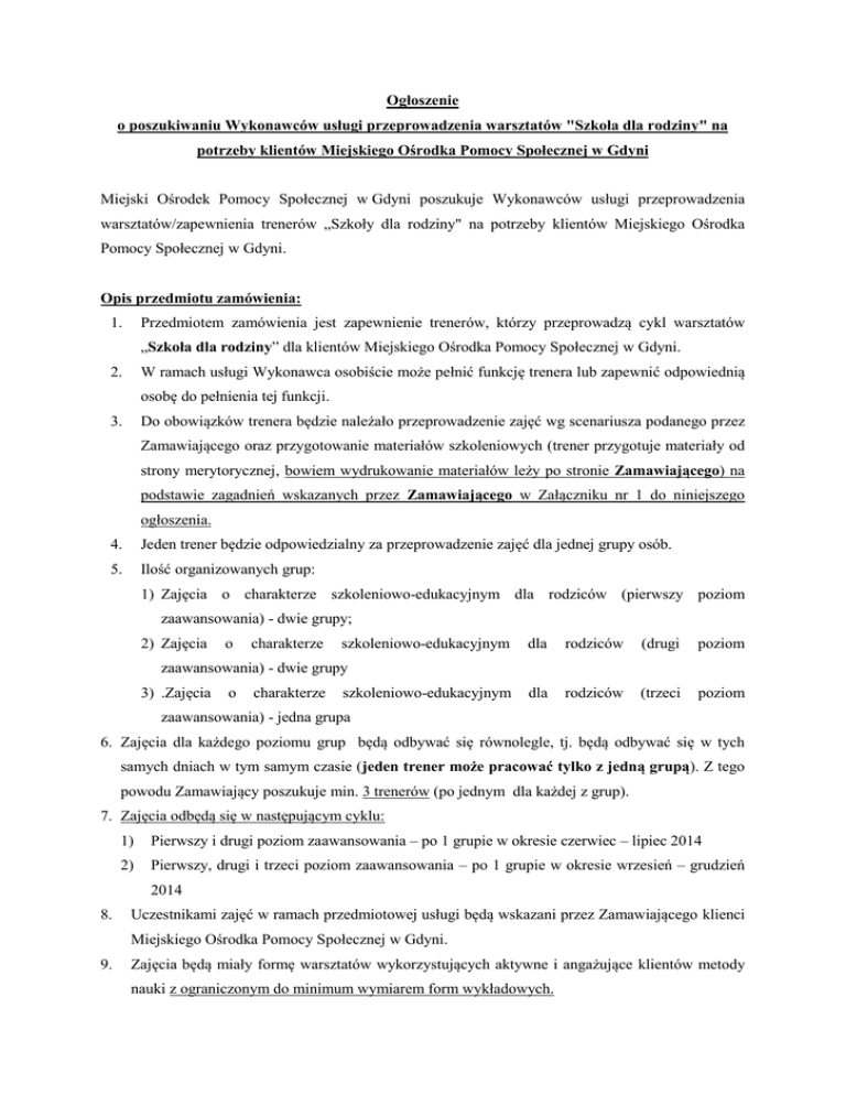 Ogłoszenie o poszukiwaniu Wykonawców usługi przeprowadzenia warsztatów "Szkoła dla rodziny" na potrzeby klientów Miejskiego Ośrodka Pomocy Społecznej w Gdyni Miejski Ośrodek Pomocy Społecznej w Gdyni poszukuje Wykonawców usługi przeprowadzenia warsztatów/zapewnienia trenerów „Szkoły dla rodziny" na potrzeby klientów Miejskiego Ośrodka Pomocy Społecznej w Gdyni. Opis przedmiotu zamówienia: Przedmiotem zamówienia jest zapewnienie trenerów, którzy przeprowadzą cykl warsztatów 1. „Szkoła dla rodziny” dla klientów Miejskiego Ośrodka Pomocy Społecznej w Gdyni. W ramach usługi Wykonawca osobiście może pełnić funkcję trenera lub zapewnić odpowiednią 2. osobę do pełnienia tej funkcji. Do obowiązków trenera będzie należało przeprowadzenie zajęć wg scenariusza podanego przez 3. Zamawiającego oraz przygotowanie materiałów szkoleniowych (trener przygotuje materiały od strony merytorycznej, bowiem wydrukowanie materiałów leży po stronie Zamawiającego) na podstawie zagadnień wskazanych przez Zamawiającego w Załączniku nr 1 do niniejszego ogłoszenia. 4. Jeden trener będzie odpowiedzialny za przeprowadzenie zajęć dla jednej grupy osób. 5. Ilość organizowanych grup: 1) Zajęcia o charakterze szkoleniowo-edukacyjnym dla rodziców (pierwszy poziom zaawansowania) - dwie grupy; 2) Zajęcia o charakterze szkoleniowo-edukacyjnym dla rodziców (drugi poziom dla rodziców (trzeci poziom zaawansowania) - dwie grupy 3) .Zajęcia o charakterze szkoleniowo-edukacyjnym zaawansowania) - jedna grupa 6. Zajęcia dla każdego poziomu grup będą odbywać się równolegle, tj. będą odbywać się w tych samych dniach w tym samym czasie (jeden trener może pracować tylko z jedną grupą). Z tego powodu Zamawiający poszukuje min. 3 trenerów (po jednym dla każdej z grup). 7. Zajęcia odbędą się w następującym cyklu: 1) Pierwszy i drugi poziom zaawansowania – po 1 grupie w okresie czerwiec – lipiec 2014 2) Pierwszy, drugi i trzeci poziom zaawansowania – po 1 grupie w okresie wrzesień – grudzień 2014 8. Uczestnikami zajęć w ramach przedmiotowej usługi będą wskazani przez Zamawiającego klienci Miejskiego Ośrodka Pomocy Społecznej w Gdyni. 9. Zajęcia będą miały formę warsztatów wykorzystujących aktywne i angażujące klientów metody nauki z ograniczonym do minimum wymiarem form wykładowych. 10. Cykl zajęć dla jednej grupy ma zawierać 10 zajęć po 2 godziny co daje ogólną pulę 20 godzin na grupę. 11. Rozmiar grupy to maksymalnie 20 osób. 12. Zajęcia będą odbywać się na terenie miasta Gdyni w miejscu i w lokalu zapewnionym przez Zamawiającego. Lokal, w którym odbędą się zajęcia znajduje się w miejscu, do którego każdy z uczestników będzie mógł dotrzeć komunikacją miejską. 13. Wszystkie zajęcia będą odbywać się w wyznaczone przez Zamawiającego i uzgodnione z Wykonawcą dni robocze (wstępne ustalenia zakładają wtorki i czwartki, jednakże może to ulec zmianie - ostateczne terminy Wykonawca otrzyma najpóźniej na 4 dni robocze przed rozpoczęciem zajęć) w godzinach popołudniowych, tj. między godz. 16:30 – 19:00. Przy czym zajęcia dla danej grupy odbywać się będą 2 razy w tygodniu po 2 godziny. Jedna godzina szkoleniowa liczy 60 minut. W przypadkach uzasadnionych np. dniem świątecznym dopuszcza się aby zajęcia szkoleniowe w danym tygodniu odbyły się tylko raz. 14. Zamawiający zapewni dla każdego uczestnika wydruk materiałów szkoleniowych, opracowanych przez Wykonawcę, niezbędnych do realizacji zajęć, oraz przybory piśmienne dla każdego uczestnika. Wymagane doświadczenie trenerów: Każdy trener musi posiadać wykształcenie wyższe psychologiczne lub pedagogiczne oraz powinien spełniać łącznie poniższe warunki: 1) Posiadać doświadczenie w prowadzeniu zajęć o charakterze edukacyjnym, mających na celu podniesienie kompetencji wychowawczych grup rodziców/rodzin z problemami wychowawczymi, w wymiarze nie mniejszym niż 50 godzin; 2) Posiadać minimum jednoroczne (12 miesięcy) doświadczenie w pracy z klientami pomocy społecznej. Planowany okres realizacji całej usługi: czerwiec 2014 – grudzień 2014. Oferta musi zawierać: 1) Informacje dotyczące trenera/trenerów, w tym jego kwalifikacje (CV oraz informacje potwierdzające wymagane doświadczenie); Uwaga! Wykonawca, którego oferta zostanie uznana za najkorzystniejszą, przed podpisaniem umowy, będzie zobowiązany dostarczyć dokumenty potwierdzające doświadczenie. 2) Wysokość stawki za 1 godzinę szkoleniową (60 minut) pracy danego trenera. 3) Łączna oferowana cena za zorganizowanie usługi. wymagane Warunki rozeznania rynku: 1) Podane przez Wykonawców ceny (przy uwzględnieniu powyższych założeń) stanowić będą podstawę do wyboru realizatora usługi (Wykonawcy). 2) Wybór Wykonawcy zostanie dokonany na podstawie ceny całkowitej brutto. Za najkorzystniejszą zostanie uznana oferta spełniająca warunki określone w niniejszym ogłoszeniu i zawierająca najniższą cenę. 3) W przypadku otrzymania większej ilości ofert z tą samą ceną Zamawiający wezwie wykonawców do złożenia ofert dodatkowych. Termin i sposób składania ofert: 1. Wykonawca może złożyć ofertę na część przedmiotu zamówienia. 2. Oferty - wypełniony formularz „Treść oferty” - załącznik nr 1 do niniejszego zapytania należy przesłać do dnia 27.06.2014 r., do godz. 10:00, na adres e-mail: [email protected] 3. Po upływie ww. terminu osoby odpowiedzialne za przeprowadzenie postępowania zweryfikują treść złożonych ofert i dokonają wyboru oferty najkorzystniejszej. Załącznik nr 1 Zakres merytoryczny i programowy poszczególnych zajęć: 1. Zajęcia o charakterze szkoleniowo-edukacyjnym dla rodziców (pierwszy poziom zaawansowania) (2 grupy max. 25 osobowe). 1) Zajęcia mają mieć na celu m. in.: a) podniesienie kompetencji opiekuńczo – wychowawczych rodziców, b) uświadomienie wł