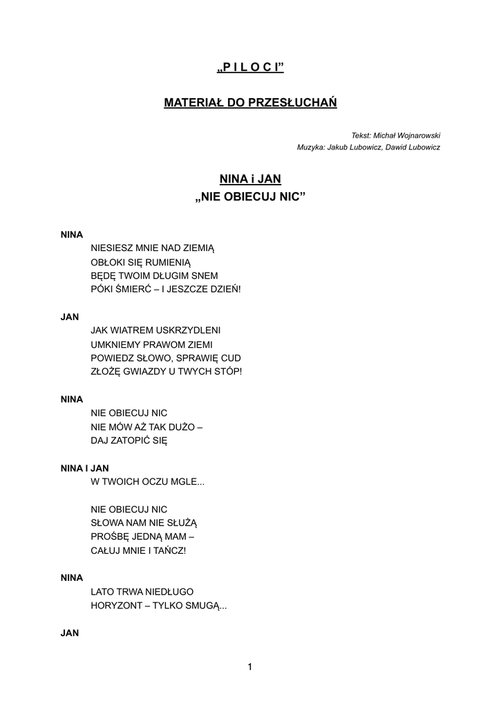 „P I L O C I” MATERIAŁ DO PRZESŁUCHAŃ Tekst: Michał Wojnarowski Muzyka: Jakub Lubowicz, Dawid Lubowicz NINA i JAN „NIE OBIECUJ NIC” NINA NIESIESZ MNIE NAD ZIEMIĄ OBŁOKI SIĘ RUMIENIĄ BĘDĘ TWOIM DŁUGIM SNEM PÓKI ŚMIERĆ – I JESZCZE DZIEŃ! JAN JAK WIATREM USKRZYDLENI UMKNIEMY PRAWOM ZIEMI POWIEDZ SŁOWO, SPRAWIĘ CUD ZŁOŻĘ GWIAZDY U TWYCH STÓP! NINA NIE OBIECUJ NIC NIE MÓW AŻ TAK DUŻO – DAJ ZATOPIĆ SIĘ NINA I JAN W TWOICH OCZU MGLE... NIE OBIECUJ NIC SŁOWA NAM NIE SŁUŻĄ PROŚBĘ JEDNĄ MAM – CAŁUJ MNIE I TAŃCZ! NINA LATO TRWA NIEDŁUGO HORYZONT – TYLKO SMUGĄ... JAN 1 ZE MNĄ MOŻESZ DOTKNĄĆ GO PORWĘ CIEBIE W NIEZWYKŁY LOT NINA NIE OBIECUJ NIC NIE MÓW AŻ TAK DUŻO DAJ ZATOPIĆ SIĘ NINA I JAN W OCZU TWOICH MGLE... CZY ZBYT GŁOŚNY ŚMIECH BOGÓW NIE OBURZY? PROŚBĘ JEDNĄ MAM: CAŁUJ MNIE I TAŃCZ! CHOĆBY LOS CHCIAŁ NAS ZRANIĆ TO TĘ CHWILĘ JEDNĄ MAMY! NIE OBIECUJ NIC NIE MÓW AŻ TAK DUŻO – DAJ ZATOPIĆ SIĘ W TWOICH OCZU MGLE... NIE OBIECUJ NIC SŁOWA NAM NIE SŁUŻĄ PROŚBĘ JEDNĄ MAM – CAŁUJ MNIE I TAŃCZ! 2