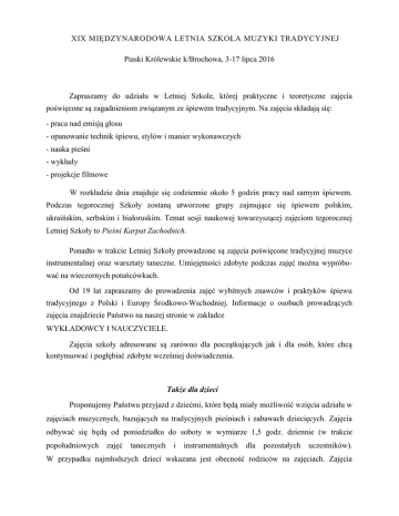 XIX MIĘDZYNARODOWA LETNIA SZKOŁA MUZYKI TRADYCYJNEJ Piaski Królewskie k/Brochowa, 3-17 lipca 2016 Zapraszamy do udziału w Letniej Szkole, której praktyczne i teoretyczne zajęcia poświęcone są zagadnieniom związanym ze śpiewem tradycyjnym. Na zajęcia składają się: - praca nad emisją głosu - opanowanie technik śpiewu, stylów i manier wykonawczych - nauka pieśni - wykłady - projekcje filmowe W rozkładzie dnia znajduje się codziennie około 5 godzin pracy nad samym śpiewem. Podczas tegorocznej Szkoły zostaną utworzone grupy zajmujące się śpiewem polskim, ukraińskim, serbskim i białoruskim. Temat sesji naukowej towarzyszącej zajęciom tegorocznej Letniej Szkoły to Pieśni Karpat Zachodnich. Ponadto w trakcie Letniej Szkoły prowadzone są zajęcia poświęcone tradycyjnej muzyce instrumentalnej oraz warsztaty taneczne. Umiejętności zdobyte podczas zajęć można wypróbować na wieczornych potańcówkach. Od 19 lat zapraszamy do prowadzenia zajęć wybitnych znawców i praktyków śpiewu tradycyjnego z Polski i Europy Środkowo-Wschodniej. Informacje o osobach prowadzących zajęcia znajdziecie Państwo na naszej stronie w zakładce WYKŁADOWCY I NAUCZYCIELE. Zajęcia szkoły adresowane są zarówno dla początkujących jak i dla osób, które chcą kontynuować i pogłębiać zdobyte wcześniej doświadczenia. Także dla dzieci Proponujemy Państwu przyjazd z dziećmi, które będą miały możliwość wzięcia udziału w zajęciach muzycznych, bazujących na tradycyjnych pieśniach i zabawach dziecięcych. Zajęcia odbywać się będą od poniedziałku do soboty w wymiarze 1,5 godz. dziennie (w trakcie popołudniowych zajęć tanecznych i instrumentalnych dla pozostałych uczestników). W przypadku najmłodszych dzieci wskazana jest obecność rodziców na zajęciach. Zajęcia odbędą się, jeśli zgłosi się wystarczająca ilość chętnych (minimum 6 dzieci, koszt udział w zajęciach dla dzieci wynosi 200 zł). Ramowy program dnia: 10:30 - wykład 12:00 – 14:00 warsztaty głosowe Przerwa obiadowa 16:00 – 17:30 warsztaty taneczne, instrumentalne/zajęcia dla dzieci 18:00 – 20:00 warsztaty głosowe Przerwa kolacyjna 21:30 zajęcia fakultatywne/potańcówki/projekcje filmowe/dyskusje Aby uczestniczyć w MLSMT należy: - wypełnić formularz zgłoszeniowy zamieszczony na naszej stronie internetowej w nieprzekraczalnym terminie do 20 czerwca 2016r. - wypełniony formularz przesłać na adres [email protected], w temacie wiadomości wpisując: Letnia Szkoła 2016. - uiścić opłatę w wysokości 650 zł, udział w zajęciach instrumentalnych/tanecznych 100 zł, zajęcia dla dzieci dla dzieci – opłata 200 zł (Osoby zakwalifikowane do udziału w Letniej Szkole zostaną poinformowane mailowo o numerze konta oraz sposobie dokonania wpłaty. Prosimy nie dokonywać wpłat przed otrzymaniem wiadomości o przyjęciu na Szkołę i sposobie płatności.) Warunki uczestnictwa: - Uczestnicy proszeni są o przyjazd w dniu 3 lipca 2016 r. Zajęcia Letniej Szkoły rozpoczynają się 4 lipca rano, a kończą się otwartą prezentacją grup warsztatowych w dniach 15 i 16 lipca, wyjazd 17 lipca. - Uczestników prosimy o przywiezienie ze sobą sprzętu audio, umożliwiającego odsłuchiwanie nagrań do pracy (dyktafon, mp3 lub telefon z taką funkcją itp.). - O przyjęciu na Letnią Szkołę jak i przydziale do grup decydują organizatorzy (w oparciu o formularze zgłoszeniowe oraz uwzględniając preferencje kandydata - jednak nie jest to czynnik decydujący) - Nie przewiduje się możliwości dołączania w trakcie zajęć Szkoły, samowolnego zmieniania grup oraz wcześniejszego wyjazdu (przed prezentacją podsumowującą Szkołę) jest to możliwe tylko w wyjątkowych wypadkach i po konsultacji z organizatorem. Informacje dodatkowe: Organizatorzy nie pośredniczą w rezerwowaniu noclegów i posiłków. Miejsca noclegowe można zarezerwować w Ośrodku Wypoczynkowym "Dolina Słońca" w Piaskach Królewskich k/Brochowa. Cena noclegu i posiłków: całodzienne wyżywienie i zakwaterowanie 70 zł. Koszt pobytu na polu namiotowym to 15 zł/os/dobę. Rezerwacje i informacje: e-mail: [email protected] tel. 22 796 51 45 / 502 389 851 Osoby decydujące się na nocleg w domkach prosimy o nie zwlekanie z dokonaniem rezerwacji. Fundacja „Muzyka Kresów” ul. Jezuicka 4/5 20-113 Lublin tel. 887 255 733, 609 609 912, 513 679 561 [email protected] Projekt XIX Międzynarodowa Letnia Szkoła Muzyki Tradycyjnej dofinansowano ze środków Ministra Kultury i Dziedzictwa Narodowego