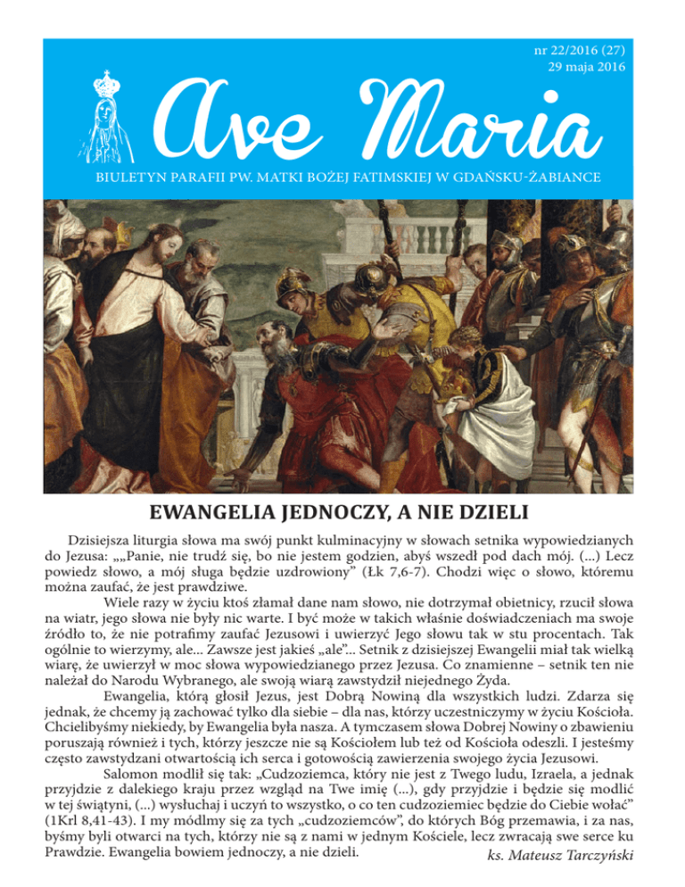nr 22/2016 (27) 29 maja 2016 Ave Maria BIULETYN PARAFII PW. MATKI BOŻEJ FATIMSKIEJ W GDAŃSKU-ŻABIANCE EWANGELIA JEDNOCZY, A NIE DZIELI Dzisiejsza liturgia słowa ma swój punkt kulminacyjny w słowach setnika wypowiedzianych do Jezusa: „„Panie, nie trudź się, bo nie jestem godzien, abyś wszedł pod dach mój. (...) Lecz powiedz słowo, a mój sługa będzie uzdrowiony” (Łk 7,6-7). Chodzi więc o słowo, któremu można zaufać, że jest prawdziwe. Wiele razy w życiu ktoś złamał dane nam słowo, nie dotrzymał obietnicy, rzucił słowa na wiatr, jego słowa nie były nic warte. I być może w takich właśnie doświadczeniach ma swoje źródło to, że nie potrafimy zaufać Jezusowi i uwierzyć Jego słowu tak w stu procentach. Tak ogólnie to wierzymy, ale... Zawsze jest jakieś „ale”... Setnik z dzisiejszej Ewangelii miał tak wielką wiarę, że uwierzył w moc słowa wypowiedzianego przez Jezusa. Co znamienne – setnik ten nie należał do Narodu Wybranego, ale swoją wiarą zawstydził niejednego Żyda. Ewangelia, którą głosił Jezus, jest Dobrą Nowiną dla wszystkich ludzi. Zdarza się jednak, że chcemy ją zachować tylko dla siebie – dla nas, którzy uczestniczymy w życiu Kościoła. Chcielibyśmy niekiedy, by Ewangelia była nasza. A tymczasem słowa Dobrej Nowiny o zbawieniu poruszają również i tych, którzy jeszcze nie są Kościołem lub też od Kościoła odeszli. I jesteśmy często zawstydzani otwartością ich serca i gotowością zawierzenia swojego życia Jezusowi. Salomon modlił się tak: „Cudzoziemca, który nie jest z Twego ludu, Izraela, a jednak przyjdzie z dalekiego kraju przez wzgląd na Twe imię (...), gdy przyjdzie i będzie się modlić w tej świątyni, (...) wysłuchaj i uczyń to wszystko, o co ten cudzoziemiec będzie do Ciebie wołać” (1Krl 8,41-43). I my módlmy się za tych „cudzoziemców”, do których Bóg przemawia, i za nas, byśmy byli otwarci na tych, którzy nie są z nami w jednym Kościele, lecz zwracają swe serce ku Prawdzie. Ewangelia bowiem jednoczy, a nie dzieli. ks. Mateusz Tarczyński ZE SŁOWA BOŻEGO NA IX NIEDZIELĘ ZWYKŁĄ 1 Krl 8,41-43; Ps 117 (116),1-2; Ga 1,1-2.6-10; Łk 7,1-10 Gdy Jezus dokończył swoich mów do ludu, który się przysłuchiwał, wszedł do Kafarnaum. Sługa pewnego setnika, szczególnie przez niego ceniony, chorował i bliski był śmierci. Skoro setnik posłyszał o Jezusie, wysłał do Niego starszyznę żydowską z prośbą, żeby przyszedł i uzdrowił mu sługę. Ci zjawili się u Jezusa i prosili Go usilnie: „Godzien jest, żebyś mu to wyświadczył, mówili, kocha bowiem nasz naród i sam zbudował nam synagogę”. Jezus przeto wybrał się z nimi. A gdy był już niedaleko domu, setnik wysłał do Niego przyjaciół z prośbą: „Panie, nie trudź się, bo nie jestem godzien, abyś wszedł pod dach mój. I dlatego ja sam nie uważałem się za godnego przyjść do Ciebie. Lecz powiedz słowo, a mój sługa będzie uzdrowiony. Bo i ja, choć podlegam władzy, mam pod sobą żołnierzy. Mówię temu: »Idź« – a idzie; drugiemu: »Chodź« – a przychodzi; a mojemu słudze: »Zrób to« – a robi”. Gdy Jezus to usłyszał, zadziwił się i zwracając się do tłumu, który szedł za Nim, rzekł: „Powiadam wam: Tak wielkiej wiary nie znalazłem nawet w Izraelu”. A gdy wysłani wrócili do domu, zastali sługę zdrowego. Z KALENDARZA LITURGICZNEGO 16 MAJA NAWIEDZENIE NAJŚWIĘTSZEJ MARYI PANNY Święto Nawiedzenia wywodzi się z religijności chrześcijańskiego Wschodu. Uroczystość tę wprowadził do zakonu franciszkańskiego św. Bonawentura w roku 1263. Kiedy zaś powstała wielka schizma na Zachodzie, święto to rozszerzył na cały Kościół papież Bonifacy IX w roku 1389, aby uprosić za przyczyną Maryi jedność w Kościele Chrystusowym. Sobór w Bazylei (1441) to święto zatwierdził. Święto Nawiedzenia obchodzimy w okresie między uroczystościami Zwiastowania Pańskiego i narodzenia św. Jana Chrzciciela. W ten sposób wspominamy przede wszystkim spotkanie Mesjasza ze swoim poprzednikiem - Janem Chrzcicielem. Jest to także spotkanie dwóch matek. Dokładny opis Nawiedzenia zostawił nam św. Łukasz w swojej Ewangelii (Łk 1,39-56). Według tradycji miało ono miejsce w Ain Karim, około 7 km na zachód od Jerozolimy, gdzie dwa kościoły upamiętniają dwa wydarzenia - radosne spotkanie matek (kościół nawiedzenia św. Elżbiety, położony na zboczu wzgórza za miastem) i narodzenie Jana Chrzciciela (kościół położony w samym mieście). Maryja prawdopodobnie odbywała całą drogę z Nazaretu do Ain Karim - czy jak chcą niektórzy bibliści może nawet do Hebronu - pieszo. Być może przyłączyła się do jakiejś pielgrzymki, idącej do Jerozolimy. Trudno bowiem przypuścić, aby szła sama w tak długą drogę, która mogła wynosić ok. 150 kilometrów. Pragnęła podzielić się ze swoją krewną wiadomością o Zwiastowaniu, jednocześnie gratulując jej tak długo oczekiwanego potomstwa. Maryja po przybyciu dowiaduje się ze zdziwieniem, że Elżbieta już wszystko wie - tak dalece, że nawet zwraca się do niej słowami anioła: „Błogosławiona jesteś między niewiastami”. Elżbieta wyraża równocześnie uznanie dla Maryi, że zawierzyła słowom posłańca Bożego. Zadziwiająca jest pokora Maryi. Przychodzi z pomocą do swojej starszej krewnej, gdy ta będzie rodzić syna. Ale i Elżbieta zdobywa się na wielki akt pokory, kiedy Matkę Chrystusa wita słowami: „A skądże mi to, że Matka mojego Pana przychodzi do mnie?”. Elżbieta stwierdza równocześnie, że na dźwięk słowa Maryi poruszyło się w łonie jej dziecię. Pisarze kościelni są przekonani, że był to akt powitania Chrystusa przez św. Jana i że w tym właśnie momencie św. Jan został uwolniony od grzechu pierworodnego i napełniony Duchem Świętym. Poruszenie św. Jana często zestawia się z tańcem radości króla Dawida, id