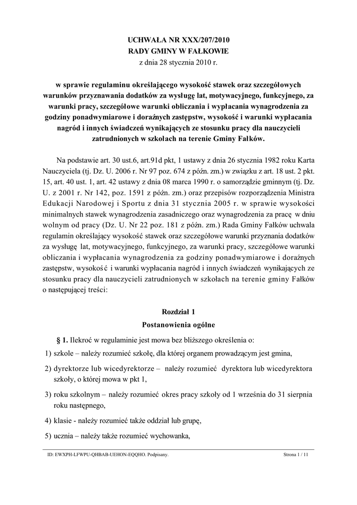UCHWAŁA NR XXX/207/2010 RADY GMINY W FAŁKOWIE z dnia 28 stycznia 2010 r. w sprawie regulaminu określającego wysokość stawek oraz szczegółowych warunków przyznawania dodatków za wysługę lat, motywacyjnego, funkcyjnego, za warunki pracy, szczegółowe warunki obliczania i wypłacania wynagrodzenia za godziny ponadwymiarowe i doraźnych zastępstw, wysokość i warunki wypłacania nagród i innych świadczeń wynikających ze stosunku pracy dla nauczycieli zatrudnionych w szkołach na terenie Gminy Fałków. Na podstawie art. 30 ust.6, art.91d pkt, 1 ustawy z dnia 26 stycznia 1982 roku Karta Nauczyciela (tj. Dz. U. 2006 r. Nr 97 poz. 674 z późn. zm.) w związku z art. 18 ust. 2 pkt. 15, art. 40 ust. 1, art. 42 ustawy z dnia 08 marca 1990 r. o samorządzie gminnym (tj. Dz. U. z 2001 r. Nr 142, poz. 1591 z późn. zm.) oraz przepisów rozporządzenia Ministra Edukacji Narodowej i Sportu z dnia 31 stycznia 2005 r. w sprawie wysokości minimalnych stawek wynagrodzenia zasadniczego oraz wynagrodzenia za pracę w dniu wolnym od pracy (Dz. U. Nr 22 poz. 181 z późn. zm.) Rada Gminy Fałków uchwala regulamin określający wysokość stawek oraz szczegółowe warunki przyznania dodatków za wysługę lat, motywacyjnego, funkcyjnego, za warunki pracy, szczegółowe warunki obliczania i wypłacania wynagrodzenia za godziny ponadwymiarowe i doraźnych zastępstw, wysokoś ć i warunki wypłacania nagród i innych świadczeń wynikających ze stosunku pracy dla nauczycieli zatrudnionych w szkołach na terenie gminy Fałków o następującej treści: Rozdział 1 Postanowienia ogólne § 1. Ilekroć w regulaminie jest mowa bez bliższego określenia o: 1) szkole – należy rozumieć szkołę, dla której organem prowadzącym jest gmina, 2) dyrektorze lub wicedyrektorze – należy rozumieć dyrektora lub wicedyrektora szkoły, o której mowa w pkt 1, 3) roku szkolnym – należy rozumieć okres pracy szkoły od 1 września do 31 sierpnia roku następnego, 4) klasie - należy rozumieć także oddział lub grupę, 5) ucznia – należy także rozumieć wychowanka, 6) tygodniowym obowiązkowym wymiarze godzin - należy rozumieć tygodniowy ID: EWXPH-LFWPU-QHBAB-UEHON-EQQHO. Podpisany. Strona 1 / 11 obowiązkowy wymiar godzin, o którym mowa w art.42 ustawy z dnia 26 stycznia 1982 roku – Karta Nauczyciela (tj. Dz. U. z 2006 r., Nr 97, poz. 674 ze zm.). § 2. Na podstawie art.30 ust. 6 ustawy – Karta Nauczyciela określa się: 4) klasie - należy rozumieć także oddział lub grupę, 5) ucznia – należy także rozumieć wychowanka, 6) tygodniowym obowiązkowym wymiarze godzin - należy rozumieć tygodniowy obowiązkowy wymiar godzin, o którym mowa w art.42 ustawy z dnia 26 stycznia 1982 roku – Karta Nauczyciela (tj. Dz. U. z 2006 r., Nr 97, poz. 674 ze zm.). § 2. Na podstawie art.30 ust. 6 ustawy – Karta Nauczyciela określa się: 1) dodatek za wysługę lat, 2) dodatek motywacyjny, 3) dodatek funkcyjny, 4) dodatek za warunki pracy, 5) warunki obliczania i wypłacania wynagrodzenia za godziny ponadwymiarowe, 6) warunki obliczania i wypłacania za godziny doraźnych zastępstw, 7) nagrody ze specjalnego funduszu nagród za osiągnięcia dydaktyczne. Rozdział 2 Dodatek za wysługę lat § 3. 1. Nauczycielom przysługuje dodatek za wysługę lat, w wysokośc i 1 % wynagrodzenia zasadniczego za każdy rok pracy, wypłacany w okresach miesięcznych poczynając od czwartego roku pracy, z tym, że dodatek ten nie może przekroczyć 20% wynagrodzenia zasadniczego. 2. Dodatek za wysługę lat przysługuje: 1) począwszy od pierwszego dnia miesiąca kalendarzowego następującego po miesiącu, w którym nauczyciel nabył prawo do dodatku lub wyższej stawki dodatku, jeżeli nabycie prawa nastąpiło w ciągu miesiąca, 2) za dany miesiąc, jeżeli nabycie prawa do dodatku lub wyższej stawki dodatku nastąpiło pierwszego dnia miesiąca. 3. Dodatek za wysługę przysługuje nauczycielowi za okres urlopu dla poratowania zdrowia oraz za dni, za które nauczyciel otrzymuje wynagrodzenie chyba, że przepis szczególny stanowi inaczej. Dodatek ten przysługuje również za dni nieobecności w pracy z powodu niezdolności do pracy wskutek choroby bądź konieczności osobistego sprawowania opieki nad dzieckiem lub chorym członkiem rodziny, za które nauczyciel otrzymuje wynagrodzenie lub zasiłek z ubezpieczenia społecznego. Dodatku za wysługę lat nie uwzględnia się na podstawie wymiaru świadczeń chorobowych. 4. Dodatek za wysługę lat wypłaca się z góry, w terminie wypłaty wynagrodzenia. Rozdział 3 ID: EWXPH-LFWPU-QHBAB-UEHON-EQQHO. Podpisany. Strona 2 / 11 Dodatek motywacyjny § 4. 1. Warunkiem przyznania dodatku motywacyjnego jest: 1) Uzyskanie szczególnych osiągnięć dydaktycznych, wychowawczych i opiekuńczych, a w szczególności: lat nie uwzględnia się na podstawie wymiaru świadczeń chorobowych. 4. Dodatek za wysługę lat wypłaca się z góry, w terminie wypłaty wynagrodzenia. Rozdział 3 Dodatek motywacyjny § 4. 1. Warunkiem przyznania dodatku motywacyjnego jest: 1) Uzyskanie szczególnych osiągnięć dydaktycznych, wychowawczych i opiekuńczych, a w szczególności: a) uzyskanie przez uczniów, z uwzględnieniem ich możliwości oraz warunków p r a c y n a u c z y c i e l a , d o b r y c h o s iągnię ć dydaktyczno-wychowawczych potwierdzonych wynikami klasyfikacji lub promocji, efektami egzaminów i sprawdzianów w konkursach, zawodach i olimpiadach itp., b) umiejętne rozwiązywanie problemów wychowawczych uczniów we współpracy z ich rodzicami, c) pełne rozpoznanie środowiska wychowawczego uczniów, aktywne i efektywne działanie na rzecz uczniów potrzebujących szczególnej opieki. 2) Jakoś ć świadczonej pracy, w tym związanej z powierzonym stanowiskiem kierowniczym, dodatkowym zadaniem lub zajęciem, a w szczególności: a) systematyczne i efektywne przygotowanie się do przydzielonych obowiązków, b) podnoszenie umiejętności zawodowych, c) 