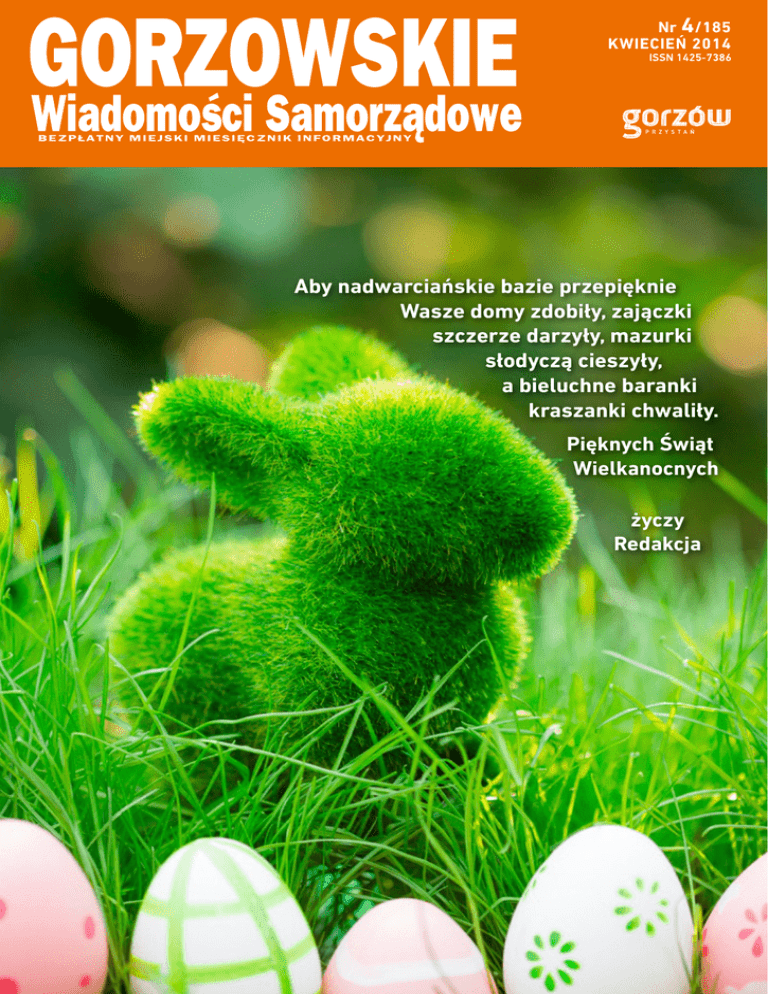 Nr 4/185 KWIECIEŃ 2014 Aby nadwarciańskie bazie przepięknie Wasze domy zdobiły, zajączki szczerze darzyły, mazurki słodyczą cieszyły, a bieluchne baranki kraszanki chwaliły. Pięknych Świąt Wielkanocnych życzy Redakcja W skrócie Kulturalne Prowincjonalia Mieszkańcy Gorzowa uczcili Narodowy Dzień Pamięci Żołnierzy Wyklętych. W kościele Pierwszych Męczenników Polski, drugiego marca odprawiono mszę świętą w ich intencji, a trzeciego marca w WiMBP, Jarosław Palicki z Delegatury Instytutu Pamięci Narodowej w Gorzowie wygłosił prelekcję „Żołnierze Wyklęci”. W obchody włączyły się także gorzowskie szkoły. Centrum Edukacji Artystycznej - Filharmonia Gorzowska czwartego marca zadeklarowała współpracę z gminą Skwierzyna i Majątkiem Ziemskim Pałac Wiejce. Efektem porozumienia będzie akcja Kulturalne Prowincjonalia Skwierzyna – Wiejce 2014. Dzięki temu w obu miejscowościach zostaną zorganizowane koncerty z udziałem muzyków filharmonii oraz pokazy filmowe. Poznali ofertę szkół Obrady ONZ PuszMUN Czwartego i piątego marca w hali AWF uczniowie szkół gimnazjalnych i ponadgimnazjalnych uczestniczyli w XII edycji Targów Edukacyjnych w Gorzowie. Poznali aktualną ofertę lubuskich szkół oraz uczelni wyższych. Największym zainteresowaniem cieszyły się: Uniwersytet Szczeciński, Akademia Morska, Szkoła Główna Służby Pożarniczej w Warszawie oraz Uniwersytet Pedagogiczny w Krakowie. Delegaci z Anglii, Włoch, Niemiec, Szwecji, Ukrainy i Polski, 13-15 marca uczestniczyli w symulacji obrad ONZ PuszMUN. Uczniowie dyskutowali nad rozwiązaniem trzech światowych problemów. Pierwszy dotyczył poprawy warunków życia mieszkańców slumsów, drugi działalności religijnych grup terrorystycznych, a trzeci zagadnień związanych z zapewnieniem azylu imigrantom. Motywowali przedsiębiorców Kaziuki w Gorzowie Do Gorzowa, 14 marca dotarli prelegenci ogólnopolskiego projektu Akademii Przedsiębiorcy. Podczas warsztatów przedsiębiorcy poznali najważniejsze zasady motywacji, perswazji oraz promowania potencjału biznesowego. Szkolił ich major US Army, Rocco A. Spencer. Wnioski? Okazało się, że w pracy na własny rachunek, tak jak i w armii liczy się dobra strategia, planowanie i precyzja. Koncerty, wykłady i degustacje. Pierwszego marca w Gorzowie rozpoczęły się Kaziuki, święto ku czci św. Kazimierza Królewicza, patrona Polski i Litwy. W Wojewódzkiej i Miejskiej Bibliotece Publicznej im. Zbigniewa Herberta 20 marca odbył się koncert „Śpiewaj pieśni kresowe w Gorzowie”. Publiczność była zachwycona. Kaziuki potrwają do połowy kwietnia. Fot. W.Urban Fot. E.Sadowska Ku pamięci wyklętych INWESTYCJE/EDUKACJA Coraz bliżej do Centrum Edukacji Zawodowej Najpóźniej do czerwca powstanie projekt Centrum Edukacji Zawodowej. Wykona go architekt Leszek Horodyński. 11 marca, prezydent Tadeusz Jędrzejczak podpisał umowę z wykonawcą koncepcji zagospodarowania terenów poszpitalnych przy ul. Warszawskiej. Działka po byłym szpitalu od wielu lat jest niezagospodarowana. Przetargi na sprzedaż tego terenu, Urząd Marszałkowski ogłaszał kilkakrotnie. Znalezienie nowego właściciela odwlekało się w czasie, a pustostan niszczał. O przekazanie terenu dla miasta wnioskował prezydent Tadeusz Jędrzejczak. W 2012 roku pomysł zaakceptowały władze województwa, które ostateczną, pozytywną decyzję podjęły jednogłośnie. Postawiły jednak warunek: miasto w ciągu pięciu lat musi stworzyć w tym miejscu placówkę oświatową. - To bardzo duży projekt, ale chcemy wyjść naprzeciw środowiskom oświatowym, biznesowym i gospodarczym – mówił przed laty prezydent T. Jędrzejczak - i słowa dotrzymał. W Gorzowie powstanie Centrum Edukacji Zawodowej. Nowa placówka podniesie jakość pracy i atrakcyjność szkół prowadzących kształcenie w zawodach oraz zachęci gimnazjalistów do kontynuowania nauki na kierunkach technicznych. W placówce powstanie m.in. technikum, zasadnicza szkoła zawodowa, szkoła policealna, Centrum Kształcenia Ustawicznego oraz Centrum Kształcenia Praktycznego. Jeśli wszystko pójdzie zgodnie z planem uczniowie szkół młodzieżowych będą mieli do dyspozycji około 40 oddziałów. W Centrum Kształcenia Praktycznego zostanie zorganizowana praktyczna część szkolenia zawodowego oraz kształcenie zawodowe osób dorosłych. Centrum Kształcenia Ustawicznego będzie realizowało zadania z zakresu edukacji zawodowej osób dorosłych. W jednym kompleksie odbywać się będzie edukacja młodzieży w formie szkolnej, edukacja zawodowa osób dorosłych, poradnictwo i doradztwo zawodowe. Przygotowanie do pracy w konkretnym zawodzie będzie realizowane we współpracy z pracodawcami i organizacjami pracodawców. - Chcemy, by ustawiczne, mobilne kształcenie było dostosowane do potrzeb rynku pracy. To będzie nowa jakość, która uatrakcyjni edukację i pomoże łatwiej odnaleźć się na rynku pracy – przekonywała podczas podpisania umowy z wykonawcą koncepcji zagospodarowania poszpitalnych budynków wiceprezydent Alina Nowak. Projekt będzie gotowy najpóźniej 10 czerwca. Architekt Leszek Horodyński zadeklarował, że wstępne konspekty opracuje do końca kwietnia. - Znam ten teren od dziecka. Tak jak innym mieszkańcom Gorzowa, to miejsce jest mi bliskie, dlatego mój projekt będzie skrupulatnie przemyślany i oczywiście liczę na rzeczową krytykę – deklarował podczas konferencji w gorzowskim magistracie . Ewa Sadowska, Wydział Edukacji INWESTYCJE Terminal Gorzów W Gorzowie powstanie nowoczesny terminal odpraw podróżnych. 20 marca, prezydent Tadeusz Jędrzejczak i Krzysztof Częstochowski, prezes Zarządu Przedsiębiorstwa Komunikacji Samochodowej podpisali list intencyjny dotyczący współpracy w nabyciu nieruchomości na cele publicznego transportu zbiorowego. Nowoczesny terminal, zwany też stacją przesiadkową będzie obsługiwał PKS, PKP oraz MZK. Całość poł