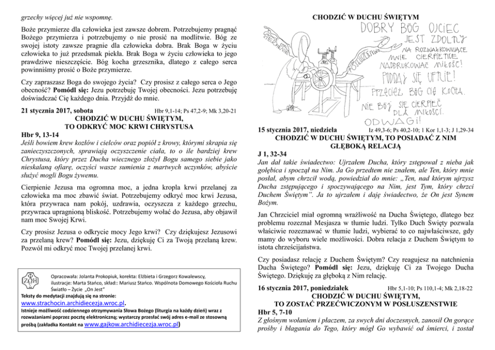 grzechy więcej już nie wspomnę. CHODZIĆ W DUCHU ŚWIĘTYM Boże przymierze dla człowieka jest zawsze dobrem. Potrzebujemy pragnąć Bożego przymierza i potrzebujemy o nie prosić na modlitwie. Bóg ze swojej istoty zawsze pragnie dla człowieka dobra. Brak Boga w życiu człowieka to już przedsmak piekła. Brak Boga w życiu człowieka to jego prawdziwe nieszczęście. Bóg kocha grzesznika, dlatego z całego serca powinniśmy prosić o Boże przymierze. Czy zapraszasz Boga do swojego życia? Czy prosisz z całego serca o Jego obecność? Pomódl się: Jezu potrzebuję Twojej obecności. Jezu potrzebuję doświadczać Cię każdego dnia. Przyjdź do mnie. 21 stycznia 2017, sobota Hbr 9,1-14; Ps 47,2-9; Mk 3,20-21 CHODZIĆ W DUCHU ŚWIĘTYM, TO ODKRYĆ MOC KRWI CHRYSTUSA Hbr 9, 13-14 Jeśli bowiem krew kozłów i cielców oraz popiół z krowy, którymi skrapia się zanieczyszczonych, sprawiają oczyszczenie ciała, to o ile bardziej krew Chrystusa, który przez Ducha wiecznego złożył Bogu samego siebie jako nieskalaną ofiarę, oczyści wasze sumienia z martwych uczynków, abyście służyć mogli Bogu żywemu. Cierpienie Jezusa ma ogromna moc, a jedna kropla krwi przelanej za człowieka ma moc zbawić świat. Potrzebujemy odkryć moc krwi Jezusa, która przywraca nam pokój, uzdrawia, oczyszcza z każdego grzechu, przywraca upragnioną bliskość. Potrzebujemy wołać do Jezusa, aby objawił nam moc Swojej Krwi. Czy prosisz Jezusa o odkrycie mocy Jego krwi? Czy dziękujesz Jezusowi za przelaną krew? Pomódl się: Jezu, dziękuję Ci za Twoją przelaną krew. Pozwól mi odkryć moc Twojej przelanej krwi. Opracowała: Jolanta Prokopiuk, korekta: Elżbieta i Grzegorz Kowalewscy, ilustracje: Marta Stańco, skład:: Mariusz Stańco. Wspólnota Domowego Kościoła Ruchu Światło – Życie „On Jest” Teksty do medytacji znajdują się na stronie: www.strachocin.archidiecezja.wroc.pl. Istnieje możliwość codziennego otrzymywania Słowa Bożego (liturgia na każdy dzień) wraz z rozważaniami poprzez pocztę elektroniczną; wystarczy przesłać swój adres e-mail ze stosowną prośbą (zakładka Kontakt na www.gajkow.archidiecezja.wroc.pl) 15 stycznia 2017, niedziela Iz 49,3-6; Ps 40,2-10; 1 Kor 1,1-3; J 1,29-34 CHODZIĆ W DUCHU ŚWIĘTYM, TO POSIADAĆ Z NIM GŁĘBOKĄ RELACJĄ J 1, 32-34 Jan dał takie świadectwo: Ujrzałem Ducha, który zstępował z nieba jak gołębica i spoczął na Nim. Ja Go przedtem nie znałem, ale Ten, który mnie posłał, abym chrzcił wodą, powiedział do mnie: „Ten, nad którym ujrzysz Ducha zstępującego i spoczywającego na Nim, jest Tym, który chrzci Duchem Świętym”. Ja to ujrzałem i daję świadectwo, że On jest Synem Bożym. Jan Chrzciciel miał ogromną wrażliwość na Ducha Świętego, dlatego bez problemu rozeznał Mesjasza w tłumie ludzi. Tylko Duch Święty pozwala właściwie rozeznawać w tłumie ludzi, wybierać to co najwłaściwsze, gdy mamy do wyboru wiele możliwości. Dobra relacja z Duchem Świętym to istota chrześcijaństwa. Czy posiadasz relację z Duchem Świętym? Czy reagujesz na natchnienia Ducha Świętego? Pomódl się: Jezu, dziękuję Ci za Twojego Ducha Świętego. Dziękuję za głęboką z Nim relację. 16 stycznia 2017, poniedziałek Hbr 5,1-10; Ps 110,1-4; Mk 2,18-22 CHODZIĆ W DUCHU ŚWIĘTYM, TO ZOSTAĆ PRZEĆWICZONYM W POSŁUSZENSTWIE Hbr 5, 7-10 Z głośnym wołaniem i płaczem, za swych dni doczesnych, zanosił On gorące prośby i błagania do Tego, który mógł Go wybawić od śmierci, i został wysłuchany dzięki swej uległości. I chociaż był Synem, nauczył się posłuszeństwa przez to, co wycierpiał. A gdy wszystko wykonał, stał się sprawcą zbawienia wiecznego dla wszystkich, którzy Go słuchają, nazwany przez Boga arcykapłanem na wzór Melchizedeka. spotkanie Abrahama, wracającego po rozgromieniu królów, i udzielił mu błogosławieństwa. Jemu Abraham także wydzielił dziesięcinę z całego łupu. Imię jego najpierw oznacza króla sprawiedliwości, a następnie także króla Szalemu, to jest króla pokoju. Chodzenie w Duchu Świętym, to ćwiczenie w posłuszeństwie. Autor Listu do Hebrajczyków napisał jednoznacznie, że Jezus nauczył się posłuszeństwa przez to, co wycierpiał. Bóg żywy z ludzkiego cierpienia, które normalnie nie ma sensu, uczynił narzędzie oczyszczenia i narzędzie ćwiczenia w Bożym posłuszeństwie. Potrzebujemy zaakceptować cierpienie w naszym życiu i dziękować za nie, bo tylko Bóg żywy ma moc przetworzyć je w życie. Melchizedek król Szalemu był dla Abrahama znakiem Bożej obecności. Człowiek potrzebuje Bożych znaków potwierdzających Bożą obecność, błogosławieństwo i prowadzenie. Potrzebuje doświadczać sprawiedliwości i głębokiego pokoju. Prośmy Boga żywego o naszego Melchizedeka, króla Szalemu. Czy potrafisz dziękować za swoje cierpienie? Jak reagujesz na słowo „posłuszeństwo”? Pomódl się: Jezu, dziękuję Ci za Twoje posłuszeństwo. Dziękuję, że mojemu cierpieniu nadajesz sens i rodzisz życie. 17 stycznia 2017, wtorek Hbr 6,10-20; Ps 111,1-10; Mk 2,23-28 CHODZIĆ W DUCHU ŚWIĘTYM, TO DOTRWAĆ DO KOŃCA Hbr 6, 10-12 Nie jest Bóg niesprawiedliwy, aby zapomniał o czynie waszym i miłości, którą okazaliście dla imienia Jego, gdy usługiwaliście świętym i jeszcze usługujecie. Pragniemy zaś, by każdy z was okazywał tę samą gorliwość w doskonaleniu nadziei aż do końca, abyście nie stali się ospałymi, ale naśladowali tych, którzy przez wiarę i cierpliwość stają się dziedzicami obietnic. Bóg żywy nie zapomni żadnego dobra w naszym życiu, a gdy my zapomnimy, On nam je przypomni. Bóg pragnie, abyśmy wzrastali w gorliwości, gdy przeciwności życia osłabiają naszą motywację i zaangażowanie. Potrzebujemy reagować na Boże napomnienia, aby dotrwać do końca. Czy reagujesz na Boże napomnienia? Czy nie osłabłeś w gorliwości? Pomódl się: Jezu, dziękuj