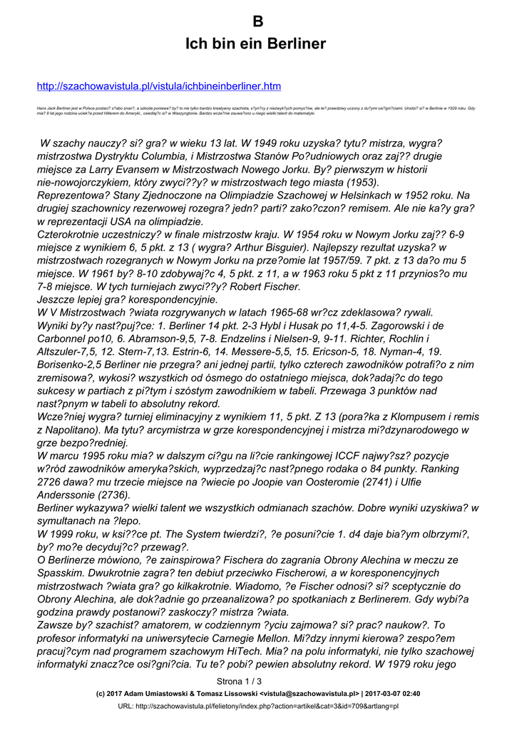 B Ich bin ein Berliner http://szachowavistula.pl/vistula/ichbineinberliner.htm Hans Jack Berliner jest w Polsce postaci? s?abo znan?, a szkoda poniewa? by? to nie tylko bardzo kreatywny szachista, s?yn?cy z niezwyk?ych pomys?ów, ale te? prawdziwy uczony z du?ymi osi?gni?ciami. Urodzi? si? w Berlinie w 1929 roku. Gdy mia? 8 lat jego rodzina uciek?a przed Hitlerem do Ameryki., osiedlaj?c si? w Waszyngtonie. Bardzo wcze?nie zauwa?ono u niego wielki talent do matematyki. W szachy nauczy? si? gra? w wieku 13 lat. W 1949 roku uzyska? tytu? mistrza, wygra? mistrzostwa Dystryktu Columbia, i Mistrzostwa Stanów Po?udniowych oraz zaj?? drugie miejsce za Larry Evansem w Mistrzostwach Nowego Jorku. By? pierwszym w historii nie-nowojorczykiem, który zwyci??y? w mistrzostwach tego miasta (1953). Reprezentowa? Stany Zjednoczone na Olimpiadzie Szachowej w Helsinkach w 1952 roku. Na drugiej szachownicy rezerwowej rozegra? jedn? parti? zako?czon? remisem. Ale nie ka?y gra? w reprezentacji USA na olimpiadzie. Czterokrotnie uczestniczy? w finale mistrzostw kraju. W 1954 roku w Nowym Jorku zaj?? 6-9 miejsce z wynikiem 6, 5 pkt. z 13 ( wygra? Arthur Bisguier). Najlepszy rezultat uzyska? w mistrzostwach rozegranych w Nowym Jorku na prze?omie lat 1957/59. 7 pkt. z 13 da?o mu 5 miejsce. W 1961 by? 8-10 zdobywaj?c 4, 5 pkt. z 11, a w 1963 roku 5 pkt z 11 przynios?o mu 7-8 miejsce. W tych turniejach zwyci??y? Robert Fischer. Jeszcze lepiej gra? korespondencyjnie. W V Mistrzostwach ?wiata rozgrywanych w latach 1965-68 wr?cz zdeklasowa? rywali. Wyniki by?y nast?puj?ce: 1. Berliner 14 pkt. 2-3 Hybl i Husak po 11,4-5. Zagorowski i de Carbonnel po10, 6. Abramson-9,5, 7-8. Endzelins i Nielsen-9, 9-11. Richter, Rochlin i Altszuler-7,5, 12. Stern-7,13. Estrin-6, 14. Messere-5,5, 15. Ericson-5, 18. Nyman-4, 19. Borisenko-2,5 Berliner nie przegra? ani jednej partii, tylko czterech zawodników potrafi?o z nim zremisowa?, wykosi? wszystkich od ósmego do ostatniego miejsca, dok?adaj?c do tego sukcesy w partiach z pi?tym i szóstym zawodnikiem w tabeli. Przewaga 3 punktów nad nast?pnym w tabeli to absolutny rekord. Wcze?niej wygra? turniej eliminacyjny z wynikiem 11, 5 pkt. Z 13 (pora?ka z Klompusem i remis z Napolitano). Ma tytu? arcymistrza w grze korespondencyjnej i mistrza mi?dzynarodowego w grze bezpo?redniej. W marcu 1995 roku mia? w dalszym ci?gu na li?cie rankingowej ICCF najwy?sz? pozycje w?ród zawodników ameryka?skich, wyprzedzaj?c nast?pnego rodaka o 84 punkty. Ranking 2726 dawa? mu trzecie miejsce na ?wiecie po Joopie van Oosteromie (2741) i Ulfie Anderssonie (2736). Berliner wykazywa? wielki talent we wszystkich odmianach szachów. Dobre wyniki uzyskiwa? w symultanach na ?lepo. W 1999 roku, w ksi??ce pt. The System twierdzi?, ?e posuni?cie 1. d4 daje bia?ym olbrzymi?, by? mo?e decyduj?c? przewag?. O Berlinerze mówiono, ?e zainspirowa? Fischera do zagrania Obrony Alechina w meczu ze Spasskim. Dwukrotnie zagra? ten debiut przeciwko Fischerowi, a w koresponencyjnych mistrzostwach ?wiata gra? go kilkakrotnie. Wiadomo, ?e Fischer odnosi? si? sceptycznie do Obrony Alechina, ale dok?adnie go przeanalizowa? po spotkaniach z Berlinerem. Gdy wybi?a godzina prawdy postanowi? zaskoczy? mistrza ?wiata. Zawsze by? szachist? amatorem, w codziennym ?yciu zajmowa? si? prac? naukow?. To profesor informatyki na uniwersytecie Carnegie Mellon. Mi?dzy innymi kierowa? zespo?em pracuj?cym nad programem szachowym HiTech. Mia? na polu informatyki, nie tylko szachowej informatyki znacz?ce osi?gni?cia. Tu te? pobi? pewien absolutny rekord. W 1979 roku jego Strona 1 / 3 (c) 2017 Adam Umiastowski & Tomasz Lissowski <[email protected]> | 2017-03-07 02:40 URL: http://szachowavistula.pl/felietony/index.php?action=artikel&cat=3&id=709&artlang=pl B program BKG 9.8 by wystarczaj?co silny aby rozegra? mecz z aktualnym wówczas mistrzem ?wiata w backgammona (tryktraka) Luigi Vill?.. Komputer wygra? 7-1. To by?o pierwsze zwyci?stwo komputera z mistrzem ?wiata w jakiejkolwiek grze. Napisa? ten program przy okazji, rozwi?zuj?c problemy, które wyst?pi?y w pracach nad programem szachowym. Hans Berliner Obejrzyjmy teraz kilka ciekawych, cho? nie bezb??dnych partii ameryka?skiego szachisty z turnieju, w którym odniós? ?yciowy sukces. Obrona Grunfelda D65a Berliner-Messere 1.d4 Sf6 2. c4 g6 3. Sc3 d5 4. cd S:d5 5. e4 S:c3 6.bc Gg7 7. Gc4 0-0 8. Se2 b6 9. h4!e5?! 10. h5 ed 11. hg hg 12. cd He7 13. Hd3 We8 14. Gh6!Sc6 15. G:g7 k:g7 16. Hd2! He4 17. 0-0-0! He7 18. Hh6+ Kf6 19. Wd3! S:d4 21. W:d4 G:e2 22. Wf4+ 1-0 Obrona Grunfelda D65b Berliner-Hybl 1.d4 Sf6 2. c4 g6 3. Sc3 d5 4. cd S:d5 5. e4 S:c3 6.bc Gg7 7. Gc4 0-0 8. h4!? (TN-Berliner) 8...c5 9. Se2 cd 10. cd Sc6 11. Ge3 Sa5 12. Gd3 Sc6 13. e5 Ha5+ 14.Kf1 Wd8 15. h5 Ge6 16. hg hg 17. Wh4 Wd7 18. Hb1 S:e5 19. de Wad8! 20. Sd4!H:e5 21. Hc2 W:d4 22.W:d4 W:d4 23. G:d4 H:d4 24. Wd1 Hh4 0,5-0,5 Obrona Grunfelda D65b Berliner-Husak Strona 2 / 3 (c) 2017 Adam Umiastowski & Tomasz Lissowski <[email protected]> | 2017-03-07 02:40 URL: http://szachowavistula.pl/felietony/index.php?action=artikel&cat=3&id=709&artlang=pl B 1.d4 Sf6 2. c4 g6 3. Sc3 d5 4. cd S:d5 5. e4 S:c3 6.bc Gg7 7. Gc4 0-0 8. h4!? (TN-Berliner) 8...c5 9. Se2 cd 10. cd Sc6 11. Ge3 Sa5 12. Gd5?Hd6 13. h5 Ge6 14. hg hg 15. G:e6 H:e6 16. f3 Sc4 (16....Wfd8! lepsza czarnych) 17. Gh6 G:h6 18. W:h6 Kg7 19. Hc1 Ha6! 20. Kf2 Wh8 21. W:h8 W:h8 22. Wc1 b5 22. Hc3 Wc8 23. Wc1 b5 24. d5+ f6 25. Hd4 Ha3 26. Wh1 Se5 27. He3 H:e3 28. K:e3 Wc2 29. Sd4 Sc4+ 30. Kd3 W:g2 31. S:b5 Se5+ 32. Ke3 W:a2 33. Wc1 f5 0,5-0,5 Pawe? Kruza i Adam Umiastowski Unikalny ID rozwi?zania: #1708 Autor: : polbase Data ostatniej aktualizacji: 2015-12-11 12:27 Strona 3 / 3 (c) 2017 Adam Umiastowski & Tomasz Lissowski <[email protected]> | 2017-03-07 02:40 URL: http://szachowavistula.pl/felietony/index.php?action=artikel&cat=3&id=709&artlang=pl Powered by TCPDF (www.tcpdf.org)