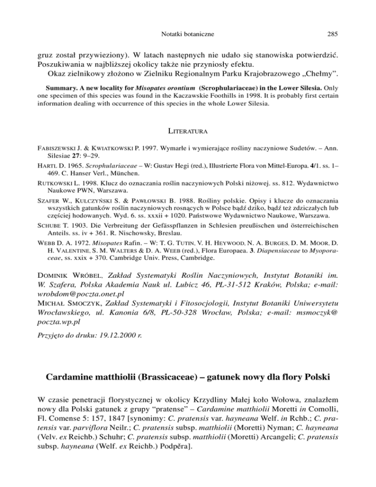 Notatki botaniczne 285 gruz został przywieziony). W latach naste˛pnych nie udało sie˛ stanowiska potwierdzić. Poszukiwania w najbliższej okolicy także nie przyniosły efektu. Okaz zielnikowy złożono w Zielniku Regionalnym Parku Krajobrazowego „Chełmy”. Summary. A new locality for Misopates orontium (Scrophulariaceae) in the Lower Silesia. Only one specimen of this species was found in the Kaczawskie Foothills in 1998. It is probably first certain information dealing with occurrence of this species in the whole Lower Silesia. LITERATURA F ABISZEWSKI J. & KWIATKOWSKI P. 1997. Wymarłe i wymieraja˛ce rośliny naczyniowe Sudetów. – Ann. Silesiae 27: 9–29. HARTL D. 1965. Scrophulariaceae – W: Gustav Hegi (red.), Illustrierte Flora von Mittel-Europa. 4/1. ss. 1– 469. C. Hanser Verl., München. RUTKOWSKI L. 1998. Klucz do oznaczania roślin naczyniowych Polski niżowej. ss. 812. Wydawnictwo Naukowe PWN, Warszawa. S ZAFER W., KULCZYŃSKI S. & PAWŁOWSKI B. 1988. Rośliny polskie. Opisy i klucze do oznaczania wszystkich gatunków roślin naczyniowych rosna˛cych w Polsce ba˛dź dziko, ba˛dź też zdziczałych lub cze˛ściej hodowanych. Wyd. 6. ss. xxxii + 1020. Państwowe Wydawnictwo Naukowe, Warszawa. S CHUBE T. 1903. Die Verbreitung der Gefässpflanzen in Schlesien preußischen und österreichischen Anteils. ss. iv + 361. R. Nischowsky, Breslau. WEBB D. A. 1972. Misopates Rafin. – W: T. G. TUTIN, V. H. HEYWOOD, N. A. BURGES, D. M. MOOR, D. H. VALENTINE, S. M. WALTERS & D. A. WEEB (red.), Flora Europaea. 3. Diapensiaceae to Myoporaceae, ss. xxix + 370. Cambridge Univ. Press, Cambridge. D OMINIK WRÓBEL, Zakład Systematyki Roślin Naczyniowych, Instytut Botaniki im. W. Szafera, Polska Akademia Nauk ul. Lubicz 46, PL-31-512 Kraków, Polska; e-mail: [email protected] MICHAŁ SMOCZYK, Zakład Systematyki i Fitosocjologii, Instytut Botaniki Uniwersytetu Wrocławskiego, ul. Kanonia 6/8, PL-50-328 Wrocław, Polska; e-mail: msmoczyk@ poczta.wp.pl Przyje˛to do druku: 19.12.2000 r. Cardamine matthiolii (Brassicaceae) – gatunek nowy dla flory Polski W czasie penetracji florystycznej w okolicy Krzydliny Małej koło Wołowa, znalazłem nowy dla Polski gatunek z grupy “pratense” – Cardamine matthiolii Moretti in Comolli, Fl. Comense 5: 157, 1847 [synonimy: C. pratensis var. hayneana Welf. in Rchb.; C. pratensis var. parviflora Neilr.; C. pratensis subsp. matthiolii (Moretti) Nyman; C. hayneana (Velv. ex Reichb.) Schuhr; C. pratensis subsp. matthiolii (Moretti) Arcangeli; C. pratensis subsp. hayneana (Welf. ex Reichb.) Podpěra]. 286 Fragm. Flor. Geobot. Polonica 8, 2001 Roślina ta ma 20–50 cm wysokości, zwykle bogato rozgałe˛ziona cze˛sto od nasady, rzadziej słabo, a tylko na suchszych siedliskach wyste˛puja˛ formy o niskich nierozgałe˛zionych łodygach. Liście odziomkowe z 3–6 parami listków bocznych, odwrotnie jajowatych, z odcinkami szczytowymi nieco wie˛kszymi, podczas kwitnienia sa˛ obumarłe. Liście łodygowe maja˛ 6–12 odcinków bocznych, siedza˛cych, podłużnie lancetowatych. Kwiatostan licznokwiatowy (20–25 kwiatów). Działki 2–3 cm długie. Płatki białe, 5,5–8 mm długie. Pre˛ciki bladożółte, łuszczyna z 36–46 nasionami, wa˛ska (1–2,5 mm szeroka), 18–32 mm długa. Liczba chromosomów: 2n = 16. Okazy z Dolnego Śla˛ska, posiadaja˛ łodygi zabarwione w dolnej trzeciej cze˛ści fioletowo. Cecha ta nie była podawana w dotychczasowych opisach (Ryc. 1). Ryc. 1 (Fig. 1). Cardamine matthiolii Moretti – pokrój (habit). Notatki botaniczne 287 Ryc. 2 (Fig. 2). Stanowisko (Locality of) Cardamine matthiolii Moretti. Gatunek opisany z Włoch, stwierdzony na Półwyspie Bałkańskim, z wyja˛tkiem Grecji, wyste˛puje także na południe od łuku Karpat i Sudetów od Rumunii po Austrie˛, w Niemczech i Francji. Ranga taksonomiczna rzeżuchy Mattiola jest sporna. Ma to odbicie w bogatej synonimice taksonu. Dawniejsi floryści nadawali jej cze˛sto range˛ odmiany lub podgatunku w obre˛bie szeroko uje˛tego gatunku Cardamine pratensis L. (MARKGRAF 1958). JONES (1964) i TOMŠOVIC (1992) uznaja˛ go za dobry gatunek. Nowy gatunek został znaleziony na stanowisku na NE od Krzydliny Małej, na SW od Wołowa (BE25) (Ryc. 2), na wilgotnej ła˛ce, która znajduje sie˛ na skłonie o niewielkim nachyleniu, ekspozycji wschodniej i sprawia wrażenie naturalnego. Teren ten należy do mezoregionu Wysoczyzny Rościsławickiej, położonej mie˛dzy Wzgórzami Trzebnickimi a Pradolina˛ Wrocławska˛ i stanowi północno-zachodnia˛ cze˛ść Niziny Śla˛skiej (K ONDRACKI 1977). Omawianemu gatunkowi towarzysza˛: Ophioglossum vulgatum L., Caltha palustris L., Ranunculus acris L., Lychnis flos-cuculi L., Rumex acetosa L., Saxifraga granulata L., Lathyrus pratensis L., Succisa pratensis Moench., Achillea millefolium L. s. stricto, Cirsium canum (L.) All., C. palustre (L.) Scop., Dactylorhiza majalis (Rchb.) Hunt. & Summ., Carex nigra (L.) Reichard, C. hartmanii Cajander, C. panicea L., Alopecurus pratensis L., Holcus lanatus L. i Molinia coerulea (L.) Moench. Cardamine matthiolii różni sie˛ od C. pratensis s. stricto i C. dentata rozgałe˛zionymi, zwykle licznymi łodygami, białymi kwiatami poniżej 8 mm długości, brakiem liści odziomkowych w czasie kwitnienia i nasionami do 1,2 mm długimi (TOMŠOVIC 1992). Summary. Cardamine matthiolii (Brassicaceae) – species new for Poland. Cardamine matthiolii Moretti, species new to Poland was found near Krzydlina Mała, Wołów commune (Dolny Śla˛sk Province). The station seems to be natural. The description of species and habitat characteristic is also given. 288 Fragm. Flor. Geobot. Polonica 8, 2001 LITERATURA J ONES B. M. G. 1964. Cardamine L. – W: T. G. TUTIN, V. H. HEYWOOD, N. A. BURGES, S. M. WALTERS & D. A. WEBB. Flora Europaea 1, ss. 285–289. Cambridge Univ. Press, Cambridge. KONDRACKI J. 1977. Rejony fizyczno-geograficzne Polski. ss. 178. Wydawnictwo Uniwersytetu Warszawskieg