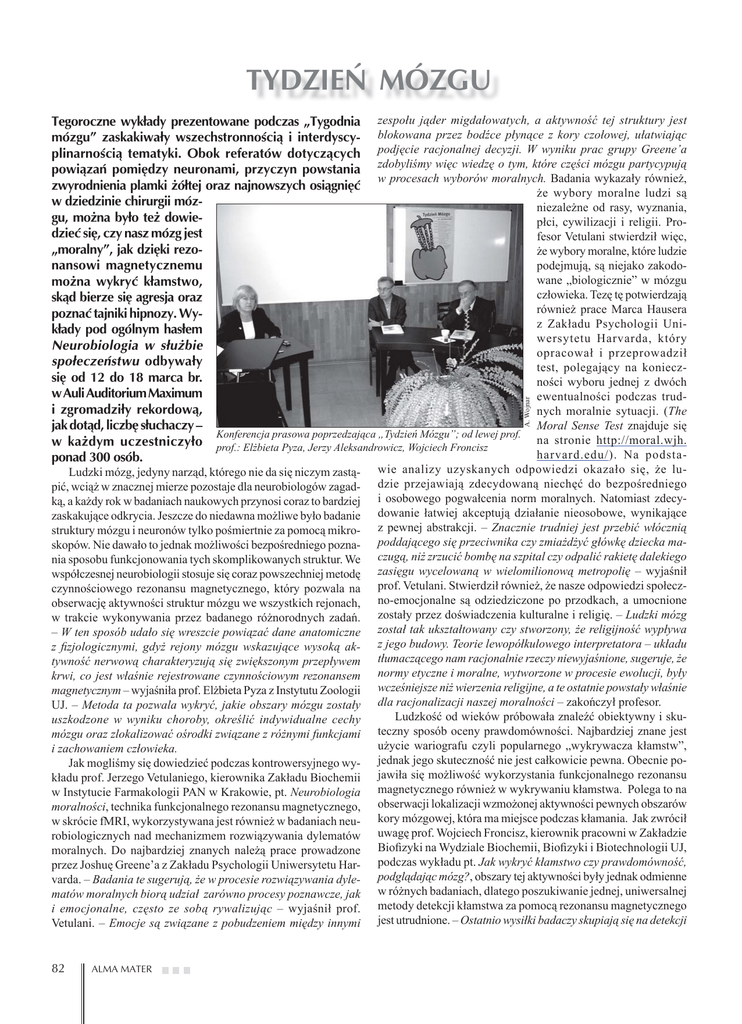 TYDZIEŃ MÓZGU A. Wojnar Tegoroczne wykłady prezentowane podczas „Tygodnia zespołu jąder migdałowatych, a aktywność tej struktury jest mózgu” zaskakiwały wszechstronnością i interdyscy- blokowana przez bodźce płynące z kory czołowej, ułatwiając plinarnością tematyki. Obok referatów dotyczących podjęcie racjonalnej decyzji. W wyniku prac grupy Greene’a powiązań pomiędzy neuronami, przyczyn powstania zdobyliśmy więc wiedzę o tym, które części mózgu partycypują w procesach wyborów moralnych. Badania wykazały również, zwyrodnienia plamki żółtej oraz najnowszych osiągnięć że wybory moralne ludzi są w dziedzinie chirurgii mózniezależne od rasy, wyznania, gu, można było też dowiepłci, cywilizacji i religii. Prodzieć się, czy nasz mózg jest fesor Vetulani stwierdził więc, „moralny”, jak dzięki rezoże wybory moralne, które ludzie nansowi magnetycznemu podejmują, są niejako zakodowane „biologicznie” w mózgu można wykryć kłamstwo, człowieka. Tezę tę potwierdzają skąd bierze się agresja oraz również prace Marca Hausera poznać tajniki hipnozy. Wyz Zakładu Psychologii Unikłady pod ogólnym hasłem wersytetu Harvarda, który Neurobiologia w służbie opracował i przeprowadził społeczeństwu odbywały test, polegający na konieczsię od 12 do 18 marca br. ności wyboru jednej z dwóch w Auli Auditorium Maximum ewentualności podczas trudi zgromadziły rekordową, nych moralnie sytuacji. (The jak dotąd, liczbę słuchaczy – Moral Sense Test znajduje się Konferencja prasowa poprzedzająca „Tydzień Mózgu”; od lewej prof. na stronie http://moral.wjh. w każdym uczestniczyło prof.: Elżbieta Pyza, Jerzy Aleksandrowicz, Wojciech Froncisz harvard.edu/). Na podstaponad 300 osób. Ludzki mózg, jedyny narząd, którego nie da się niczym zastąpić, wciąż w znacznej mierze pozostaje dla neurobiologów zagadką, a każdy rok w badaniach naukowych przynosi coraz to bardziej zaskakujące odkrycia. Jeszcze do niedawna możliwe było badanie struktury mózgu i neuronów tylko pośmiertnie za pomocą mikroskopów. Nie dawało to jednak możliwości bezpośredniego poznania sposobu funkcjonowania tych skomplikowanych struktur. We współczesnej neurobiologii stosuje się coraz powszechniej metodę czynnościowego rezonansu magnetycznego, który pozwala na obserwację aktywności struktur mózgu we wszystkich rejonach, w trakcie wykonywania przez badanego różnorodnych zadań. – W ten sposób udało się wreszcie powiązać dane anatomiczne z fizjologicznymi, gdyż rejony mózgu wskazujące wysoką aktywność nerwową charakteryzują się zwiększonym przepływem krwi, co jest właśnie rejestrowane czynnościowym rezonansem magnetycznym – wyjaśniła prof. Elżbieta Pyza z Instytutu Zoologii UJ. – Metoda ta pozwala wykryć, jakie obszary mózgu zostały uszkodzone w wyniku choroby, określić indywidualne cechy mózgu oraz zlokalizować ośrodki związane z różnymi funkcjami i zachowaniem człowieka. Jak mogliśmy się dowiedzieć podczas kontrowersyjnego wykładu prof. Jerzego Vetulaniego, kierownika Zakładu Biochemii w Instytucie Farmakologii PAN w Krakowie, pt. Neurobiologia moralności, technika funkcjonalnego rezonansu magnetycznego, w skrócie fMRI, wykorzystywana jest również w badaniach neurobiologicznych nad mechanizmem rozwiązywania dylematów moralnych. Do najbardziej znanych należą prace prowadzone przez Joshuę Greene’a z Zakładu Psychologii Uniwersytetu Harvarda. – Badania te sugerują, że w procesie rozwiązywania dylematów moralnych biorą udział zarówno procesy poznawcze, jak i emocjonalne, często ze sobą rywalizując – wyjaśnił prof. Vetulani. – Emocje są związane z pobudzeniem między innymi 82 ALMA MATER wie analizy uzyskanych odpowiedzi okazało się, że ludzie przejawiają zdecydowaną niechęć do bezpośredniego i osobowego pogwałcenia norm moralnych. Natomiast zdecydowanie łatwiej akceptują działanie nieosobowe, wynikające z pewnej abstrakcji. – Znacznie trudniej jest przebić włócznią poddającego się przeciwnika czy zmiażdżyć główkę dziecka maczugą, niż zrzucić bombę na szpital czy odpalić rakietę dalekiego zasięgu wycelowaną w wielomilionową metropolię – wyjaśnił prof. Vetulani. Stwierdził również, że nasze odpowiedzi społeczno-emocjonalne są odziedziczone po przodkach, a umocnione zostały przez doświadczenia kulturalne i religię. – Ludzki mózg został tak ukształtowany czy stworzony, że religijność wypływa z jego budowy. Teorie lewopółkulowego interpretatora – układu tłumaczącego nam racjonalnie rzeczy niewyjaśnione, sugeruje, że normy etyczne i moralne, wytworzone w procesie ewolucji, były wcześniejsze niż wierzenia religijne, a te ostatnie powstały właśnie dla racjonalizacji naszej moralności – zakończył profesor. Ludzkość od wieków próbowała znaleźć obiektywny i skuteczny sposób oceny prawdomówności. Najbardziej znane jest użycie wariografu czyli popularnego „wykrywacza kłamstw”, jednak jego skuteczność nie jest całkowicie pewna. Obecnie pojawiła się możliwość wykorzystania funkcjonalnego rezonansu magnetycznego również w wykrywaniu kłamstwa. Polega to na obserwacji lokalizacji wzmożonej aktywności pewnych obszarów kory mózgowej, która ma miejsce podczas kłamania. Jak zwrócił uwagę prof. Wojciech Froncisz, kierownik pracowni w Zakładzie Biofizyki na Wydziale Biochemii, Biofizyki i Biotechnologii UJ, podczas wykładu pt. Jak wykryć kłamstwo czy prawdomówność, podglądając mózg?, obszary tej aktywności były jednak odmienne w różnych badaniach, dlatego poszukiwanie jednej, uniwersalnej metody detekcji kłamstwa za pomocą rezonansu magnetycznego jest utrudnione. – Ostatnio wysiłki badaczy skupiają się na detekcji A. Wojnar tzw. korelatów kłamania dla pojedynczych osób, a nie na uśrednio- dany człowiek został wychowany oraz fun