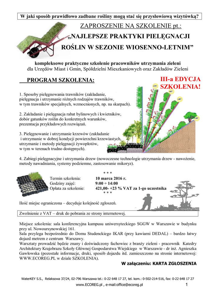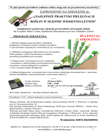 W jaki sposób prawidłowo zadbane rośliny mogą stać się przysłowiową wizytówką? ZAPROSZENIE NA SZKOLENIE pt.: „NAJLEPSZE PRAKTYKI PIELĘGNACJI ROŚLIN W SEZONIE WIOSENNO-LETNIM” kompleksowe praktyczne szkolenie pracowników utrzymania zieleni dla Urzędów Miast i Gmin, Spółdzielni Mieszkaniowych oraz Zakładów Zieleni III-a EDYCJA SZKOLENIA! PROGRAM SZKOLENIA: 1. Sposoby pielęgnowania trawników (zakładanie, pielęgnacja i utrzymanie różnych rodzajów trawników, w tym trawników specjalnych, wzmocnionych, np. na skarpach). 2. Zakładanie i pielęgnacja rabat bylinowych i kwietników, dobór gatunków roślin do konkretnych warunków, prezentacja przykładowych rozwiązań. 3. Pielęgnowanie i utrzymanie krzewów (zakładanie i utrzymanie w dobrej kondycji powierzchni krzewiastych, utrzymanie i metody pielęgnacji żywopłotów, w tym w terenach trudno dostępnych). 4. Zabiegi pielęgnacyjne i utrzymania drzew (nowoczesne technologie utrzymania drzew - nawożenie, metody nawadniania, systemy podziemne, zastosowanie mikoryz). Termin szkolenia: Godziny zajęć: Opłata za szkolenie: *** 10 marca 2016 r. 9:00 ÷ 14:00 421,00- +23 % VAT za 1-go uczestnika *** Ilość miejsc ograniczona – decyduje kolejność zgłoszeń. Zwolnienie z VAT – druk do pobrania ze strony internetowej. Miejsce szkolenia: sala konferencyjna kampusu uniwersyteckiego SGGW w Warszawie w budynku przy ul. Nowoursynowskiej 161. Sala przylega bezpośrednio do Domu Studenckiego IKAR (przy kawiarni DEDAL) – bardzo łatwy dojazd metrem z centrum Warszawy. Warsztaty prowadzić będzie znany i doświadczony fachowiec z branży zieleni - pracownik Katedry Architektury Krajobrazu Szkoły Głównej Gospodarstwa Wiejskiego w Warszawie - dr inż. Agnieszka Gawłowska (pozostałe informacje, druki, sposób dojazdu itd. zamieszczono na stronie internetowej: WWW.ECOREG.PL w dziale SZKOLENIA). W załączeniu: KARTA ZGŁOSZENIA WaterKEY S.S., Relaksowa 37/24, 02-796 Warszawa tel.: 0-22 648 17 27, tel. kom.: 0-502-214-516, fax: 0-22 648 17 27 www.ECOREG.pl , e-mail:[email protected] 1 Karta zgłoszenia uczestnictwa na szkolenie: „Najlepsze praktyki pielęgnacji roślin w sezonie wiosenno-letnim" w dniu 10 marca 2016 r. Kartę zgłoszenia uczestnictwa prosimy wysłać faksem do firmy WaterKEY na numer 0-22/ 648-17-27 Lp. Imię i nazwisko 1 2 … w przypadku udziału więcej niż dwóch osób w szkoleniu udzielane są rabaty Zgłaszający……………………………………………………………………………………… ....................................................................................................................................................... Adres zakładu pracy (ulica, nr domu, kod pocztowy) ....................................................................................................................................................... (kier) nr telefonu nr faxu e-mail (do wysłania potwierdzenia) Dojazd do miejsca szkolenia – patrz strona internetowa(w stopce). Ewentualna rezerwacja pokoi hotelowych pozostaje w gestii uczestników. Najbliższe hotele: Hotel IKAR (Dom Asystenta) - tel.: 0-22/ 847 29 03, 0-22/ 59 33 700, Hotel ATOS 0-22 841 10 43, Hotel ARAMIS 0-22 742 18 95. Warunkiem niezbędnym uczestnictwa w szkoleniu, jest nadesłanie wypełnionej karty zgłoszeniowej do dnia 4.03.2016 r oraz wniesienie opłaty za pojedynczego uczestnika szkolenia w wysokości 421,00 zł+ 23% VAT = 517,83 zł do dnia 4.03.2016 r. Ze względów organizacyjnych prosimy o dokonywanie przedpłaty za szkolenie dopiero w miesiącu marcu 2016 r. W ramach opłaty organizator zapewnia obiad, ciastka i napoje (przerwy kawowe). Uczestnicy szkolenia otrzymają materiały szkoleniowe i świadectwo ukończenia szkolenia. Uwaga: wybierz kwotę bez VAT w przypadku finansowania szkolenia w 100% ze środków publicznych (druk zwolnienia z VAT należy przywieźć w oryginale na szkolenie). Koszt uczestnictwa w wysokości: 421,00 zł lub 517,83 zł x ..........(ilość osób) = ...............................zł przekazuję na konto: WaterKEY S.S., ul. Relaksowa 37/24, 02-796 Warszawa Bank: BZWBK W-wa, nr konta: 50 1090 1694 0000 0001 0513 4458 tytułem "Pielęgnacja roślin" Uwaga: warunkiem prawidłowego zaksięgowania wpłaty jest podanie na przelewie pełnej nazwy i adresu instytucji/firmy zgłaszającej Nasz nr NIP: ............................................................... UWAGA: Po dokonaniu zgłoszenia, ewentualna późniejsza rezygnacja z uczestnictwa w szkoleniu i zwrot należności, możliwy będzie wyłącznie do dnia 4.03.2016 r, do godz.15-ej, na podstawie pisemnego zawiadomienia rezygnującego. W związku z koniecznością poniesienia kosztów organizacyjnych, po tym terminie zwrot pełnej należności nie będzie możliwy. Za uczestnictwo w szkoleniu zostanie wystawiona faktura VAT. Organizator ma prawo odwołać szkolenie z przyczyn niezależnych lub w przypadku małej liczby zgłoszeń. W takim przypadku Strona Zamawiająca otrzyma pełny zwrot wpłaconej kwoty. ……………………… Pieczęć zakładu pracy ………………….. Data ………………………………………. Podpis kierownika instytucji zgłaszającej WaterKEY S.S., Relaksowa 37/24, 02-796 Warszawa tel.: 0-22 648 17 27, tel. kom.: 0-502-214-516, fax: 0-22 648 17 27 www.ECOREG.pl , e-mail:[email protected] 2