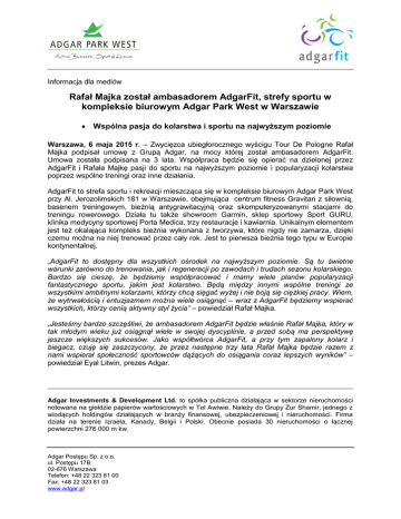 Informacja dla mediów Rafał Majka został ambasadorem AdgarFit, strefy sportu w kompleksie biurowym Adgar Park West w Warszawie Wspólna pasja do kolarstwa i sportu na najwyższym poziomie Warszawa, 6 maja 2015 r. – Zwycięzca ubiegłorocznego wyścigu Tour De Pologne Rafał Majka podpisał umowę z Grupą Adgar, na mocy której został ambasadorem AdgarFit. Umowa została podpisana na 3 lata. Współpraca będzie się opierać na dzielonej przez AdgarFit i Rafała Majkę pasji do sportu na najwyższym poziomie i popularyzacji kolarstwa poprzez wspólne treningi oraz inne działania. AdgarFit to strefa sportu i rekreacji mieszcząca się w kompleksie biurowym Adgar Park West przy Al. Jerozolimskich 181 w Warszawie, obejmująca centrum fitness Gravitan z siłownią, basenem treningowym, bieżnią antygrawitacyjną oraz skomputeryzowanymi stacjami do treningu rowerowego. Działa tu także showroom Garmin, sklep sportowy Sport GURU, klinika medycyny sportowej Porta Medica, trzy restauracje i kawiarnia. Unikalnym elementem jest też okalająca kompleks bieżnia wykonana z tworzywa, które nigdy nie zamarza, dzięki czemu można na niej trenować przez cały rok. Jest to pierwsza bieżnia tego typu w Europie kontynentalnej. „AdgarFit to dostępny dla wszystkich ośrodek na najwyższym poziomie. Są tu świetne warunki zarówno do trenowania, jak i regeneracji po zawodach i trudach sezonu kolarskiego. Bardzo się cieszę, że będziemy współpracować i mamy wiele planów popularyzacji fantastycznego sportu, jakim jest kolarstwo. Będą między innymi wspólne treningi ze wszystkimi ambitnymi kolarzami, którzy chcą sięgać wyżej i nie boją się ciężkiej pracy. Wiem, że wytrwałością i entuzjazmem można wiele osiągnąć – wraz z AdgarFit będziemy wspierać wszystkich, którzy cenią aktywny styl życia” – powiedział Rafał Majka. „Jesteśmy bardzo szczęśliwi, że ambasadorem AdgarFit będzie właśnie Rafał Majka, który w tak młodym wieku już osiągnął wiele w swojej dyscyplinie, a przed sobą ma perspektywę jeszcze większych sukcesów. Jako współtwórca AdgarFit, a przy tym zapalony kolarz i biegacz, czuję się zaszczycony, że przez następne trzy lata Rafał Majka będzie razem z nami wspierał społeczność sportowców dążących do osiągania coraz lepszych wyników” – powiedział Eyal Litwin, prezes Adgar. Adgar Investments & Development Ltd. to spółka publiczna działająca w sektorze nieruchomości notowana na giełdzie papierów wartościowych w Tel Awiwie. Należy do Grupy Zur Shamir, jednego z wiodących holdingów działających w branży finansowej, ubezpieczeniowej i nieruchomości. Firma działa na terenie Izraela, Kanady, Belgii i Polski. Obecnie posiada 30 nieruchomości o łącznej powierzchni 276 000 m kw. Adgar Postępu Sp. z o.o. ul. Postępu 17B 02-676 Warszawa Telefon: +48 22 323 81 00 Fax: +48 22 323 81 03 www.adgar.pl W Polsce Adgar działa za pośrednictwem spółek córek o nazwach Adgar Postępu sp. z o.o., Adgar BCI Sp. z o.o. sp. k., Adgar BCII Sp. z o.o. sp. k., Adgar BCIII Sp. z o.o. sp. k. oraz Adgar BCIV Sp. z o.o. sp. k. Firma jest deweloperem i zarządcą jednego z najnowocześniejszych obiektów biurowych w Warszawie, czyli Adgar Plaza, który łącznie z Adgar Business Centre tworzy Kompleks Adgar Plaza. Grupa Adgar posiada w swoim portfolio także budynek biurowy Adgar Business Centre II oraz nieruchomość przy Alei Prymasa Tysiąclecia na Woli, na której znajduje się salon oraz punkt serwisowy BMW Inchcape. W czerwcu 2013 roku Grupa Adgar kupiła Ochota Office Park usytuowany przy Alejach Jerozolimskich w Warszawie, który od listopada 2013 roku funkcjonuje pod nazwą Adgar Park West. Ostatnim nabytkiem w portfelu firmy jest Adgar Wave przy ul. Rzymowskiego 53 w dzielnicy biznesowej na warszawskim Mokotowie. Więcej informacji na temat Grupy Adgar w Polsce pod adresem: www.adgar.pl Dodatkowych informacji udziela: Questia Sp. z o.o. sp.k. Communications Management Consultants Aleksandra Kwiatkowska, [email protected], tel.: +48 22 623 07 00, +48 535 222 019 Anna Hadrych, [email protected], tel.: +48 22 623 07 00 Adgar Postępu Sp. z o.o. ul. Postępu 17B 02-676 Warszawa Telefon: +48 22 323 81 00 Fax: +48 22 323 81 03 www.adgar.pl