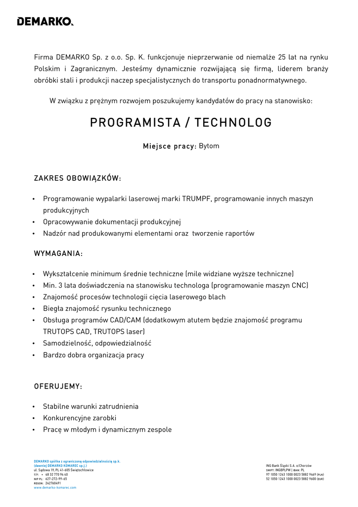 Firma DEMARKO Sp. z o.o. Sp. K. funkcjonuje nieprzerwanie od niemalże 25 lat na rynku Polskim i Zagranicznym. Jesteśmy dynamicznie rozwijającą się firmą, liderem branży obróbki stali i produkcji naczep specjalistycznych do transportu ponadnormatywnego. W związku z prężnym rozwojem poszukujemy kandydatów do pracy na stanowisko: PROGRAMISTA / TECHNOLOG Miejsce pracy: Bytom ZAKRES OBOWIĄZKÓW: • Programowanie wypalarki laserowej marki TRUMPF, programowanie innych maszyn produkcyjnych • Opracowywanie dokumentacji produkcyjnej • Nadzór nad produkowanymi elementami oraz tworzenie raportów WYMAGANIA: • Wykształcenie minimum średnie techniczne (mile widziane wyższe techniczne) • Min. 3 lata doświadczenia na stanowisku technologa (programowanie maszyn CNC) • Znajomość procesów technologii cięcia laserowego blach • Biegła znajomość rysunku technicznego • Obsługa programów CAD/CAM (dodatkowym atutem będzie znajomość programu TRUTOPS CAD, TRUTOPS laser) • Samodzielność, odpowiedzialność • Bardzo dobra organizacja pracy OFERUJEMY: • Stabilne warunki zatrudnienia • Konkurencyjne zarobki • Pracę w młodym i dynamicznym zespole Zainteresowane osoby prosimy o przesłanie Aplikacji (CV ze zdjęciem + List motywacyjny) na adres: [email protected] Prosimy o zamieszczenie klauzuli: „ Wyrażam zgodę na przetwarzanie moich danych przez firmę DEMARKO spółka z ograniczoną odpowiedzialnością spółka komandytowa dla potrzeb niezbędnych do realizacji procesu rekrutacji (zgodnie z Ustawą z dnia 29.08.1997 o ochronie danych osobowych Dz. U. z 1997 nr 133, poz. 883)”. Uprzejmie informujemy, iż skontaktujemy się wyłącznie z wybranymi kandydatami.