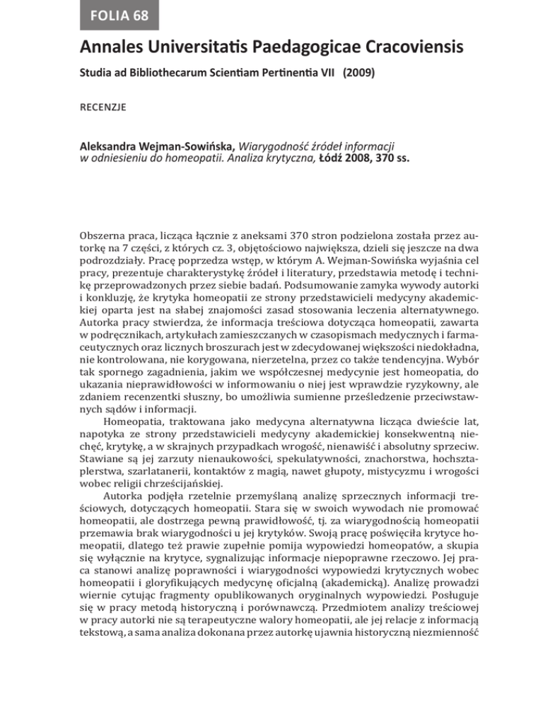 Folia 68 Annales Universitatis Paedagogicae Cracoviensis Studia ad Bibliothecarum Scientiam Pertinentia VII (2009) RECENZJE Aleksandra Wejman-Sowińska, Wiarygodność źródeł informacji w odniesieniu do homeopatii. Analiza krytyczna, Łódź 2008, 370 ss. Obszerna praca, licząca łącznie z aneksami 370 stron podzielona została przez autorkę na 7 części, z których cz. 3, objętościowo największa, dzieli się jeszcze na dwa podrozdziały. Pracę poprzedza wstęp, w którym A. Wejman-Sowińska wyjaśnia cel pracy, prezentuje charakterystykę źródeł i literatury, przedstawia metodę i technikę przeprowadzonych przez siebie badań. Podsumowanie zamyka wywody autorki i konkluzję, że krytyka homeopatii ze strony przedstawicieli medycyny akademickiej oparta jest na słabej znajomości zasad stosowania leczenia alternatywnego. Autorka pracy stwierdza, że informacja treściowa dotycząca homeopatii, zawarta w podręcznikach, artykułach zamieszczanych w czasopismach medycznych i farmaceutycznych oraz licznych broszurach jest w zdecydowanej większości niedokładna, nie kontrolowana, nie korygowana, nierzetelna, przez co także tendencyjna. Wybór tak spornego zagadnienia, jakim we współczesnej medycynie jest homeopatia, do ukazania nieprawidłowości w informowaniu o niej jest wprawdzie ryzykowny, ale zdaniem recenzentki słuszny, bo umożliwia sumienne prześledzenie przeciwstawnych sądów i informacji. Homeopatia, traktowana jako medycyna alternatywna licząca dwieście lat, napotyka ze strony przedstawicieli medycyny akademickiej konsekwentną niechęć, krytykę, a w skrajnych przypadkach wrogość, nienawiść i absolutny sprzeciw. Stawiane są jej zarzuty nienaukowości, spekulatywności, znachorstwa, hochsztaplerstwa, szarlatanerii, kontaktów z magią, nawet głupoty, mistycyzmu i wrogości wobec religii chrześcijańskiej. Autorka podjęła rzetelnie przemyślaną analizę sprzecznych informacji treściowych, dotyczących homeopatii. Stara się w swoich wywodach nie promować homeopatii, ale dostrzega pewną prawidłowość, tj. za wiarygodnością homeopatii przemawia brak wiarygodności u jej krytyków. Swoją pracę poświęciła krytyce homeopatii, dlatego też prawie zupełnie pomija wypowiedzi homeopatów, a skupia się wyłącznie na krytyce, sygnalizując informacje niepoprawne rzeczowo. Jej praca stanowi analizę poprawności i wiarygodności wypowiedzi krytycznych wobec homeopatii i gloryfikujących medycynę oficjalną (akademicką). Analizę prowadzi wiernie cytując fragmenty opublikowanych oryginalnych wypowiedzi. Posługuje się w pracy metodą historyczną i porównawczą. Przedmiotem analizy treściowej w pracy autorki nie są terapeutyczne walory homeopatii, ale jej relacje z informacją tekstową, a sama analiza dokonana przez autorkę ujawnia historyczną niezmienność [276] Maria Pidłypczak-Majerowicz zarzutów wobec homeopatii, które pomimo rozwoju nauk medycznych są nadal obarczone tym samym błędem, czyli brakiem wiarygodności. Analizuje literaturę polską i niemiecką, wydobywając z niej te fragmenty, które najpełniej oddają krytyczność sądów oponentów homeopatii. Dostrzega, że w obecnej polskiej wielosegmentowej rzeczywistości informacyjnej brakuje kompletnego opracowania analizującego wiarygodność kontrargumentacji kierowanej ku homeopatii. Wzrost zainteresowania homeopatią w Polsce po 1989 r. wyzwolił dwa prądy: ze strony zwolenników homeopatii nie ma sugestii, żeby medycynę akademicką zastąpić homeopatią, natomiast po stronie opozycji nadal występuje dezawuowanie i próby eliminacji homeopatii ze społecznej świadomości. Opozycja posługuje się prostym i wypróbowanym środkiem – argumentacją zniekształcającą realia homeopatii oraz pozorowaniem funkcji informacyjnej, tworząc w ten sposób bezużyteczny balast w postaci nieuprawnionych i niepełnych danych. Autorka słusznie podnosi fakt, iż współczesne (także minione, historyczne) społeczeństwo informacyjne kształtuje swoją wiedzę na podstawie informacji i steruje swoimi działaniami, również poprzez wiedzę. Manipulacja wiedzą o homeopatii ze strony opozycji polega na przeciwstawianiu rzekomych błędów homeopatii racjonalnym założeniom medycyny akademickiej. Efekt błędnej informacji o homeopatii wzmacniają mylne pojęcia o niej w bibliografiach i katalogach bibliotecznych. Prawidłowa natomiast informacja cechuje się relewancją, pertynencją, kompletnością i wiarygodnością, wymaga partnerstwa – od twórcy poprzez przekaziciela do odbiorcy. Dwieście lat zainteresowania homeopatią przyniosło wielką liczbę publikacji wzajemnie się zwalczających, strony używają jako argumentów informacji mylnych, nieprecyzyjnych, godzących nie w meritum homeopatii, a w jej apologetów. Homeopatia jest dla A. Wejman-Sowińskiej zidentyfikowanym problemem informacyjnym, którego naświetlenia i zrozumienia szuka w wybranych dokumentach polskich i obcojęzycznych, odnalezionych w bibliotekach państwowych i zbiorach prywatnych. W podsumowaniu autorka podkreśla fakt, że medycyna akademicka była wobec homeopatii tak samo krytyczna w XIX w., jak w minionym dwudziestym stuleciu. We współczesnej krytyce homeopatii powtarza się wszystkie wcześniejsze antyhomeopatyczne argumentacje, co w znacznym stopniu zaciemnia rzeczową informację o medycynie alternatywnej. W podsumowaniu swoich sądów autorka podkreśla także problem towarzyszący gromadzeniu źródeł informacji o homeopatii. Dotyczy on stanowiska bibliotek i bibliotekarzy wobec informacji o homeopatii. Autorka słusznie tu zauważa, że materiał informacyjny o tej formie leczenia alternatywnego jest ciągle niezbyt liczny i bibliotekarze pozbawieni są możliwości udzielania merytorycznych informacji na podstawie własnych, szczupłych zazwyczaj i gromadzonych doraźnie, materiałów informacyjnych. Rozdziały pracy wprowadzają do terminologii, która używana jest w k