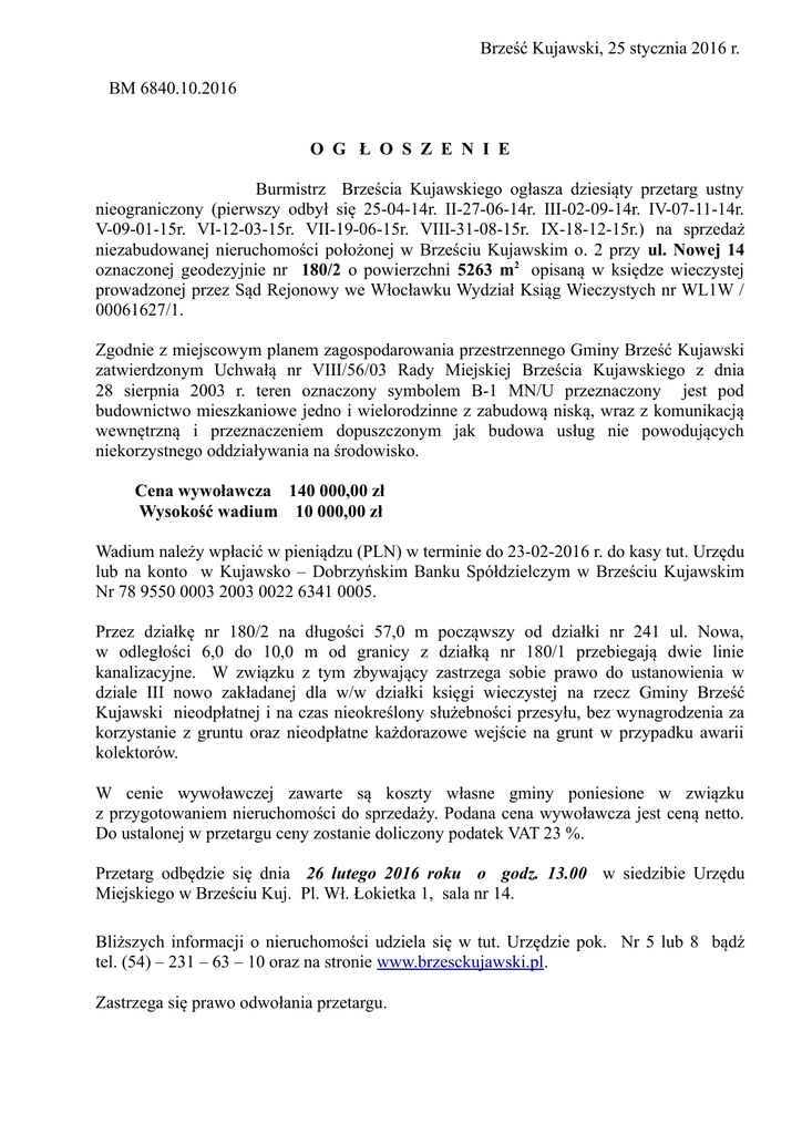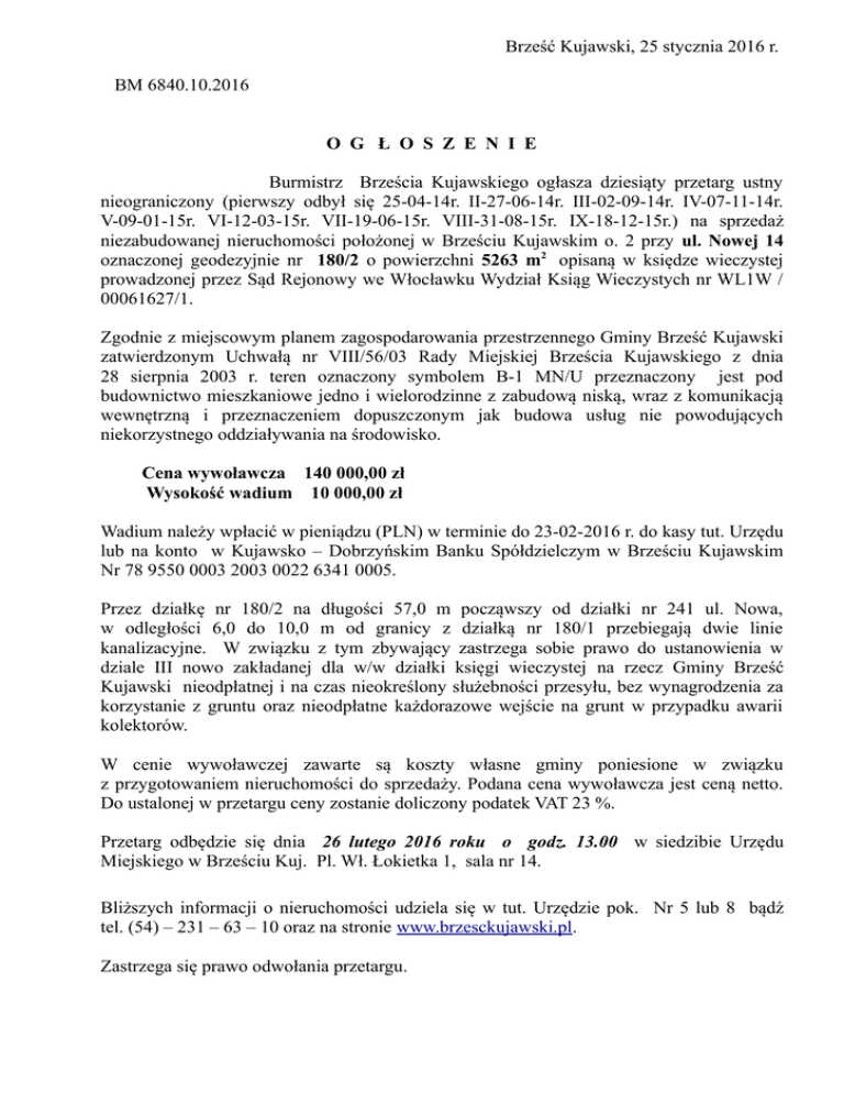 Brześć Kujawski, 25 stycznia 2016 r. BM 6840.10.2016 O G Ł O S Z E N I E Burmistrz Brześcia Kujawskiego ogłasza dziesiąty przetarg ustny nieograniczony (pierwszy odbył się 25-04-14r. II-27-06-14r. III-02-09-14r. IV-07-11-14r. V-09-01-15r. VI-12-03-15r. VII-19-06-15r. VIII-31-08-15r. IX-18-12-15r.) na sprzedaż niezabudowanej nieruchomości położonej w Brześciu Kujawskim o. 2 przy ul. Nowej 14 oznaczonej geodezyjnie nr 180/2 o powierzchni 5263 m2 opisaną w księdze wieczystej prowadzonej przez Sąd Rejonowy we Włocławku Wydział Ksiąg Wieczystych nr WL1W / 00061627/1. Zgodnie z miejscowym planem zagospodarowania przestrzennego Gminy Brześć Kujawski zatwierdzonym Uchwałą nr VIII/56/03 Rady Miejskiej Brześcia Kujawskiego z dnia 28 sierpnia 2003 r. teren oznaczony symbolem B-1 MN/U przeznaczony jest pod budownictwo mieszkaniowe jedno i wielorodzinne z zabudową niską, wraz z komunikacją wewnętrzną i przeznaczeniem dopuszczonym jak budowa usług nie powodujących niekorzystnego oddziaływania na środowisko. Cena wywoławcza 140 000,00 zł Wysokość wadium 10 000,00 zł Wadium należy wpłacić w pieniądzu (PLN) w terminie do 23-02-2016 r. do kasy tut. Urzędu lub na konto w Kujawsko – Dobrzyńskim Banku Spółdzielczym w Brześciu Kujawskim Nr 78 9550 0003 2003 0022 6341 0005. Przez działkę nr 180/2 na długości 57,0 m począwszy od działki nr 241 ul. Nowa, w odległości 6,0 do 10,0 m od granicy z działką nr 180/1 przebiegają dwie linie kanalizacyjne. W związku z tym zbywający zastrzega sobie prawo do ustanowienia w dziale III nowo zakładanej dla w/w działki księgi wieczystej na rzecz Gminy Brześć Kujawski nieodpłatnej i na czas nieokreślony służebności przesyłu, bez wynagrodzenia za korzystanie z gruntu oraz nieodpłatne każdorazowe wejście na grunt w przypadku awarii kolektorów. W cenie wywoławczej zawarte są koszty własne gminy poniesione w związku z przygotowaniem nieruchomości do sprzedaży. Podana cena wywoławcza jest ceną netto. Do ustalonej w przetargu ceny zostanie doliczony podatek VAT 23 %. Przetarg odbędzie się dnia 26 lutego 2016 roku o godz. 13.00 w siedzibie Urzędu Miejskiego w Brześciu Kuj. Pl. Wł. Łokietka 1, sala nr 14. Bliższych informacji o nieruchomości udziela się w tut. Urzędzie pok. Nr 5 lub 8 bądź tel. (54) – 231 – 63 – 10 oraz na stronie www.brzesckujawski.pl. Zastrzega się prawo odwołania przetargu. REGULAMIN PRZETARGU USTNEGO NIEOGRANICZONEGO NA SPRZEDAŻ NIERUCHOMOŚCI NIEZABUDOWANEJ POŁOŻONEJ W BRZEŚCIU KUJ. O.2 UL. NOWA 14 DZ. Nr 180/2 OPISANEJ W KW NR WL1W/00061627/1. 1. Przetarg odbywa się w formie ustnej. 2. W przetargu mogą brać udział osoby, które wpłacą wadium w pieniądzu (PLN) w terminie do dnia 23-02-2016 r. w wysokości podanej w ogłoszeniu z dnia 25-01-2016 r. do kasy Urzędu lub na konto w Kujawsko –Dobrzyńskim Banku Spółdzielczym w Brześciu Kujawskim Nr 78 9550 0003 2003 0022 6341 0005. Dowód wpłaty wadium winien wskazywać jednoznacznie, kto wpłacił wadium i tym samym uprawniony jest do udziału w przetargu (np. małżonkowie, osoby reprezentujące firmę, itp.). Dowód wniesienia wadium podlega przedłożeniu komisji przetargowej przed otwarciem przetargu. 3. Uczestnicy biorą udział w przetargu osobiście lub przez pełnomocnika. Pełnomocnictwo wymaga formy pisemnej. Małżonkowie biorą udział w przetargu osobiście lub okazując pełnomocnictwo współmałżonka. 4. Postąpienie nie może wynosić mniej niż 1 % ceny wywoławczej z zaokrągleniem w górę do pełnych dziesiątek złotych tj. 1 400,00 zł. 5. Przetarg wygrywa osoba, której zaoferowana cena po trzykrotnym wywołaniu nie została przebita. Do ustalonej w przetargu ceny zostanie doliczony podatek VAT 23 %. 6. Wadium wpłacone przez uczestnika, który wygrał przetarg zalicza się na poczet ceny nabycia nieruchomości, natomiast pozostałym uczestnikom zwraca się niezwłocznie po zakończeniu przetargu, jednak nie później niż przed upływem 3 dni od dnia zamknięcia lub odwołania przetargu. 7. Wadium ulega przepadkowi w razie uchylenia się uczestnika, który wygrał przetarg od zawarcia umowy. 8. Termin uiszczenia ceny sprzedaży pomniejszonej o wpłacone wadium upływa w ciągu 21 dni od dnia przeprowadzonego przetargu. Należność tę należy wpłacić na rachunek podstawowy w Kujawsko – Dobrzyńskim Banku Spółdzielczym w Brześciu Kujawskim Nr 62 9550 0003 2003 0022 6341 0002. 9. Nieruchomość zbywana jest wg. danych ewidencyjnych i w razie potrzeby wznowienia granic obowiązek ten spoczywa na nabywcy. 10. Nabywający zobowiązuje się do ustanowienia w dziale III nowo zakładanej dla w/w działki księgi wieczystej na rzecz Gminy Brześć Kujawski nieodpłatnej i na czas nieokreślony służebności przesyłu, bez wynagrodzenia za korzystanie z gruntu oraz nieodpłatne każdorazowe wejście na grunt w przypadku awarii kolektorów na rzecz Gminy Brześć Kujawski. 11. Nabywca wyznacza Kancelarię Notarialną oraz ponosi koszty Aktu Notarialnego. 12. Zastrzega się prawo odwołania przetargu. Zatwierdził Burmistrz Brześcia Kujawskiego