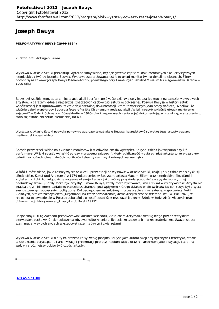 Fotofestiwal 2012 | Joseph Beuys Copyright Fotofestiwal 2012 http://www.fotofestiwal.com/2012/program/blok-wystawy-towarzyszace/joseph-beuys/ Joseph Beuys PERFOMATYWNY BEUYS (1964-1984) Kurator: prof. dr Eugen Blume Wystawa w Atlasie Sztuki prezentuje wybrane filmy wideo, będące głównie zapisami dokumentalnych akcji artystycznych niemieckiego twórcy Josepha Beuysa. Wystawa zaaranżowana jest jako układ monitorów i projekcji na ekranach. Filmy pochodzą ze zbiorów Joseph Beuys Medien-Archiv, powstałego przy Hamburger Bahnhof Museum für Gegenwart w Berlinie w 1996 roku. Beuys był rzeźbiarzem, autorem instalacji, akcji i performansów. Do dziś uważany jest za jednego z najbardziej wpływowych artystów, a zarazem jedną z najbardziej znaczących osobowości sztuki współczesnej. Pozycja Beuysa w historii sztuki współczesnej jest ugruntowana, także dzięki szerokiej dokumentacji, która towarzyszyła jego pracy twórczej. Możliwe, że właśnie dzięki współpracy Beuysa z fotografką Ute Klophausem podczas akcji „W jaki sposób wyjaśnić obrazy martwemu zającowi” w Galerii Schmela w Düsseldorfie w 1965 roku i rozpowszechnieniu zdjęć dokumentujących tę akcję, wystąpienie to stało się symbolem sztuki niemieckiej lat 60. Wystawa w Atlasie Sztuki pozwala ponownie zaprezentować akcje Beuysa i przedstawić sylwetkę tego artysty poprzez medium jakim jest wideo. Sposób prezentacji wideo na ekranach monitorów jest odwołaniem do wystąpień Beuysa, takich jak wspomniany już performans „W jaki sposób wyjaśnić obrazy martwemu zającowi”, kiedy publiczność mogła oglądać artystę tylko przez okno galerii i za pośrednictwem dwóch monitorów telewizyjnych wystawionych na zewnątrz. Wśród filmów wideo, jakie zostały wybrane w celu prezentacji na wystawie w Atlasie Sztuki, znajduje się także zapis dyskusji „Ende offen. Kunst und Antikunst“ z 1970 roku pomiędzy Beuysem, artystą Maxem Billem oraz niemieckimi filozofami i krytykami sztuki. Ponadgodzinne nagranie ukazuje Beuysa jako twórcę przykładającego dużą wagę do teoretycznej podbudowy sztuki. „Każdy może być artystą” ‒ mówi Beuys, każdy może być twórcą i mieć wkład w rzeczywistość. Artysta nie zgadza się z nihilizmem dadaizmu Marcela Duchampa, pod wpływem którego działało wielu twórców lat 60. Beuys był artystą zaangażowanym społecznie i politycznie. Był pedagogiem na założonym przez siebie uniwersytecie, współtwórcą Partii Zielonych, a także założycielem „Organizacji na rzecz bezpośredniej demokracji w drodze referendum”. W 1981 roku, w reakcji na pojawienie się w Polsce ruchu „Solidarności”, osobiście przekazał Muzeum Sztuki w Łodzi zbiór własnych prac i dokumentacji, którą nazwał „Przesyłka do Polski 1981”. Racjonalną kulturę Zachodu przeciwstawiał kulturze Wschodu, którą charakteryzował według niego przede wszystkim pierwiastek duchowy. Chciał połączenia obydwu kultur w celu uniknięcia zniszczenia ich przez materializm. Uważał się za szamana, a w swoich akcjach występował razem z żywymi zwierzętami. Wystawa w Atlasie Sztuki nie tylko prezentuje sylwetkę Josepha Beuysa jako autora akcji artystycznych i teoretyka, stawia także pytania dotyczące roli archiwizacji i prezentacji poprzez medium wideo oraz roli archiwum jako instytucji, która ma wpływ na późniejszy odbiór twórczości artysty. ATLAS SZTUKI page 1 / 2 Fotofestiwal 2012 | Joseph Beuys Copyright Fotofestiwal 2012 http://www.fotofestiwal.com/2012/program/blok-wystawy-towarzyszace/joseph-beuys/ Piotrkowska 114/116 godziny otwarcia wt-pt: 11.00-20.00 sb-nd: 11.00-17.00 wernisaż: 11.05, godz. 19.00 wystawa czynna w dniach: 11.05-24.06 page 2 / 2