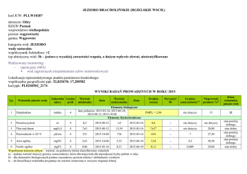 JEZIORO BRACHOLIŃSKIE (RGIELSKIE WSCH.) kod JCW: PLLW10207 dorzecze: Odry RZGW Poznań województwo wielkopolskie powiat: wągrowiecki gmina: Wągrowiec kategoria wód: JEZIORO wody naturalne współczynnik Schindlera: >2 typ abiotyczny wód: 3b – jezioro o wysokiej zawartości wapnia, o dużym wpływie zlewni, niestratyfikowane Realizowany monitoring: operacyjny (MO): wód zagrożonych niespełnieniem celów środowiskowych Lokalizacja reprezentatywnego punktu pomiarowo-kontrolnego: współrzędne geograficzne ppk: 52,825670; 17,289582 kod ppk: PL02S0502_2174 WYNIKI BADAŃ PROWADZNYCH W ROKU 2015 Lp. Wskaźnik jakości wody 1 Fitoplankton 2 Jednostka Liczba miary prób Wartość minimalna Data Wartość maksymalna Data Elementy biologiczne daty poborów: 2015-03-16; 2015-06-10; 2015-08-12; 2015-10-08 Elementy fizykochemiczne Średnia roczna Percentyl 90 PMPL = 2,94 Granica oznaczalności (a Niepewność pomiaru %(b Klasa wskaźnika jakości wód nie dotyczy 15 III indeks 4 Przeźroczystość m 4 0,3 2015-08-12 1,0 2015-03-16 0,6 nie dotyczy nie dotyczy 3 Tlen nad dnem mgO2/l 4 7,61 2015-08-12 13,34 2015-03-16 7,61(c nie dotyczy 28,00 4 Przewodność w 20 °C μS/cm 4 531 2015-10-08 736 2015-03-16 654 7 27,50 5 Azot ogólny mgN/l 4 2,61 2015-10-08 5,33 2015-06-10 3,54 0,3 28,50 6 Fosfor ogólny mgP/l 4 0,06 2015-03-16 0,21 2015-06-10 Wypełnienie kolorem żółtym – wartość, na podstawie której klasyfikowano wskaźnik (a – podana wartość dotyczy granicy oznaczalności, która obowiązywała dla największej liczby próbek w roku (b – dla elementów biologicznych podano szacunkowy poziom ufności i dokładności wyników (c – do klasyfikacji wskaźnika przyjmuje się wartość oznaczoną w szczycie stagnacji letniej 0,11 0,009 29,00 stan poniżej dobrego stan dobry stan poniżej dobrego stan poniżej dobrego stan dobry KLASYFIKACJA ELEMENTÓW BIOLOGICZNYCH, FIZYKOCHEMICZNYCH I HYDROMORFOLOGICZNYCH W JEDNOLITEJ CZĘŚCI WÓD Klasyfikacja elementów: biologicznych – III (STAN UMIARKOWANY) fizykochemicznych – STAN PONIŻEJ DOBREGO hydromorfologicznych – I KLASA
