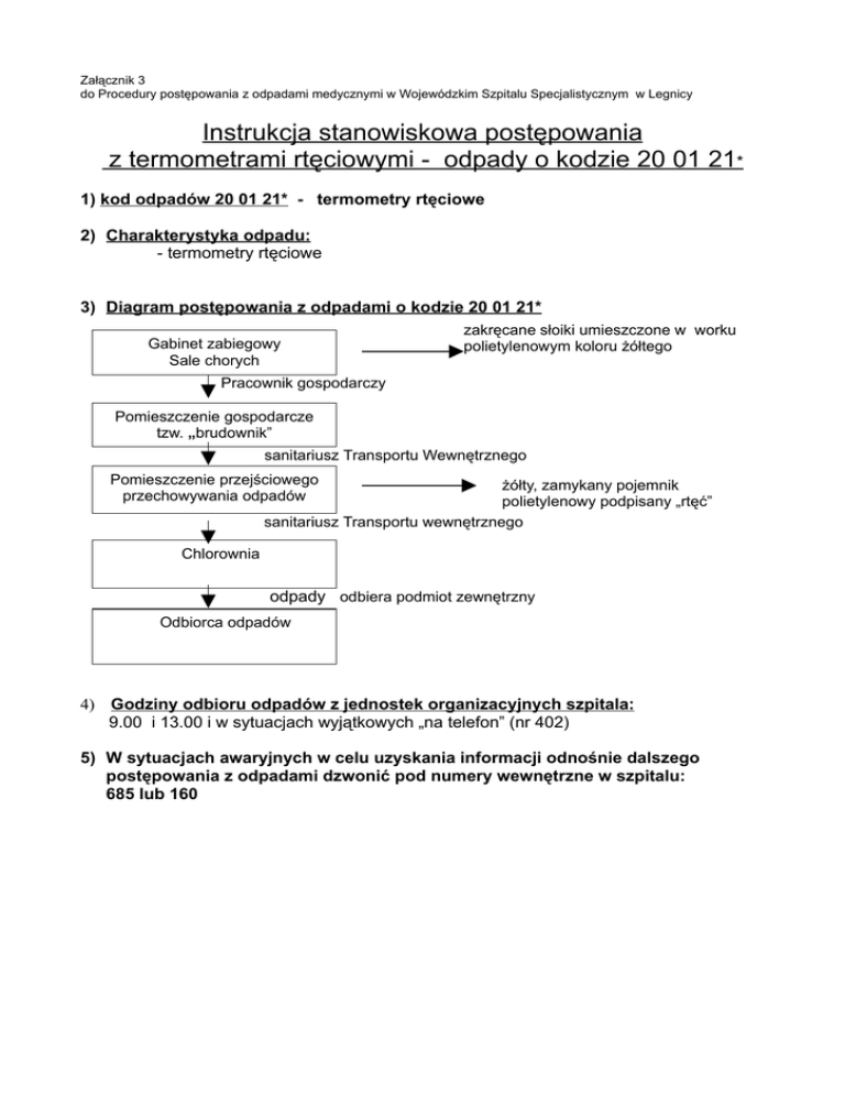 Załącznik 3 do Procedury postępowania z odpadami medycznymi w Wojewódzkim Szpitalu Specjalistycznym w Legnicy Instrukcja stanowiskowa postępowania z termometrami rtęciowymi - odpady o kodzie 20 01 21* 1) kod odpadów 20 01 21* - termometry rtęciowe 2) Charakterystyka odpadu: - termometry rtęciowe 3) Diagram postępowania z odpadami o kodzie 20 01 21* Gabinet zabiegowy Sale chorych zakręcane słoiki umieszczone w worku polietylenowym koloru żółtego Pracownik gospodarczy Pomieszczenie gospodarcze tzw. „brudownik” sanitariusz Transportu Wewnętrznego Pomieszczenie przejściowego przechowywania odpadów żółty, zamykany pojemnik polietylenowy podpisany „rtęć” sanitariusz Transportu wewnętrznego Chlorownia odpady odpady odbiera podmiot zewnętrzny Odbiorca odpadów 4) Godziny odbioru odpadów z jednostek organizacyjnych szpitala: 9.00 i 13.00 i w sytuacjach wyjątkowych „na telefon” (nr 402) 5) W sytuacjach awaryjnych w celu uzyskania informacji odnośnie dalszego postępowania z odpadami dzwonić pod numery wewnętrzne w szpitalu: 685 lub 160