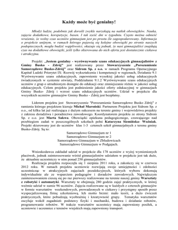 Każdy może być genialny! Młodzi ludzie, podobnie jak dorośli zwykle narzekają na natłok obowiązków. Nauka, zajęcia dodatkowe, korepetycje, basen. I tak sześć dni w tygodniu. Często można odnieść wrażenie, że wolny czas uczniów gimnazjum jest po prostu źle zagospodarowany. Informacja o projekcie unijnym, w ramach którego pojawią się kolejne obowiązki po stronie naszych podopiecznych, mogła budzić wątpliwości, okazuje się jednak, że nasi gimnazjaliści znajdują czas na dodatkowe obowiązki, jeśli tylko skierowana do nich oferta jest dostatecznie ciekawa i atrakcyjna. Projekt: „Jestem genialny - wyrównywanie szans edukacyjnych gimnazjalistów z Gminy Busko - Zdrój" jest realizowany przez Stowarzyszenie „Porozumienie Samorządowe Busko-Zdrój” oraz Sidrom Sp. z o.o. w ramach Programu Operacyjnego Kapitał Ludzki Priorytet IX: Rozwój wykształcenia i kompetencji w regionach, Działanie 9.1 Wyrównywanie szans edukacyjnych, zapewnienie wysokiej jakości usług edukacyjnych świadczonych w systemie oświaty, Poddziałanie 9.1.2 Wyrównywanie szans edukacyjnych uczniów z grup o utrudnionym dostępie do edukacji oraz zmniejszanie różnic w jakości usług edukacyjnych. Celem projektu jest podniesienie jakości oferty edukacyjnej w gimnazjach Gminy Busko- Zdrój i wzrost szans edukacyjnych uczniów. Udział w projekcie dla wszystkich uczniów gimnazjów Gminy Busko - Zdrój jest bezpłatny. Liderem projektu jest Stowarzyszenie "Porozumienie Samorządowe Busko Zdrój" z ramienia którego projektem kieruje Michał Maroński. Partnerem Projektu jest Sidrom Sp. z o.o., od kilku lat już realizująca z dużym sukcesem na terenie gminy i województwa projekty z zakresu doradztwa i poradnictwa zawodowego. Koordynatorem projektu ze strony Sidrom Sp. z o.o. jest Marta Sakwa. Obowiązki opiekuna pedagogicznego, czuwającego nad przebiegiem zadań w poszczególnych szkołach pełni Katarzyna Siemińska- Woźniak. Projekt skierowany jest do uczniów klas 1-3 czterech szkół gimnazjalnych z terenu gminy Busko-Zdrój. Są to: Samorządowe Gimnazjum nr 1 Samorządowe Gimnazjum nr 2 Samorządowe Gimnazjum w Zbludowicach Samorządowe Gimnazjum w Podgajach. Wnioskodawca zakładał udział w projekcie dla 178 uczniów z wyżej wymienionych placówek, jednak zainteresowanie wśród gimnazjalistów udziałem w projekcie jest tak duże, że aktualnie uczestniczy w nim ponad 250 gimnazjalistów. Realizacja projektu rozpoczęła się 1 sierpnia 2011 roku, a zakończy się w czerwcu 2012 roku. W ramach projektu uczniowie rozwijają swoje umiejętności i zdolności uczestnicząc w atrakcyjnych zajęciach pozalekcyjnych, których wyboru dokonują indywidualnie ale ze wsparciem pedagogów i doradców zawodowych. Największym zainteresowaniem cieszą się po raz pierwszy realizowane na terenie naszej gminy Warsztaty z robotyki i automatyki. Warsztaty te obejmują 280 godzin zajęć praktycznych, w której weźmie udział w sumie 96 uczniów. Zajęcia realizowane są w każdych z czterech gimnazjów w formie warsztatów weekendowych, prowadzonych w ciekawy i przystępny sposób przez wyspecjalizowaną firmę szkoleniową. Ich motto brzmi: mało teorii, a dużo ćwiczeń praktycznych, które pobudzają wyobraźnię i kreatywność grupy. Tematyka warsztatów oscyluje wokół zagadnień: podstawy fizyki i mechaniki, budowa i działanie robotów, programowanie robotów. W trakcie warsztatów uczestnicy mają zapewniony posiłek, a uczniowie i uczennice z terenów wiejskich mają zapewniony transport. Równie interesujące i cieszące się dużym zainteresowaniem wśród uczniów są Warsztaty z szybkiego czytania. Zajęcia odbywają się w każdej z czterech szkół w dziesięcioosobowych grupach. Prowadzi je wyspecjalizowana firma na bazie autorskich programów z technik szybkiego i efektywnego czytania. W ramach projektu organizowane są również Spotkania z zawodami i wycieczki zawodoznawcze, które mają pomóc uczniom i uczennicom w kształtowaniu wizji kariery edukacyjnej i zawodowej. Nasi gimnazjaliści mogą też szlifować swoje umiejętności oratorskie biorąc udział w panelach dyskusyjnych, gdzie poruszane są tematy związane z sytuacją w kraju i na świecie. Dla uczestników paneli dyskusyjnych przewidziano także wycieczki do Sejmu i Senatu oraz udział w zajęciach tematycznych, podczas których zapoznają się z kulturą krajów anglojęzycznych, germanofońskich i frankofońskich. W projekcie nie zabrakło również miejsca na sztukę, którą gimnazjaliści mogą uprawiać poprzez udział w warsztatach manualnych, warsztatach muzycznych oraz warsztatach z tańca współczesnego. W projekcie przewidziano również 360 godzin zajęć wyrównawczych np. z matematyki, biologii, geografii, chemii, fizyki, astronomii - w zależności od potrzeb i preferencji uczniów. Obligatoryjnym elementem projektu dla wszystkich uczestników zajęć i warsztatów jest poradnictwo edukacyjno – zawodowe, które realizowane jest poprzez warsztaty grupowe i indywidualne spotkania z doradcą zawodowych, w trakcie których uczniowie i uczennice wypracowują swoje Indywidualne Plany Działania. W czasie spotkań i warsztatów uczestnikom projektu zapewniono właściwą bazę dydaktyczną i zaplecze logistyczne. Wszystkie zajęcia są wyprawą w głąb zagadek nauki oraz doskonałą zabawą pozwalającą wspaniale i pożytecznie spędzić czas oraz rozwinąć swoje umiejętności. Projekt „Jestem genialny” jest wspaniały, bo spełnia marzenia: oprócz nauki i poszerzenia wiadomości, umożliwia przeżycie przygody i zapewnia, że każdy może zostać…..geniuszem. Wszystkie zajęcia są znakomite i bardzo potrzebne dla młodych ludzi, przed którymi jeszcze wiele lat nauki. Zadania realizowane w ramach projektu cieszą się ogromną popularnością, ponieważ prowadzone w profesjonalny sposób łączą naukę oraz elementy zabawy. Uczniowie biorący udział w zajęciach realizowanyc