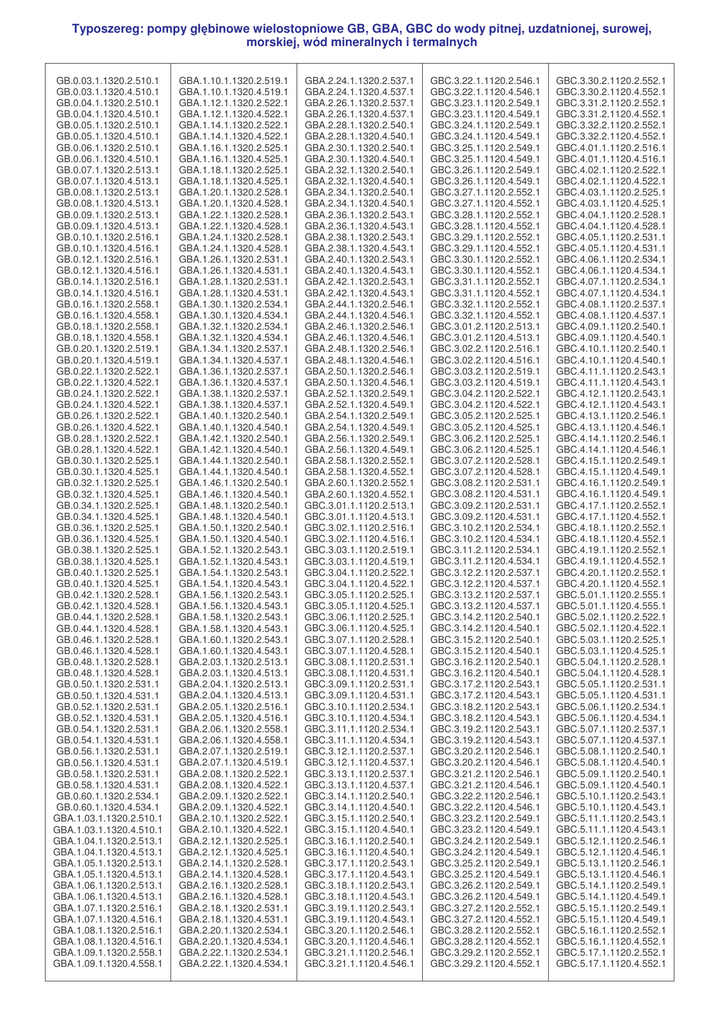 Typoszereg: pompy gł binowe wielostopniowe GB, GBA, GBC do wody pitnej, uzdatnionej, surowej, morskiej, wód mineralnych i termalnych GB.0.03.1.1320.2.510.1 GB.0.03.1.1320.4.510.1 GB.0.04.1.1320.2.510.1 GB.0.04.1.1320.4.510.1 GB.0.05.1.1320.2.510.1 GB.0.05.1.1320.4.510.1 GB.0.06.1.1320.2.510.1 GB.0.06.1.1320.4.510.1 GB.0.07.1.1320.2.513.1 GB.0.07.1.1320.4.513.1 GB.0.08.1.1320.2.513.1 GB.0.08.1.1320.4.513.1 GB.0.09.1.1320.2.513.1 GB.0.09.1.1320.4.513.1 GB.0.10.1.1320.2.516.1 GB.0.10.1.1320.4.516.1 GB.0.12.1.1320.2.516.1 GB.0.12.1.1320.4.516.1 GB.0.14.1.1320.2.516.1 GB.0.14.1.1320.4.516.1 GB.0.16.1.1320.2.558.1 GB.0.16.1.1320.4.558.1 GB.0.18.1.1320.2.558.1 GB.0.18.1.1320.4.558.1 GB.0.20.1.1320.2.519.1 GB.0.20.1.1320.4.519.1 GB.0.22.1.1320.2.522.1 GB.0.22.1.1320.4.522.1 GB.0.24.1.1320.2.522.1 GB.0.24.1.1320.4.522.1 GB.0.26.1.1320.2.522.1 GB.0.26.1.1320.4.522.1 GB.0.28.1.1320.2.522.1 GB.0.28.1.1320.4.522.1 GB.0.30.1.1320.2.525.1 GB.0.30.1.1320.4.525.1 GB.0.32.1.1320.2.525.1 GB.0.32.1.1320.4.525.1 GB.0.34.1.1320.2.525.1 GB.0.34.1.1320.4.525.1 GB.0.36.1.1320.2.525.1 GB.0.36.1.1320.4.525.1 GB.0.38.1.1320.2.525.1 GB.0.38.1.1320.4.525.1 GB.0.40.1.1320.2.525.1 GB.0.40.1.1320.4.525.1 GB.0.42.1.1320.2.528.1 GB.0.42.1.1320.4.528.1 GB.0.44.1.1320.2.528.1 GB.0.44.1.1320.4.528.1 GB.0.46.1.1320.2.528.1 GB.0.46.1.1320.4.528.1 GB.0.48.1.1320.2.528.1 GB.0.48.1.1320.4.528.1 GB.0.50.1.1320.2.531.1 GB.0.50.1.1320.4.531.1 GB.0.52.1.1320.2.531.1 GB.0.52.1.1320.4.531.1 GB.0.54.1.1320.2.531.1 GB.0.54.1.1320.4.531.1 GB.0.56.1.1320.2.531.1 GB.0.56.1.1320.4.531.1 GB.0.58.1.1320.2.531.1 GB.0.58.1.1320.4.531.1 GB.0.60.1.1320.2.534.1 GB.0.60.1.1320.4.534.1 GBA.1.03.1.1320.2.510.1 GBA.1.03.1.1320.4.510.1 GBA.1.04.1.1320.2.513.1 GBA.1.04.1.1320.4.513.1 GBA.1.05.1.1320.2.513.1 GBA.1.05.1.1320.4.513.1 GBA.1.06.1.1320.2.513.1 GBA.1.06.1.1320.4.513.1 GBA.1.07.1.1320.2.516.1 GBA.1.07.1.1320.4.516.1 GBA.1.08.1.1320.2.516.1 GBA.1.08.1.1320.4.516.1 GBA.1.09.1.1320.2.558.1 GBA.1.09.1.1320.4.558.1 GBA.1.10.1.1320.2.519.1 GBA.1.10.1.1320.4.519.1 GBA.1.12.1.1320.2.522.1 GBA.1.12.1.1320.4.522.1 GBA.1.14.1.1320.2.522.1 GBA.1.14.1.1320.4.522.1 GBA.1.16.1.1320.2.525.1 GBA.1.16.1.1320.4.525.1 GBA.1.18.1.1320.2.525.1 GBA.1.18.1.1320.4.525.1 GBA.1.20.1.1320.2.528.1 GBA.1.20.1.1320.4.528.1 GBA.1.22.1.1320.2.528.1 GBA.1.22.1.1320.4.528.1 GBA.1.24.1.1320.2.528.1 GBA.1.24.1.1320.4.528.1 GBA.1.26.1.1320.2.531.1 GBA.1.26.1.1320.4.531.1 GBA.1.28.1.1320.2.531.1 GBA.1.28.1.1320.4.531.1 GBA.1.30.1.1320.2.534.1 GBA.1.30.1.1320.4.534.1 GBA.1.32.1.1320.2.534.1 GBA.1.32.1.1320.4.534.1 GBA.1.34.1.1320.2.537.1 GBA.1.34.1.1320.4.537.1 GBA.1.36.1.1320.2.537.1 GBA.1.36.1.1320.4.537.1 GBA.1.38.1.1320.2.537.1 GBA.1.38.1.1320.4.537.1 GBA.1.40.1.1320.2.540.1 GBA.1.40.1.1320.4.540.1 GBA.1.42.1.1320.2.540.1 GBA.1.42.1.1320.4.540.1 GBA.1.44.1.1320.2.540.1 GBA.1.44.1.1320.4.540.1 GBA.1.46.1.1320.2.540.1 GBA.1.46.1.1320.4.540.1 GBA.1.48.1.1320.2.540.1 GBA.1.48.1.1320.4.540.1 GBA.1.50.1.1320.2.540.1 GBA.1.50.1.1320.4.540.1 GBA.1.52.1.1320.2.543.1 GBA.1.52.1.1320.4.543.1 GBA.1.54.1.1320.2.543.1 GBA.1.54.1.1320.4.543.1 GBA.1.56.1.1320.2.543.1 GBA.1.56.1.1320.4.543.1 GBA.1.58.1.1320.2.543.1 GBA.1.58.1.1320.4.543.1 GBA.1.60.1.1320.2.543.1 GBA.1.60.1.1320.4.543.1 GBA.2.03.1.1320.2.513.1 GBA.2.03.1.1320.4.513.1 GBA.2.04.1.1320.2.513.1 GBA.2.04.1.1320.4.513.1 GBA.2.05.1.1320.2.516.1 GBA.2.05.1.1320.4.516.1 GBA.2.06.1.1320.2.558.1 GBA.2.06.1.1320.4.558.1 GBA.2.07.1.1320.2.519.1 GBA.2.07.1.1320.4.519.1 GBA.2.08.1.1320.2.522.1 GBA.2.08.1.1320.4.522.1 GBA.2.09.1.1320.2.522.1 GBA.2.09.1.1320.4.522.1 GBA.2.10.1.1320.2.522.1 GBA.2.10.1.1320.4.522.1 GBA.2.12.1.1320.2.525.1 GBA.2.12.1.1320.4.525.1 GBA.2.14.1.1320.2.528.1 GBA.2.14.1.1320.4.528.1 GBA.2.16.1.1320.2.528.1 GBA.2.16.1.1320.4.528.1 GBA.2.18.1.1320.2.531.1 GBA.2.18.1.1320.4.531.1 GBA.2.20.1.1320.2.534.1 GBA.2.20.1.1320.4.534.1 GBA.2.22.1.1320.2.534.1 GBA.2.22.1.1320.4.534.1 GBA.2.24.1.1320.2.537.1 GBA.2.24.1.1320.4.537.1 GBA.2.26.1.1320.2.537.1 GBA.2.26.1.1320.4.537.1 GBA.2.28.1.1320.2.540.1 GBA.2.28.1.1320.4.540.1 GBA.2.30.1.1320.2.540.1 GBA.2.30.1.1320.4.540.1 GBA.2.32.1.1320.2.540.1 GBA.2.32.1.1320.4.540.1 GBA.2.34.1.1320.2.540.1 GBA.2.34.1.1320.4.540.1 GBA.2.36.1.1320.2.543.1 GBA.2.36.1.1320.4.543.1 GBA.2.38.1.1320.2.543.1 GBA.2.38.1.1320.4.543.1 GBA.2.40.1.1320.2.543.1 GBA.2.40.1.1320.4.543.1 GBA.2.42.1.1320.2.543.1 GBA.2.42.1.1320.4.543.1 GBA.2.44.1.1320.2.546.1 GBA.2.44.1.1320.4.546.1 GBA.2.46.1.1320.2.546.1 GBA.2.46.1.1320.4.546.1 GBA.2.48.1.1320.2.546.1 GBA.2.48.1.1320.4.546.1 GBA.2.50.1.1320.2.546.1 GBA.2.50.1.1320.4.546.1 GBA.2.52.1.1320.2.549.1 GBA.2.52.1.1320.4.549.1 GBA.2.54.1.1320.2.549.1 GBA.2.54.1.1320.4.549.1 GBA.2.56.1.1320.2.549.1 GBA.2.56.1.1320.4.549.1 GBA.2.58.1.1320.2.552.1 GBA.2.58.1.1320.4.552.1 GBA.2.60.1.1320.2.552.1 GBA.2.60.1.1320.4.552.1 GBC.3.01.1.1120.2.513.1 GBC.3.01.1.1120.4.513.1 GBC.3.02.1.1120.2.516.1 GBC.3.02.1.1120.4.516.1 GBC.3.03.1.1120.2.519.1 GBC.3.03.1.1120.4.519.1 GBC.3.04.1.1120.2.522.1 GBC.3.04.1.1120.4.522.1 GBC.3.05.1.1120.2.525.1 GBC.3.05.1.1120.4.525.1 GBC.3.06.1.1120.2.525.1 GBC.3.06.1.1120.4.525.1 GBC.3.07.1.1120.2.528.1 GBC.3.07.1.1120.4.528.1 GBC.3.08.1.1120.2.531.1 GBC.3.08.1.1120.4.531.1 GBC.3.09.1.1120.2.531.1 GBC.3.09.1.1120.4.531.1 GBC.3.10.1.1120.2.534.1 GBC.3.10.1.1120.4.534.1 GBC.3.11.1.1120.2.534.1 GBC.3.11.1.1120.4.534.1 GBC.3.12.1.1120.2.537.1 GBC.3.12.1.1120.4.537.1 GBC.3.13.1.1120.2.537.1 GBC.3.13.1.1120.4.537.1 GBC.3.14.1.1120.2.540.1 GBC.3.14.1.1120.4.540.1 GBC.3.15.1.1120.2.540.1 GBC.3.15.1.1120.4.540.1 GBC.3.16.1.1120.2.540.1 GBC.3.16.1.1120.4.540.1 GBC.3.17.1.1120.2.543.1 GBC.3.17.1.1120.4.543.1 GBC.3.18.1.1120.2.543.1 GBC.3.18.1.1120.4.543.1 GBC.3.19.1.1120.2.543.1 GBC.3.19.1.1120.4.543.1 GBC.3.20.1.1120.2.546.1 GBC.3.20.1.1120.4.546.1 GBC.3.21.1.1120.2.546.1 GBC.3.21.1.1120.4.546.1 GBC.3.22.1.1120.2.546.1 GBC.3.22.1.1120.4.546.1 GBC.3.23.1.1120.2.549.1 GBC.3.23.1.1120.4.549.1 GBC.3.24.1.1120.2.549.1 GBC.3.24.1.1120.4.549.1 GBC.3.25.1.1120.2.549.1 GBC