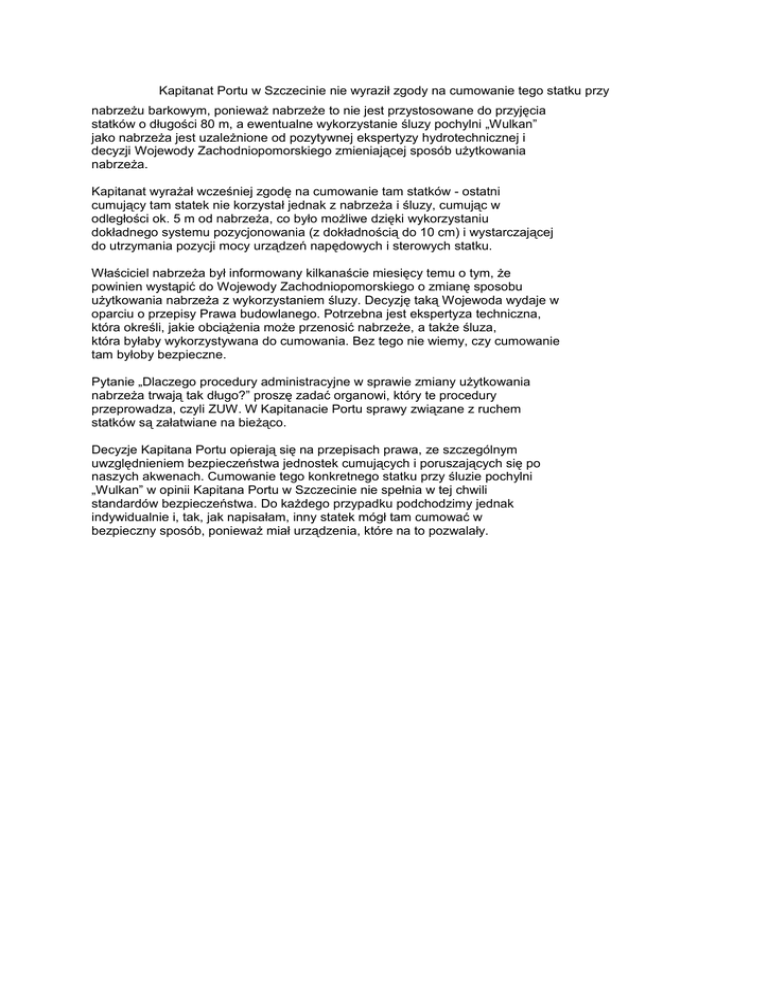 Kapitanat Portu w Szczecinie nie wyraził zgody na cumowanie tego statku przy nabrzeżu barkowym, ponieważ nabrzeże to nie jest przystosowane do przyjęcia statków o długości 80 m, a ewentualne wykorzystanie śluzy pochylni „Wulkan” jako nabrzeża jest uzależnione od pozytywnej ekspertyzy hydrotechnicznej i decyzji Wojewody Zachodniopomorskiego zmieniającej sposób użytkowania nabrzeża. Kapitanat wyrażał wcześniej zgodę na cumowanie tam statków - ostatni cumujący tam statek nie korzystał jednak z nabrzeża i śluzy, cumując w odległości ok. 5 m od nabrzeża, co było możliwe dzięki wykorzystaniu dokładnego systemu pozycjonowania (z dokładnością do 10 cm) i wystarczającej do utrzymania pozycji mocy urządzeń napędowych i sterowych statku. Właściciel nabrzeża był informowany kilkanaście miesięcy temu o tym, że powinien wystąpić do Wojewody Zachodniopomorskiego o zmianę sposobu użytkowania nabrzeża z wykorzystaniem śluzy. Decyzję taką Wojewoda wydaje w oparciu o przepisy Prawa budowlanego. Potrzebna jest ekspertyza techniczna, która określi, jakie obciążenia może przenosić nabrzeże, a także śluza, która byłaby wykorzystywana do cumowania. Bez tego nie wiemy, czy cumowanie tam byłoby bezpieczne. Pytanie „Dlaczego procedury administracyjne w sprawie zmiany użytkowania nabrzeża trwają tak długo?” proszę zadać organowi, który te procedury przeprowadza, czyli ZUW. W Kapitanacie Portu sprawy związane z ruchem statków są załatwiane na bieżąco. Decyzje Kapitana Portu opierają się na przepisach prawa, ze szczególnym uwzględnieniem bezpieczeństwa jednostek cumujących i poruszających się po naszych akwenach. Cumowanie tego konkretnego statku przy śluzie pochylni „Wulkan” w opinii Kapitana Portu w Szczecinie nie spełnia w tej chwili standardów bezpieczeństwa. Do każdego przypadku podchodzimy jednak indywidualnie i, tak, jak napisałam, inny statek mógł tam cumować w bezpieczny sposób, ponieważ miał urządzenia, które na to pozwalały.