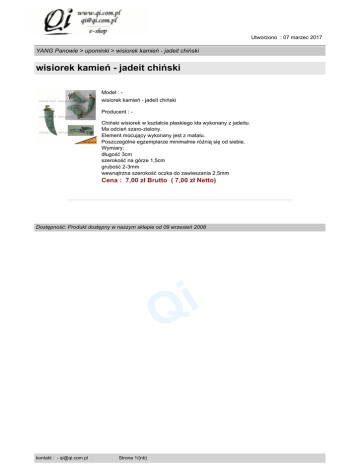Utworzono : 07 marzec 2017 YANG Panowie > upominki > wisiorek kamień - jadeit chiński wisiorek kamień - jadeit chiński Model : wisiorek kamień - jadeit chiński Producent : Chiński wisiorek w kształcie płaskiego kła wykonany z jadeitu. Ma odcień szaro-zielony. Element mocujący wykonany jest z matalu. Poszczególne egzemplarze minimalnie różnią się od siebie. Wymiary: długość 3cm szerokość na górze 1,5cm grubość 2-3mm wewnątrzna szerokość oczka do zawieszania 2,5mm Cena : 7,00 zł Brutto ( 7,00 zł Netto) Dostępność: Produkt dostępny w naszym sklepie od 09 wrzesień 2008 i Q kontakt : - [email protected] Strona 1/{nb}
