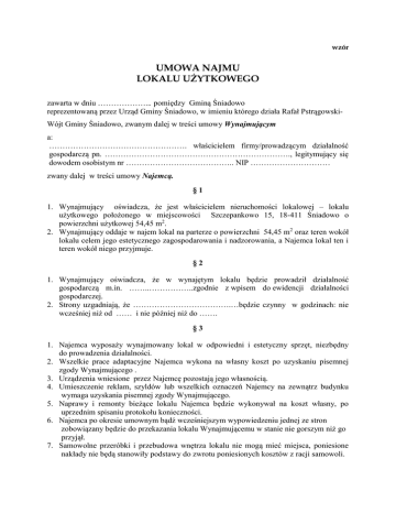 wzór UMOWA NAJMU LOKALU UŻYTKOWEGO zawarta w dniu ………………... pomiędzy Gminą Śniadowo reprezentowaną przez Urząd Gminy Śniadowo, w imieniu którego działa Rafał PstrągowskiWójt Gminy Śniadowo, zwanym dalej w treści umowy Wynajmującym a: ……………………………………………. właścicielem firmy/prowadzącym działalność gospodarczą pn. ……………………………………………………………., legitymujący się dowodem osobistym nr ………………………………….. NIP ………………………… zwany dalej w treści umowy Najemcą. §1 1. Wynajmujący oświadcza, że jest właścicielem nieruchomości lokalowej – lokalu użytkowego położonego w miejscowości Szczepankowo 15, 18-411 Śniadowo o powierzchni użytkowej 54,45 m2. 2. Wynajmujący oddaje w najem lokal na parterze o powierzchni 54,45 m2 oraz teren wokół lokalu celem jego estetycznego zagospodarowania i nadzorowania, a Najemca lokal ten i teren wokół niego przyjmuje. §2 1. Wynajmujący oświadcza, że w wynajętym lokalu będzie prowadził działalność gospodarczą m.in. ……..……………..zgodnie z wpisem do ewidencji działalności gospodarczej. 2. Strony uzgadniają, że ……………………………….…będzie czynny w godzinach: nie wcześniej niż od …… i nie później niż do ……. §3 1. Najemca wyposaży wynajmowany lokal w odpowiedni i estetyczny sprzęt, niezbędny do prowadzenia działalności. 2. Wszelkie prace adaptacyjne Najemca wykona na własny koszt po uzyskaniu pisemnej zgody Wynajmującego . 3. Urządzenia wniesione przez Najemcę pozostają jego własnością. 4. Umieszczenie reklam, szyldów lub wszelkich oznaczeń Najemcy na zewnątrz budynku wymaga uzyskania pisemnej zgody Wynajmującego. 5. Naprawy i remonty bieżące lokalu Najemca będzie wykonywał na koszt własny, po uprzednim spisaniu protokołu konieczności. 6. Najemca po okresie umownym bądź wcześniejszym wypowiedzeniu jednej ze stron zobowiązany będzie do przekazania lokalu Wynajmującemu w stanie nie gorszym niż go przyjął. 7. Samowolne przeróbki i przebudowa wnętrza lokalu nie mogą mieć miejsca, poniesione nakłady nie będą stanowiły podstawy do zwrotu poniesionych kosztów z racji samowoli. §4 Najemca zobowiązuje się do zapłaty czynszu najmu, który liczony jest w ten sposób, że stawka netto za 1 m 2 wynosi ……………. + obowiązujący podatek VAT powierzchni użytkowej w stosunku miesięcznym. 2. Łączna kwota czynszu w stosunku miesięcznym wynosić będzie netto ………… + obowiązujący VAT (na dzień podpisania umowy …..%), tj. kwota brutto …….. (słownie: ……………………….) płatna z góry w terminie 7 dni od daty otrzymania faktury za dany miesiąc na konto Urzędu Gminy w Śniadowie podane na fakturze. 3. Opłaty niezależne od właściciela budynku, takie jak zakup energii elektrycznej, wody, wywóz nieczystości stałych i płynnych Najemca będzie regulował we własnym zakresie, po uprzednim zawarciu stosownej umowy z zarządcą mediów. 4. Zmiany w treści umowy dokonywane mogą być aneksem na wniosek i za zgodą obu stron. §5 1. 1. Obowiązkiem Najemcy jest użytkowanie sprzętu elektrycznego zgodnie z przepisami przeciwpożarowymi i takie jego usytuowanie, aby nie blokował dróg ewakuacyjnych. 2. Najemca zobowiązuje się do pokrycia wszelkich szkód wyrządzonych Wynajmującemu, spowodowanych z jego winy lub niedbalstwa. §6 Najemca nie ma prawa oddania wynajmowanej powierzchni w podnajem osobom trzecim i jest zobowiązany do korzystania z przedmiotu najmu zgodnie z jego przeznaczeniem. §7 1. W sprawach nie uregulowanych treścią niniejszej umowy stosuje się przepisy Kodeksu Cywilnego. 2. Wszelkie spory wynikłe między umawiającymi się Stronami rozstrzyga właściwy sąd dla siedziby Wynajmującego. §8 1. Umowa może ulec wcześniejszemu rozwiązaniu w każdym czasie w trybie porozumienia Stron. 2. Umowa może ulec rozwiązaniu za jednomiesięcznym okresem wypowiedzenia przez każdą ze Stron, ze skutkiem na koniec następnego miesiąca, w przypadku: a) zmiany przez Wynajmującego przeznaczenia wynajmowanego pomieszczenia, b) zakończenia działalności przez Najemcę. 3. Wynajmujący zastrzega sobie możliwość rozwiązania niniejszej umowy ze skutkiem natychmiastowym, jeżeli Najemca zalega z należnym czynszem za dwa pełne okresy płatności i pomimo wezwania do zapłaty w wyznaczonym terminie nadal zwleka z jego uregulowaniem, oraz w przypadku prowadzenia działalności niezgodnej z niniejszą umową, a także innych rażących naruszeń niniejszej umowy. 4. Wezwanie do zapłaty wysłane pod adres siedziby firmy, a nie podjęte w terminie uważa się za doręczone. §9 Zmiany postanowień niniejszej umowy wymagają dla swej ważności formy pisemnej. § 10 Umowa najmu została zawarta na czas określony tj. na okres 10 lat i obowiązuje od dnia ………………………………………… i wiąże strony od dnia podpisania. § 11 Umowa wchodzi w życie z dniem podpisania. § 12 Umowę sporządzono w trzech jednobrzmiących egzemplarzach, w tym dwa egzemplarze dla Wynajmującego, jeden egzemplarz dla Najemcy. Najemca: …………………………………… Wynajmujący: ……………………………………..