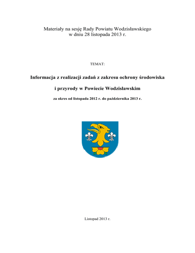 Materiały na sesję Rady Powiatu Wodzisławskiego w dniu 28 listopada 2013 r. TEMAT: Informacja z realizacji zadań z zakresu ochrony środowiska i przyrody w Powiecie Wodzisławskim za okres od listopada 2012 r. do października 2013 r. Listopad 2013 r. I. Definicje. Ochrona środowiska to, zgodnie z art. 3 pkt 13) ustawy z dnia 27 kwietnia 2001 r. – Prawo ochrony środowiska (tekst jednolity z 2008 r., Dz. U. Nr 25, poz. 150 ze zm.), podjęcie lub zaniechanie działań, umożliwiające zachowanie lub przywracanie równowagi przyrodniczej; ochrona ta polega w szczególności na: a) racjonalnym kształtowaniu środowiska i gospodarowaniu zasobami środowiska zgodnie z zasadą zrównoważonego rozwoju, b) przeciwdziałaniu zanieczyszczeniom, c) przywracaniu elementów przyrodniczych do stanu właściwego. Zrównoważony rozwój to taki rozwój społeczno-gospodarczy, w którym następuje proces integrowania działań politycznych, gospodarczych i społecznych, z zachowaniem równowagi przyrodniczej oraz trwałości podstawowych procesów przyrodniczych, w celu zagwarantowania możliwości zaspokajania podstawowych potrzeb poszczególnych społeczności lub obywateli zarówno współczesnego pokolenia, jak i przyszłych pokoleń (art. 3 pkt 50) ww. ustawy). W rozumieniu przepisu art. 3 pkt 39) ustawy – Prawo ochrony środowiska, poprzez środowisko rozumie się ogół elementów przyrodniczych, w tym także przekształconych w wyniku działalności człowieka, a w szczególności powierzchnię ziemi, kopaliny, wody, powietrze, krajobraz, klimat oraz pozostałe elementy różnorodności biologicznej, a także wzajemne oddziaływania pomiędzy tymi elementami. Z kolei zanieczyszczenie to emisja, która może być szkodliwa dla zdrowia ludzi lub stanu środowiska, może powodować szkodę w dobrach materialnych, może pogarszać walory estetyczne środowiska lub może kolidować z innymi, uzasadnionymi sposobami korzystania ze środowiska (art. 3 pkt 49) cyt. ustawy). 2 II. Wstęp. Kompetencje Starosty Wodzisławskiego w zakresie ochrony środowiska są ściśle wyznaczone przepisami prawa i obejmują sprawy związane z gospodarką wodno-ściekową, ochroną powietrza, gospodarką odpadami, ochroną przyrody, gospodarowaniem środkami przeznaczanymi na zadania określone w ustawie Prawo ochrony środowiska, jak również ochroną powierzchni ziemi, wydobywaniem kopalin, gospodarką łowiecką i leśną oraz ochroną przed hałasem, a także ochroną przed polami elektromagnetycznymi. III. Opis zadań z zakresu ochrony środowiska, będących w kompetencji Starosty Wodzisławskiego z opisem spraw konfliktowych (w okresie od listopada 2012 r. do października 2013 r.). 1. Gospodarka wodno-ściekowa. Do podstawowych zadań w zakresie gospodarki wodno-ściekowej należy w szczególności prowadzenie spraw związanych z wydawaniem pozwoleń wodnoprawnych m.in. na: - szczególne korzystanie z wód, - wykonywanie urządzeń wodnych, - rolnicze wykorzystanie ścieków, w zakresie nie objętym zwykłym korzystaniem z wód, - regulację wód oraz zmianę ukształtowania terenu na gruntach przylegających do wód, mającą wpływ na warunki przepływu, - piętrzenie wód podziemnych. Ponadto, Starosta udziela pozwoleń na wprowadzanie do urządzeń kanalizacyjnych ścieków przemysłowych zawierających substancje szczególnie szkodliwe dla środowiska wodnego, wygasza pozwolenia wodnoprawne oraz cofa je lub ogranicza. Ilości spraw w poszczególnych zakresach: • udzielanie pozwoleń wodnoprawnych – 74, • stwierdzanie wygaśnięcia pozwoleń wodnoprawnych – 11, • przeglądy pozwoleń wodnoprawnych – 35, • legalizacja urządzeń wodnych – 1, • przyjmowanie wyników badań i analiz ściekowych – 30, • inne sprawy związane z gospodarką wodno-ściekową w Powiecie – 21. 3 1.1. Inne sprawy. 1.1.1. Urządzenia melioracyjne odwadniające teren p. G. Łatki. Pan G. Łatka poprosił o interwencję w związku z planowanym rozpoczęciem robót ciężkim sprzętem przez sąsiada w zakresie nadsypania i wyrównania terenu, co rodzi obawę zalewania jego nieruchomości oraz skierowanie wód opadowych do innego odbiornika. Po przeprowadzeniu rozpoznania stanu faktycznego i prawnego wystosowano pismo do wnioskodawcy przedstawiając poruszony temat urządzeń melioracyjnych odwadniających nieruchomość, których funkcjonalność może zostać naruszona działaniami podejmowanymi przez właściciela nieruchomości leżącej naprzeciw posesji, mianowicie: Zgodnie z rozporządzeniem Ministra Środowiska z dnia 21 kwietnia 2006 r. w sprawie listy rodzajów odpadów, które posiadacz odpadów może przekazywać osobom fizycznym lub jednostkom organizacyjnym niebędącym przedsiębiorcami, oraz dopuszczalnych metod ich odzysku (Dz. U. Nr 75, poz. 527) osobie fizycznej dozwolone jest wykorzystywanie określonych rodzajów odpadów (np. ziemi) celem m. in. utwardzania nawierzchni. Nigdy jednak działania takie nie mogą szkodzić nieruchomościom sąsiednim, bądź innym położonym w choćby pośrednim zasięgu oddziaływania takich prac. W myśl przepisu art. 26 ustawy z dnia 14 grudnia 2012 r. o odpadach (Dz. U. z 2013 r., poz. 21 ze zm.) posiadacz odpadów (o ile narusza ww. regulacje rozporządzenia) jest obowiązany do niezwłocznego usunięcia odpadów z miejsca nieprzeznaczonego do ich składowania lub magazynowania. W przypadku zaś nieusunięcia odpadów, wójt, burmistrz lub prezydent miasta, w drodze decyzji wydawanej z urzędu, nakazuje posiadaczowi odpadów ich usunięcie z miejsca nieprzeznaczonego do ich składowania lub magazynowania. Podobnie w zakresie regulowanym przepisami ustawy z dnia 18 lipca 2001 r. Prawo wodne (t. j. Dz. U. z 2012 r., poz. 145 ze zm.) właściciel gruntu, o ile przepisy ustawy nie stanowią inaczej, nie może zmieniać stanu wody na gruncie, a zwłaszcza kierunku odpływu znajdującej się na jego gruncie wody opadowej ani kierunku odpływu ze źródeł