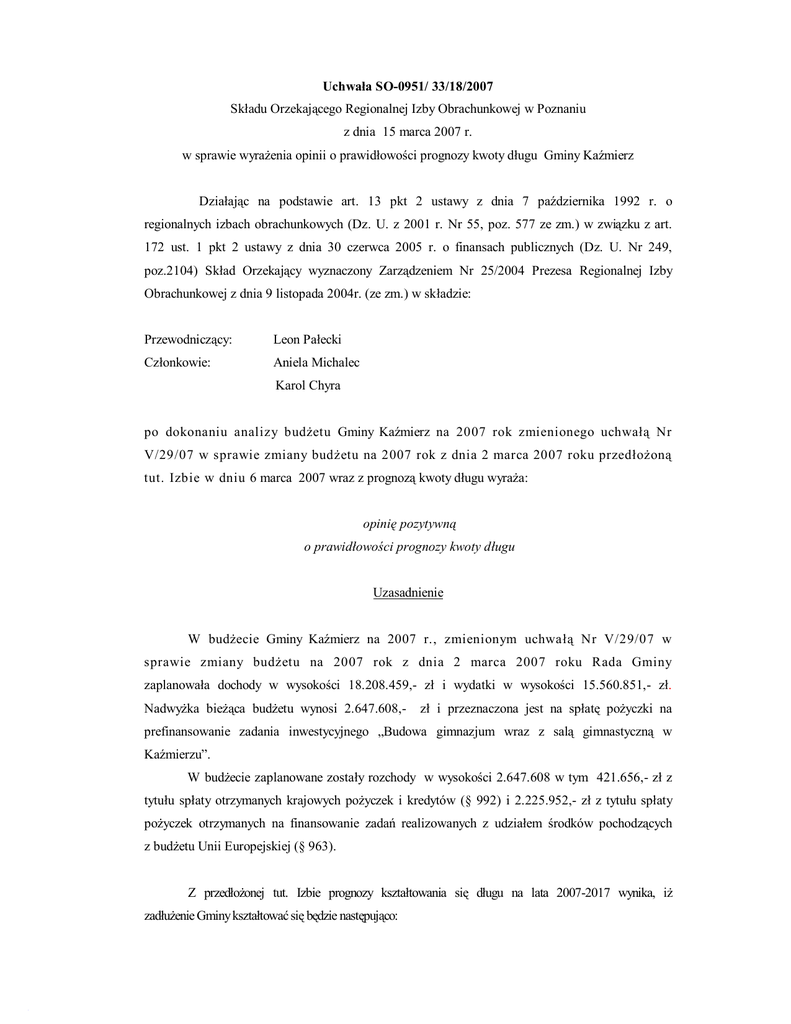 Uchwała SO-0951/ 33/18/2007 Składu Orzekającego Regionalnej Izby Obrachunkowej w Poznaniu z dnia 15 marca 2007 r. w sprawie wyrażenia opinii o prawidłowości prognozy kwoty długu Gminy Kaźmierz Działając na podstawie art. 13 pkt 2 ustawy z dnia 7 października 1992 r. o regionalnych izbach obrachunkowych (Dz. U. z 2001 r. Nr 55, poz. 577 ze zm.) w związku z art. 172 ust. 1 pkt 2 ustawy z dnia 30 czerwca 2005 r. o finansach publicznych (Dz. U. Nr 249, poz.2104) Skład Orzekający wyznaczony Zarządzeniem Nr 25/2004 Prezesa Regionalnej Izby Obrachunkowej z dnia 9 listopada 2004r. (ze zm.) w składzie: Przewodniczący: Leon Pałecki Członkowie: Aniela Michalec Karol Chyra po dokonaniu analizy budżetu Gminy Kaźmierz na 2007 rok zmienionego uchwałą Nr V/29/07 w sprawie zmiany budżetu na 2007 rok z dnia 2 marca 2007 roku przedłożoną tut. Izbie w dniu 6 marca 2007 wraz z prognozą kwoty długu wyraża: opinię pozytywną o prawidłowości prognozy kwoty długu Uzasadnienie W budżecie Gminy Kaźmierz na 2007 r., zmienionym uchwałą Nr V/29/07 w sprawie zmiany budżetu na 2007 rok z dnia 2 marca 2007 roku Rada Gminy zaplanowała dochody w wysokości 18.208.459,- zł i wydatki w wysokości 15.560.851,- zł. Nadwyżka bieżąca budżetu wynosi 2.647.608,- zł i przeznaczona jest na spłatę pożyczki na prefinansowanie zadania inwestycyjnego „Budowa gimnazjum wraz z salą gimnastyczną w Kaźmierzu”. W budżecie zaplanowane zostały rozchody w wysokości 2.647.608 w tym 421.656,- zł z tytułu spłaty otrzymanych krajowych pożyczek i kredytów (§ 992) i 2.225.952,- zł z tytułu spłaty pożyczek otrzymanych na finansowanie zadań realizowanych z udziałem środków pochodzących z budżetu Unii Europejskiej (§ 963). Z przedłożonej tut. Izbie prognozy kształtowania się długu na lata 2007-2017 wynika, iż zadłużenie Gminy kształtować się będzie następująco: Rok Zadłużenie na koniec roku Planowane spłaty Planowane % zadłużenia dochody na koniec % spłaty roku 2007 3.033.677,13 612.655,68 18.208.459 16,66 3,36 2008 2.687.179,73 499.356,97 15.000.000 17,91 3,33 2009 2.384.615,69 441.067,85 14.300.000 16,68 3,08 2010 2.082.051,65 424.963,09 14.300.000 14,56 2,97 2011 1.779.487,61 408.858,30 14.300.000 12,44 2,86 2012 1.476.923,57 392.753,57 14.300.000 10,33 2,75 2013 1.200.000,56 350.778,78 14.300.000 8,39 2,45 2014 1.000.000,64 261.460,93 14.300.000 6,99 1,83 2015 800.000,72 251.561,17 14.300.000 5,59 1,76 2016 600.000,80 251.561,17 14.300.000 4,20 1,76 2017 400.000,88 251.561,17 14.300.000 2,80 1,76 Z powyższego zestawienia wynika, że w latach 2007-2017 planowane zadłużenie na koniec każdego roku nie przekroczy 60% dochodów jednostki w tym roku budżetowym, a zatem spełniony został wymóg art. 170 ust. 1 ustawy o finansach publicznych. Łączna kwota przypadających do spłaty w danym roku budżetowym rat kredytów i pożyczek wraz z należnymi odsetkami, nie przekroczy 15% planowanych dochodów budżetu Gminy, a więc warunek określony w art. 169 ust. 1 ustawy o finansach publicznych zostanie spełniony. Biorąc powyższe pod uwagę Skład Orzekający wyraził opinię jak w sentencji. Przewodniczący Składu Orzekającego Leon Pałecki Pouczenie: Od niniejszej uchwały Składu Orzekającego służy odwołanie do Kolegium Izby w terminie 14 dni od daty jej doręczenia.