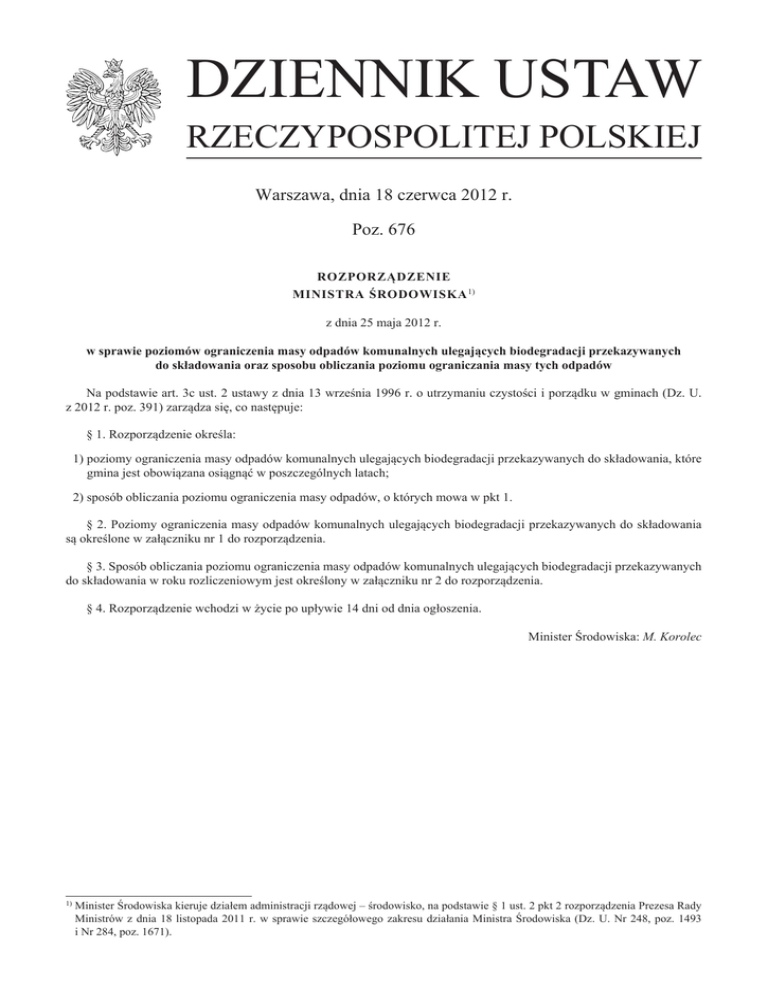 DZIENNIK USTAW RZECZYPOSPOLITEJ POLSKIEJ Warszawa, dnia 18 czerwca 2012 r. Poz. 676 ROZPORZĄDZENIE MINISTRA ŚRODOWISKA 1) z dnia 25 maja 2012 r. w sprawie poziomów ograniczenia masy odpadów komunalnych ulegających biodegradacji przekazywanych do składowania oraz sposobu obliczania poziomu ograniczania masy tych odpadów Na podstawie art. 3c ust. 2 ustawy z dnia 13 września 1996 r. o utrzymaniu czystości i porządku w gminach (Dz. U. z 2012 r. poz. 391) zarządza się, co następuje: § 1. Rozporządzenie określa: 1) poziomy ograniczenia masy odpadów komunalnych ulegających biodegradacji przekazywanych do składowania, które gmina jest obowiązana osiągnąć w poszczególnych latach; 2) sposób obliczania poziomu ograniczenia masy odpadów, o których mowa w pkt 1. § 2. Poziomy ograniczenia masy odpadów komunalnych ulegających biodegradacji przekazywanych do składowania są określone w załączniku nr 1 do rozporządzenia. § 3. Sposób obliczania poziomu ograniczenia masy odpadów komunalnych ulegających biodegradacji przekazywanych do składowania w roku rozliczeniowym jest określony w załączniku nr 2 do rozporządzenia. § 4. Rozporządzenie wchodzi w życie po upływie 14 dni od dnia ogłoszenia. Minister Środowiska: M. Korolec 1) Minister Środowiska kieruje działem administracji rządowej – środowisko, na podstawie § 1 ust. 2 pkt 2 rozporządzenia Prezesa Rady Ministrów z dnia 18 listopada 2011 r. w sprawie szczegółowego zakresu działania Ministra Środowiska (Dz. U. Nr 248, poz. 1493 i Nr 284, poz. 1671). 2012 75 Rok Dopuszczalny poziom masy odpadów komunalnych ulegających biodegradacji przekazywanych do składowania w stosunku do masy tych odpadów wytworzonych w 1995 r. [%] 50 16 lipca 2013 50 2014 50 2015 45 2016 45 2017 40 2018 40 2019 35 16 lipca 2020 PoZioMy ogRaNicZeNia MaSy oDPaDów koMUNalNych Ulegających bioDegRaDacji PRZekaZywaNych Do SkłaDowaNia w StoSUNkU Do MaSy tych oDPaDów wytwoRZoNych w 1995 R. [%] Załącznik nr 1 Załączniki do rozporządzenia Ministra Środowiska z dnia 25 maja 2012 r. (poz. 676) Dziennik Ustaw –2– Poz. 676 Dziennik Ustaw –3– Poz. 676 Załącznik nr 2 SPoSób oblicZaNia PoZioMU ogRaNicZeNia MaSy oDPaDów koMUNalNych Ulegających bioDegRaDacji PRZekaZywaNych Do SkłaDowaNia w RokU RoZlicZeNiowyM 1. Masę odpadów ulegających biodegradacji wytworzoną w 1995 r. oblicza się na podstawie wzoru: OUB1995 = 0,155 · Lm + 0,047 · Lw [Mg] gdzie: OUB1995 – masa odpadów komunalnych ulegających biodegradacji wytworzonych w 1995 r. [Mg]; Lm – liczba mieszkańców miasta w 1995 r. na obszarze gminy według danych głównego Urzędu Statystycznego; Lw – liczba mieszkańców wsi w 1995 r. na obszarze gminy według danych głównego Urzędu Statystycznego. 2. Masę odpadów komunalnych ulegających biodegradacji dozwoloną do składowania w roku rozliczeniowym należy obliczać według wzoru: OUB1995 · PR OUBR = ––––––––––– [Mg] 100 gdzie: OUBR – masa odpadów komunalnych ulegających biodegradacji dozwolona do składowania w roku rozliczeniowym [Mg]; OUB1995 – masa odpadów komunalnych ulegających biodegradacji wytworzonych w 1995 r. [Mg]; PR – poziom ograniczania masy odpadów komunalnych ulegających biodegradacji przekazywanych do składowania zgodnie z załącznikiem nr 1 do rozporządzenia [%]. 3. Masę odpadów ulegających biodegradacji zebranych ze strumienia odpadów komunalnych z obszaru danej gminy w roku rozliczeniowym, przekazanych do składowania, oblicza się według wzoru: MOUBR = (MMR · UM) + (MWR · UW) + (MSR · US) + (MBR · 0,52) [Mg] gdzie: MOUBR – masa odpadów ulegających biodegradacji zebranych ze strumienia odpadów komunalnych z obszaru danej gminy w roku rozliczeniowym, przekazanych do składowania, [Mg]; MMR – masa zmieszanych odpadów komunalnych o kodzie 20 03 01 zebranych na obszarze miast w roku rozliczeniowym, przekazanych do składowania, [Mg]; MWR – masa zmieszanych odpadów komunalnych o kodzie 20 03 01 zebranych na obszarze wsi w roku rozliczeniowym, przekazanych do składowania, [Mg]; UM – udział odpadów ulegających biodegradacji w masie zmieszanych odpadów komunalnych dla miast wynoszący 0,57; UW – udział odpadów ulegających biodegradacji w masie zmieszanych odpadów komunalnych dla wsi wynoszący 0,48; MSR – masa selektywnie zebranych odpadów ulegających biodegradacji ze strumienia odpadów komunalnych z obszaru danej gminy w roku rozliczeniowym, przekazanych do składowania; US – udział odpadów ulegających biodegradacji w masie selektywnie zebranych odpadów ulegających biodegradacji ze strumienia odpadów komunalnych wynoszący dla poszczególnych rodzajów odpadów według kodu: 20 01 01 – 1,00; 20 01 08 – 1,00; 20 01 10 – 0,50; 20 01 11 – 0,50; Dziennik Ustaw –4– Poz. 676 20 01 25 – 1,00; 20 01 38 – 0,50; 20 02 01 – 1,00; 20 03 02 – 1,00; 15 01 01 – 1,00; 15 01 03 – 1,00; ex 15 01 09 z włókien naturalnych – 0,50; ex 15 01 06 w części zawierającej papier, tekturę, drewno i tekstylia z włókien naturalnych – 0,50; MBR – masa odpadów powstałych po mechaniczno-biologicznym przetworzeniu zmieszanych odpadów komunalnych o kodzie 19 12 12 niespełniających wymagań rozporządzenia Ministra Środowiska wydanego na podstawie art. 14 ust. 10 ustawy z dnia 27 kwietnia 2001 r. o odpadach (Dz. U. z 2010 r. Nr 185, poz. 1243, z późn. zm.1)), przekazanych do składowania; 0,52 – średni udział odpadów ulegających biodegradacji w masie odpadów powstałych po mechaniczno-biologicznym przetworzeniu zmieszanych odpadów komunalnych o kodzie 19 12 12 niespełniających wymagań rozporządzenia Ministra Środowiska wydanego na podstawie art. 14 ust. 10 ustawy z dnia 27 kwietnia 2001 r. o odpadach. 4. osiągany w roku rozliczeniowym poziom ograniczenia masy odpadów komunalnych ulegających biodegradacji przekazanych do składowania (TR) oblicza się według wzoru: MOUBR · 1