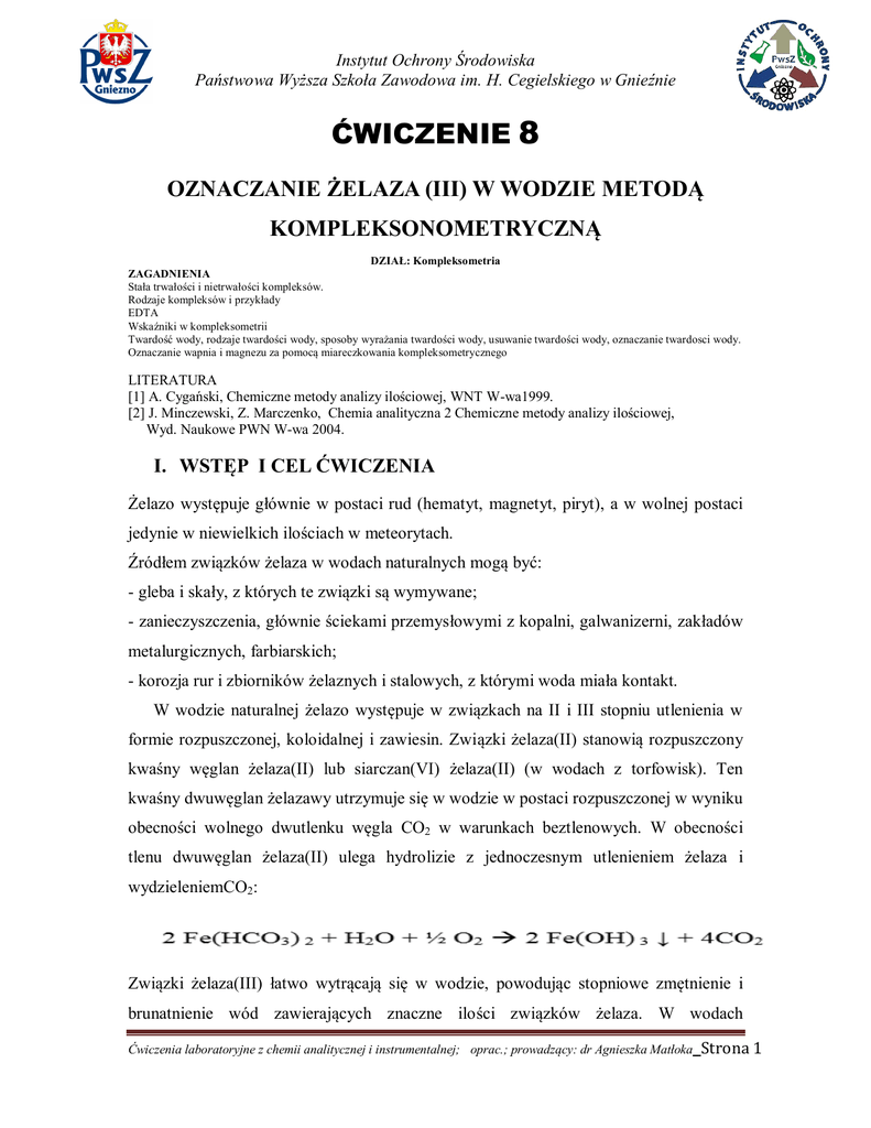 Instytut Ochrony Środowiska Państwowa Wyższa Szkoła Zawodowa im. H. Cegielskiego w Gnieźnie ĆWICZENIE 8 OZNACZANIE ŻELAZA (III) W WODZIE METODĄ KOMPLEKSONOMETRYCZNĄ DZIAŁ: Kompleksometria ZAGADNIENIA Stała trwałości i nietrwałości kompleksów. Rodzaje kompleksów i przykłady EDTA Wskaźniki w kompleksometrii Twardość wody, rodzaje twardości wody, sposoby wyrażania twardości wody, usuwanie twardości wody, oznaczanie twardosci wody. Oznaczanie wapnia i magnezu za pomocą miareczkowania kompleksometrycznego LITERATURA [1] A. Cygański, Chemiczne metody analizy ilościowej, WNT W-wa1999. [2] J. Minczewski, Z. Marczenko, Chemia analityczna 2 Chemiczne metody analizy ilościowej, Wyd. Naukowe PWN W-wa 2004. I. WSTĘP I CEL ĆWICZENIA Żelazo występuje głównie w postaci rud (hematyt, magnetyt, piryt), a w wolnej postaci jedynie w niewielkich ilościach w meteorytach. Źródłem związków żelaza w wodach naturalnych mogą być: - gleba i skały, z których te związki są wymywane; - zanieczyszczenia, głównie ściekami przemysłowymi z kopalni, galwanizerni, zakładów metalurgicznych, farbiarskich; - korozja rur i zbiorników żelaznych i stalowych, z którymi woda miała kontakt. W wodzie naturalnej żelazo występuje w związkach na II i III stopniu utlenienia w formie rozpuszczonej, koloidalnej i zawiesin. Związki żelaza(II) stanowią rozpuszczony kwaśny węglan żelaza(II) lub siarczan(VI) żelaza(II) (w wodach z torfowisk). Ten kwaśny dwuwęglan żelazawy utrzymuje się w wodzie w postaci rozpuszczonej w wyniku obecności wolnego dwutlenku węgla CO2 w warunkach beztlenowych. W obecności tlenu dwuwęglan żelaza(II) ulega hydrolizie z jednoczesnym utlenieniem żelaza i wydzieleniemCO2: Związki żelaza(III) łatwo wytrącają się w wodzie, powodując stopniowe zmętnienie i brunatnienie wód zawierających znaczne ilości związków żelaza. W wodach Ćwiczenia laboratoryjne z chemii analitycznej i instrumentalnej; oprac.; prowadzący: dr Agnieszka Matłoka Strona 1 Instytut Ochrony Środowiska Państwowa Wyższa Szkoła Zawodowa im. H. Cegielskiego w Gnieźnie zawierających dużo związków organicznych, a szczególnie związków humusowych, proces ten zachodzi częściowo, gdyż związki te mogą odgrywać rolę koloidów ochronnych zapobiegających wytrącaniu się rdzawego Fe(OH)3. Dopuszczalne stężenia żelaza w wodzie (mg/dm3) wynoszą: wody powierzchniowe klasa I – 1,0; wody powierzchniowe klasa II – 1,5; wody powierzchniowe klasa III – 2,0; woda do picia – 0,2. Woda zawierająca wysoką zawartość Fe3+ ma barwę rdzawą, obniża walory smakowe wody, przyczynia się do rozwoju bakterii żelazistych, brudzi pranie. Jedną z metod oznaczania jonów żelaza (III) w wodzie jest metoda wersenianowa; miareczkuje się w środowisku kwaśnym pH 2-3 za pomocą mianowanego roztworu EDTA wobec kwasu salicylowego jako wskaźnika. W tych warunkach wskaźnik wiąże w związek kompleksowy żelazo barwiąc roztwór na fioletowo. Dodawany w trakcie miareczkowania titrant wypiera wskaźnik z związku kompleksowego, wiążąc się z jonami żelaza (III). W PK miareczkowania EDTA całkowicie wiąże jony żelaza (III) a uwolniony wskaźnik zyskuje barwę żółtą. Właściwe oznaczenie poprzedza utlenienie ewentualnych jonów żelaza (II) do (III) za pomocą wody utlenionej, w środowisku kwaśnym. Fe 3+ + H2Y2- ↔ FeY2- + 2H+ Metoda ta stosowana może być przy zawartości żelaza większej niż 10 mg/dm3. II. SPRZĘT I ODCZYNNIKI: - 0,1M HCl glicyna kwas sulfosalicylowy w acetonie 6% 0,005 M EDTA pipeta poj. 20 ml - kolbka miarowa poj. 100 ml - biureta poj.50ml ze statywem - cylinder miarowy poj. 25 ml - kolbka stożkowa poj. 250 ml III. METODYKA: Otrzymany do analizy roztwór rozcieńczyć wodą destylowaną w kolbce miarowej do kreski i dokładnie wymieszać. Ćwiczenia laboratoryjne z chemii analitycznej i instrumentalnej; oprac.; prowadzący: dr Agnieszka Matłoka Strona 2 Instytut Ochrony Środowiska Państwowa Wyższa Szkoła Zawodowa im. H. Cegielskiego w Gnieźnie Do kolby stożkowej wprowadzić około 70 ml wody destylowanej, 10 ml próbki wody, następnie 20 ml 0,1 M HCl, 25 ml glicyny i 0,5 ml kwasu sulfosalicylowego w acetonie. Pojawia się fioletowa barwa kompleksu Fe3+ z kwasem sulfosalicylowym. Roztwór miareczkować 0,005 M EDTA do odbarwienia, czyli zmiany barwy z fioletowej na bezbarwną. Miareczkowanie badanego roztworu na zawartość żelaza wykonać trzy razy. ZESTAWIENIE WYNIKÓW ANALIZY: Miareczkowanie I V= …….. ml Miareczkowanie II V= …….. ml Miareczkowanie III V= …….. ml Średnia wartość miareczkowania zużytego EDTA Vśr = …….. ml Zawartość żelaza w mg/l analizowanej wody obliczyć: 1). Stechiometrycznie (proporcjami) 2). ze wzoru: X Fe3+ (mg) = 0,005 × V × 55,85 × 10 V - obj. zużytego titranta w ml 55,85 - mmol Fe3+ (mg) IV. WNIOSKI Podać zawartość jonów żelaza w analizowanej wodzie. Otrzymany wynik porównać z wartościami dopuszczalnymi w wodach powierzchniowych (np. jezior, stawów, rzek) i ściekach na podstawie obowiązujących dopuszczalnych norm. Ćwiczenia laboratoryjne z chemii analitycznej i instrumentalnej; oprac.; prowadzący: dr Agnieszka Matłoka Strona 3