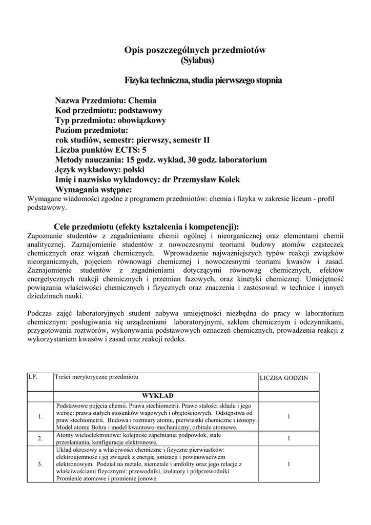 Opis poszczególnych przedmiotów (Sylabus) Fizyka techniczna, studia pierwszego stopnia Nazwa Przedmiotu: Chemia Kod przedmiotu: podstawowy Typ przedmiotu: obowiązkowy Poziom przedmiotu: rok studiów, semestr: pierwszy, semestr II Liczba punktów ECTS: 5 Metody nauczania: 15 godz. wykład, 30 godz. laboratorium Język wykładowy: polski Imię i nazwisko wykładowcy: dr Przemysław Kolek Wymagania wstępne: Wymagane wiadomości zgodne z programem przedmiotów: chemia i fizyka w zakresie liceum - profil podstawowy. Cele przedmiotu (efekty kształcenia i kompetencji): Zapoznanie studentów z zagadnieniami chemii ogólnej i nieorganicznej oraz elementami chemii analitycznej. Zaznajomienie studentów z nowoczesnymi teoriami budowy atomów cząsteczek chemicznych oraz wiązań chemicznych. Wprowadzenie najważniejszych typów reakcji związków nieorganicznych, pojęciem równowagi chemicznej i nowoczesnymi teoriami kwasów i zasad. Zaznajomienie studentów z zagadnieniami dotyczącymi równowag chemicznych, efektów energetycznych reakcji chemicznych i przemian fazowych, oraz kinetyki chemicznej. Umiejętność powiązania właściwości chemicznych i fizycznych oraz znaczenia i zastosowań w technice i innych dziedzinach nauki. Podczas zajęć laboratoryjnych student nabywa umiejętności niezbędna do pracy w laboratorium chemicznym: posługiwania się urządzeniami laboratoryjnymi, szkłem chemicznym i odczynnikami, przygotowania roztworów, wykonywania podstawowych oznaczeń chemicznych, prowadzenia reakcji z wykorzystaniem kwasów i zasad oraz reakcji redoks. LP. Treści merytoryczne przedmiotu LICZBA GODZIN WYKŁAD 1. 2. 3. Podstawowe pojęcia chemii. Prawa stechiometrii. Prawo stałości składu i jego wersje: prawa stałych stosunków wagowych i objętościowych. Odstępstwa od praw stechiometrii. Budowa i rozmiary atomu, pierwiastki chemiczne i izotopy. Model atomu Bohra i model kwantowo-mechaniczny, orbitale atomowe. Atomy wieloelektronowe: kolejność zapełniania podpowłok, stałe przesłaniania, konfiguracje elektronowe. Układ okresowy a właściwości chemiczne i fizyczne pierwiastków: elektroujemność i jej związek z energią jonizacji i powinowactwem elektronowym. Podział na metale, niemetale i amfolity oraz jego relacje z właściwościami fizycznymi: przewodniki, izolatory i półprzewodniki. Promienie atomowe i promienie jonowe. 1 1 1 4. 5. 6. 7. 8. 9. 10. 11. Budowa cząsteczek chemicznych. Typy wiązań chemicznych: teoria wiązań chemicznych Lewisa i Kossla i wartościowości i stopnie utlenienia pierwiastków; teoria orbitali molekularnych, wiązania σ i π, orbitale wiążące i antywiążące hybrydyzacja orbitali. Ważniejsze grupy związków nieorganicznych: tlenki, wodorki, wodorotlenki, kwasy tlenowe i beztlenowe, sole, hydroksosole i wodorosole. Reakcje jonowe i teorie kwasów i zasad: teoria dysocjacji elektrolitycznej Arheniusa, teoria Brönsteda, teoria elektronowa Lewisa. Równowagi w wodnych roztworach elektrolitów. Stała równowagi reakcji chemicznej. Stałe dysocjacji kwasów i zasad, stopień dysocjacji, moc kwasów i zasad. Iloczyn rozpuszczalności soli. Iloczyn jonowy wody i skala pH. Wskaźniki kwasowo-zasadowe. Hydroliza soli słabych kwasów i zasad. Roztwory buforowe. Procesy utleniania i redukcji. Szereg elektrochemiczny jonów metali. Prawa elektrolizy Faradaya. Ogniwa elektrochemiczne i akumulatory. Korozja elektrochemiczna. Potencjały (siły elektromotoryczne, SEM) półogniw i ogniw elektrochemicznych - równanie Nernsta. Efekt cieplny reakcji w warunkach stałego ciśnienia – Entalpia. Prawo Hessa. Elementy kinetyki chemicznej. Definicja szybkości reakcji. Równania kinetyczne, stała szybkości reakcji, rząd reakcji, kinetyka rzędu 0, 1, 2, 3. Czas połowicznego rozpadu. Kataliza i katalizatory, inhibitory. LABORATORIUM 2 1 1 2 2 1 1 2 2. Zapoznanie z podstawami pracy ze sprzętem laboratoryjnym i odczynnikami chemicznymi. Zasady BHP. Ważenie na wagach laboratoryjnych. Sporządzanie roztworów zadanym stężeniu Podstawy obliczeń chemicznych: obliczenia stechiometryczne i obliczanie stężeń roztworów. Iloczyn rozpuszczalności 2 3. analiza jakościowa kationów 2 4. analiza jakościowa anionów 2 5. Równowagi kwasowo-zasadowe 2 6. hydroliza soli 2 7. roztwory buforowe 2 8. Reakcje redoks 2 9. Elektroliza wodnych roztworów elektrolitów 2 2 14. Ilościowa analiza objętościowa: alkacymetria, kompleksometria, miareczkowanie redoks Ogniwa galwaniczne i szereg elektrochemiczny metali. Zależność SEM ogniwa od stężenia elektrolitu. Przewodnictwo wodnych roztworów elektrolitów. Zależność przewodnictwa równoważnikowego od stężenia i rodzaju elektrolitu. Badanie efektu cieplnego reakcji i procesów fizykochemicznych. Procesy egzoi endotermiczne. Badanie szybkości i kinetyki reakcji chemicznych 15. Metody rozdzielania mieszanin i oczyszczania związków chemicznych 1. 10. 11. 12. 13. Metody oceny: 1.Cwiaczenia Laboratoryjne: - kolokwia wstępne przed przystąpieniem do wykonania ćwiczeń (ok.15 min.) - przeprowadzenie doświadczeń chemicznych podczas zajęć - opracowanie sprawozdań z wykonanych doświadczeń 2 2 2 2 2 2 2. Wykład: egzamin pisemny w sesji egzaminacyjnej, Spis zalecanych lektur: 1. L. Pajdowski „Chemia ogólna i nieorganiczna” PWN 1994 2. A. Śliwa „Obliczenia chemiczne. Zbiór zadań z chemii ogólnej, analitycznej i nieorganicznej”PWN,1987 3. J. Micznczewski, Z.Marczenko „Chemia analityczna” PWN 1997 4. H. Całus „Podstawy obliczeńchemicznych” WNT 1987 /podpis prowadzącego/ /podpis Kierownika Zakładu/
