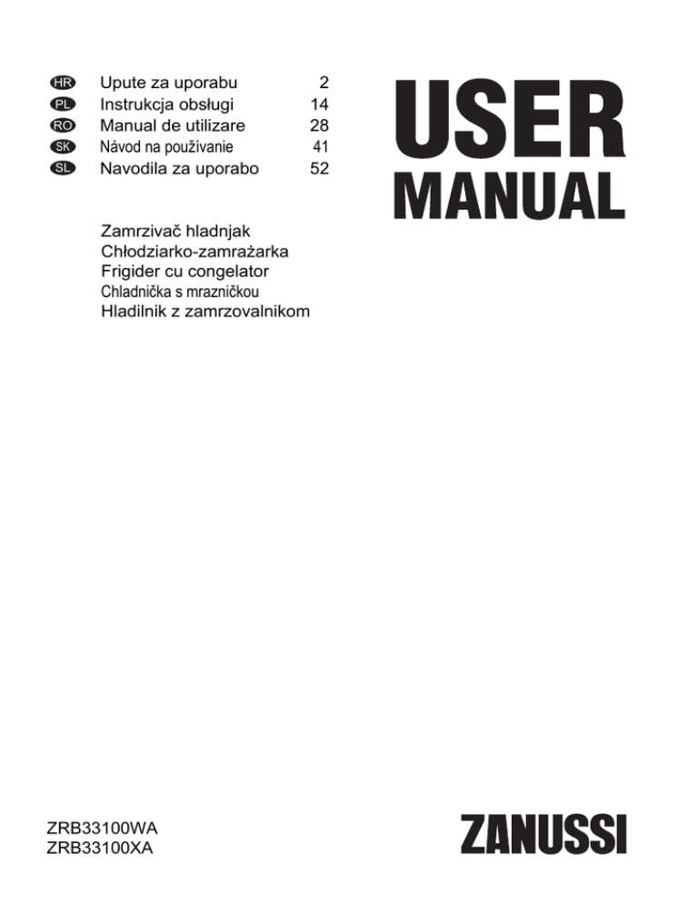 HR PL RO SK SL Upute za uporabu Instrukcja obsługi Manual de utilizare Návod na používanie Navodila za uporabo 2 14 28 41 52 Zamrzivač hladnjak Chłodziarko-zamrażarka Frigider cu congelator Chladnička s mrazničkou Hladilnik z zamrzovalnikom ZRB33100WA ZRB33100XA Sadržaj Sigurnosne upute _ _ _ _ _ _ _ _ _ _ _ _ _ Opis proizvoda _ _ _ _ _ _ _ _ _ _ _ _ _ _ _ Rad uređaja _ _ _ _ _ _ _ _ _ _ _ _ _ _ _ _ Prva uporaba _ _ _ _ _ _ _ _ _ _ _ _ _ _ _ _ Svakodnevna uporaba _ _ _ _ _ _ _ _ _ _ _ Korisni savjeti i preporuke _ _ _ _ _ _ _ _ _ 2 4 5 5 5 6 Čišćenje i održavanje _ _ _ _ _ _ _ _ _ _ _ 8 Rješavanje problema _ _ _ _ _ _ _ _ _ _ _ 9 Tehnički podaci _ _ _ _ _ _ _ _ _ _ _ _ _ _ 11 Postavljanje _ _ _ _ _ _ _ _ _ _ _ _ _ _ _ _ 11 Briga za okoliš _ _ _ _ _ _ _ _ _ _ _ _ _ _ 13 Zadržava se pravo na izmjene. Sigurnosne upute U interesu vaše sigurnosti i radi osiguravanja ispravne uporabe, prije postavljanja i prve uporabe uređaja, pročitajte pozorno upute sadržane u ovom priručniku, uključujući savjete i upozorenja. Kako bi se izbjegle nepotrebne greške i nezgode, važno je osigurati da su sve osobe koje koriste uređaj dobro upoznate s njegovim načinom rada i sigurnosnim pitanjima. Spremite ove upute i osigurajte se da prate uređaj u slučaju njegovog prenošenja ili prodaje, tako da su sve osobe koje koriste ovaj uređaj tijekom njegova radna vijeka prikladno informirane o načinu uporabe uređaja i o njegovim sigurnosnim pitanjima. Radi sigurnosti osoba i imovine, pridržavajte se mjera opreznosti iz ovih korisničkih uputa jer proizvođač nije odgovoran za štete nastale zbog propusta. Sigurnost djece i slabijih osoba • Ovaj uređaj nije pogodan za uporabu od strane osoba (uključujući djecu) smanjenih fizičkih, osjetnih ili mentalnih sposobnosti, odnosno bez potrebnog iskustva i znanja, osim ako ih ne nadgleda ili uputi u uporabu uređaja osoba odgovorna za njihovu sigurnost. Treba paziti na djecu kako bi se osiguralo da se ne igraju s uređajem. • Držite svu ambalažu izvan dohvata djece. Postoji opasnost od gušenja. • Prilikom zbrinjavanja uređaja, izvucite utikač iz utičnice, odsijecite priključni kabel (što bliže uređaju) i demontirajte vrata kako biste spriječili da djeca za vrijeme igre zadobiju električni udar ili da se zatvore u uređaju. 2 • Ako će ovaj uređaj s magnetskim brtvama na vratima zamijeniti stariji uređaj s bravom na vratima ili poklopcu, svakako onesposobite bravu prije zbrinjavanja starog uređaja. To će spriječiti da uređaj postane smrtonosna klopka za djecu. Opća sigurnost Upozorenje Ventilacijski otvori na kućištu uređaja ili ugradnom elementu ne smiju biti blokirani. • Uređaj je namijenjen čuvanju namirnica i/ili pića u kućanstvu i za upotrebe kao što su: – kuhinja za osoblje u prodavaonicama, uredima i drugim radnim prostorima, – za farme i za goste hotela, motela i drugih vrsta smještaja, – za prenoćišta, – za catering i slične nekomercijalne primjene. • Ne koristite mehanička pomagala niti bilo kakva druga sredstva za ubrzavanje procesa otapanja. • Ne koristite električne uređaje (npr. aparate za pravljenje sladoleda) u uređajima za hlađenje, osim ako ih je proizvođač odobrio za tu namjenu. • Pazite da ne oštetite sustav hlađenja. • Sustav hlađenja uređaja sadrži izobutan (R600a), prirodni plin s visokim stupnjem ekološke kompatibilnosti, koji je usprkos tomu zapaljiv. Tijekom prijevoza i postavljanja uređaja pripazite da se ne ošteti nijedna komponenta sustava hlađenja. www.zanussi.com Ako se sustav hlađenja ošteti: – izbjegavajte otvoreni plamen i izvore zapaljenja – dobro prozračite prostoriju u kojoj se uređaj nalazi • Opasan je bilo kakav pokušaj izmjene specifikacija ili samog proizvoda. Bilo kakvo oštećenje kabela može prouzročiti kratki spoj, požar i/ili strujni udar. Upozorenje Sve električne komponente (električni kabel, utikač, kompresor) mora zamijeniti ovlašteni serviser ili kvalificirani servisni tehničar kako bi se izbjegla opasnost. 1. • • • • Kabel napajanja ne smije se produživati. 2. Provjerite je li stražnji dio uređaja prignječio ili oštetio utikač. Prignječen ili oštećen utikač može se pregrijati i prouzročiti požar. 3. Provjerite imate li pristup do električnog utikača uređaja. 4. Ne povlačite kabel napajanja. 5. Ako utičnica nije dobro pričvršćena, ne umećite utikač. Postoji opasnost od strujnog udara ili požara. 6. Ne smijete upotrebljavati uređaj ako na unutarnjem svjetlu nema pokrova (ako je predviđen). Ovaj je uređaj vrlo težak. Pažljivo ga pomičite. Ne vadite i ne dirajte dijelove iz odjeljka zamrzivača ako su vam ruke vlažne/mokre jer to može uzrokovati ogrebotine ili smrzotine. Izbjegavajte produljeno izlaganje uređaja izravnom sunčevom svjetlu. Žaruljice (ako su predviđene) koje se nalaze u ovom uređaju posebno su namijenjene uporabi samo s kućanskim aparatima. Nisu prikladne za osvjetljenje stambenih prostorija. Svakodnevna uporaba • Nemojte stavljati vruće posude na plastične dijelove uređaja. www.zanussi.com • Nemojte pohranjivati zapaljive plinove i tekućine u uređaju, jer bi mogli eksplodirati. • Namirnice ne stavljajte direktno ispred otvora za zrak na stražnjoj stijenci. (Ako je uređaj Frost Free) • Smrznutu hranu ne smijete ponovo zamrzavati nakon što ste je otopili. • Držite prethodno pakiranu zaleđenu hranu u skladu s uputama proizvođača zaleđene hrane. • Strogo se pridržavajte preporuka proizvođača što se tiče čuvanja hrane. Konzultirajte odgovarajuće upute. • Nemojte stavljati gazirana i pjenušava pića u odjeljak zamrzivača jer stvaraju pritisak na spremnik koji ih sadrži, što bi moglo dovesti do eksplozije i oštećenja uređaja. • Ledene lizalice mogu prouzročiti smrzotine ako se konzumiraju izravno iz uređaja. Održavanje i čišćenje • Prije održavanja, isključite uređaj i izvadite električni utika