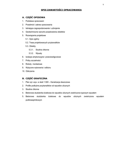 1 SPIS ZAWARTOŚCI OPRACOWANIA A. CZĘŚĆ OPISOWA 1. Podstawa opracowani 2. Przedmiot i zakres opracowania 3. Istniejące zagospodarowanie i uzbrojenie 4. Geotechniczne warunki posadowienia obiektów 5. Rozwiązania projektowe 5.1. Opis ogólny 5.2. Trasa projektowanych przykanalików 5.3. Obiekty 5.3.1. Studnie chłonne 5.3.2. Wpusty 6. Izolacje antykorozyjne i przeciwwilgociowe 7. Próby szczelności 8. Roboty montażowe 9. Wytyczne wykonania i odbioru 10. Obliczenia B. CZĘŚĆ GRAFICZNA 1. Plan syt.-wys. w skali 1:500 – Kanalizacja deszczowa 2. Profile podłużne przykanalików od wpustów ulicznych 3. Studnie chłonne 4. Betonowa studzienka ściekowa do wpustów ulicznych zwieńczona typowym wpustem 5. Betonowa studzienka podkrawężnikowym ściekowa do wpustów ulicznych zwieńczona wpustem 2 OPIS TECHNICZNY do projektu wykonawczego kanalizacji deszczowej w ramach budowy nawierzchni ulicy Spacerowej w Nowej Wsi Wielkiej 1. Podstawa opracowania • Zlecenie Inwestora tj. Gminy Nowa Wieś Wielka • Podkłady mapowe w skali 1:500 z naniesionym uzbrojeniem i stanem prawnym terenu, • Projekt ulicy Spacerowej w Nowej Wsi Wielkiej – oprac. branży drogowej • Geotechniczne warunki posadowienia obiektów budowlanych – oprac. marzec 2007 r. 2. Przedmiot i zakres opracowania Przedmiotem opracowania jest projekt odprowadzenia wód opadowych i roztopowych z nawierzchni ulicy Spacerowej. Zakres inwestycji przewiduje: budowę przykanalików deszczowych φ 0.25m ΣL= 20.5m, budowę 4 studni chłonnych budowę 7 typowych wpustów drogowych, budowę 1 wpustu drogowego podkrawężnikowego 3. Istniejący zagospodarowanie i uzbrojenie Obecnie ulica posiada nawierzchnię gruntową. Okalająca zabudowa przedmiotowej drogi charakteryzuje się zabudową jednorodzinną. W omawianym terenie występuje następujące uzbrojenie: sieć wodociągowa kanalizacja sanitarna φ 0.120m, kable teletechniczne, uzbrojenie elektroenergetyczne. 4. Geotechniczne warunki posadowienia obiektów Na podstawie prac i badań wykonanych na dokumentowanym terenie, występują tam grunty podzielone na następujące warstwy geotechniczne: − warstwa I – nasypy − warstwa II - piaski drobne 3 Powierzchnia terenu przykryta jest nasypami wykształconymi jako drobne piaski humusowe o miąższości 0,3 m. Zaliczone zostały do warstwy I. Pod nasypami zalegają grunty zaliczone do warstwy II. Wykształcone są jako średniozagęszczone piaski drobne. Ich stopień zagęszczenia ID= 0,60. Są to piaski równoziarniste, 85% ich ziaren posiada średnicę zawartą między 0,25 mm a 0,10 mm. Współczynnik filtracji k = 5 x 10-6 m/sek. W trakcie prowadzenia badań stwierdzono występowanie wody gruntowej o swobodnym zwierciadle stabilizującym się na rzędnej około 70,6 m npm. Odpowiada to głębokości 2,6-3,1 m poniżej powierzchni terenu. Ponieważ badania wykonywane były w okresie długotrwałej suszy, udokumentowany poziom wody gruntowej zbliżony jest do minimalnego. Poziom maksymalny może być wyższy o ok. 1,0 - 1,5 m. WNIOSKI Analizując wyniki prac i badań wykonanych na dokumentowanym terenie, stwierdza się ze w bezpośrednim rejonie rozpoznanych skrzyżowań występują dobre warunki geotechniczne. Ponieważ grunty w Nowej Wsi Wielkiej są jednorodne, z dużym prawdopodobieństwem można założyć, że udokumentowane warunki geotechniczne występują w obszarze sąsiadującym z projektowaną ulicą. Według § 7 Rozporządzenia Ministra SWiA z dnia 24 września 1998 roku /Dz.U. nr 126 poz.839/ projektowane nawierzchnie ulic należą, do pierwszej kategorii geotechnicznej. 5. Rozwiązania projektowe 5.1. Opis ogólny Projektowane odwodnienie ulicy przy pomocy studni chłonnych wynika z braku możliwości odprowadzenia wód opadowych w sposób naturalny ze względu na brak w pobliżu odbiornika, a także ze względu na ukształtowanie terenu, brak możliwości retencjonowania tych wód W bilansie wód opadowych uwzględniono jedynie ilość wód spływających z powierzchni jezdni w liniach rozgraniczenia. Wody opadowe dopływają do studni chłonnych za pośrednictwem wpustów deszczowych wyposażonych w osadniki piasku i przykanalików z rur d= 200 mm 5.2. Trasa projektowanych przykanalików Projektowane odcinki przykanalików wytrasowano w pasie drogowym projektowanej ulicy. Przebieg powyższych przewodów, podyktowany został istniejącymi 4 i projektowanymi obiektami pod- i naziemnymi, na podstawie szczegółowych rozwiązań zagospodarowania terenu. Przebiegi zostały naniesione na planach sytuacyjnych z dostosowaniem do istniejącego i projektowanego uzbrojenia podziemnego przy zastosowaniu normatywnych odległości i wymogów instytucji uzgadniających. Trasy tych przewodów winny być wytyczone przez uprawnione służby geodezyjne. Wytyczenia dokonać w oparciu o załączone współrzędne punktów charakterystycznych 5.2. Rozwiązania materiałowe 5.2.1. Przykanaliki Materiał Projektowane przykanaliki należy wykonać z rur kanalizacyjnych PP klasy SN10 wg PN-EN1852-1 średnicy φ200×7.3 mm. WŁAŚCIWOŚCI TECHNICZNE: 1. Materiał: Polipropylen, bez wypełniaczy 2. Kolor: Brunatno-pomarańczowy 3. Wewnętrzna 4. Sztywność obwodowa: Klasa SN 10, 10 kN/m 5. Zakres głębokości wbudowania: 0,5 – 8,0 m 6. Zalecana max. temperatura ścieków: warstwa z polietylenu -długotrwała 60 st. Celsjusza -krótkotrwała 90 st. Celsjusza 7. Max.prędkość ścieków w kanale: 12 m/s 8. Odporność na płukanie wysokociśnieniowe: 9. Uszczelki wykonane z duroplastycznego materiału SBR wg. EN 681 10. Kształtki odpowiadają wymiarom wg.PN-EN 1401 i PN-EN 1852 2 Spełnia wymagania normy DIN V19517 UWAGA: Konieczność stosowania rur o podwyższonej wytrzymałości wynika z konieczności spłycenia posadowienia przewodów. Pozwala to na możliwie maksymalne wykorzystanie pojemności studni chłonnych. Posadowienie Projektowane przewody z tworzyw posadowić bezpośrednio na gruncie rodzimym, pozbawionym kamieni wg 
