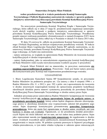 Stanowisko Związku Miast Polskich wobec przedstawionych w trakcie posiedzenia Komisji Samorządu Terytorialnego i Polityki Regionalnej zastrzeżeń do wniosku w sprawie podjęcia inicjatywy ustawodawczej dotyczącej powołania Komisji Kodyfikacyjnej Prawa Samorządu Terytorialnego Na uroczystym posiedzeniu Komisji Wspólnej Rządu i Samorządu Terytorialnego, które odbyło się w dniu 27 maja br. przedstawiciele organizacji samorządowych złożyli wspólny wniosek o podjęcie inicjatywy ustawodawczej w sprawie powołania Komisji Kodyfikacyjnej Prawa Samorządu Terytorialnego. Przedłożony projekt stanowi realizację postulatów sformułowanych w ramach Kongresu XXV-lecia Samorządu Terytorialnego, który odbył się w Poznaniu w dniach 5-6 marca 2015 roku. W dniu 10 czerwca br. odbyło się posiedzenie Komisji Samorządu Terytorialnego i Polityki Regionalnej, na którym rozpatrywano przedłożony wniosek. W trakcie obrad Komisji Biuro Legislacyjne Kancelarii Sejmu RP zgłosiło zastrzeżenia, co do ustawowej formuły powołania Komisji Kodyfikacyjnej Prawa Samorządu Terytorialnego wskazując, że budzi ona zastrzeżenia: - natury ustrojowej, ze względu na uprawnienie Rady Ministrów do tworzenia komisji kodyfikacyjnych w drodze rozporządzeń, - natury funkcjonalnej, jako że uniezależnienie organizacyjne komisji kodyfikacyjnej od Rady Ministrów rodzi ryzyko niewykorzystania wyników jej prac w przyszłości. Związek Miast Polskich stoi na stanowisku, że powyższe zastrzeżenia nie znajdują usprawiedliwionych podstaw. Przeciwnie - brak jest barier natury prawnej dla kontynuowania prac Komisji nad rozpatrzeniem przedmiotowego wniosku. UZASADNIENIE 1. Biuro Legislacyjne Kancelarii Sejmu RP bezpodstawnie uznało, że przyznanie Radzie Ministrów na podstawie przepisu art. 12a ustawy z dnia 8 sierpnia 1996 r. o Radzie Ministrów (Dz. U. z 2012 r. poz. 392 z późn. zm.) upoważnienia do tworzenia w drodze stosownych rozporządzeń komisji do opracowania projektów kodyfikacji określonych dziedzin prawa stanowi systemową przeszkodę do powołania Komisji Kodyfikacyjnej Prawa Samorządu Terytorialnego w drodze ustawy przez Sejm. Jednakże przyznana przez ustawodawcę Radzie Ministrów kompetencja do tworzenia komisji kodyfikacyjnych nie wyłącza uprawnienia Sejmu do podjęcia ustawy w przedmiocie powołania komisji, której celem będzie diagnoza obecnie obowiązującego prawa w określonej dziedzinie oraz wypracowanie założeń lub projektów jego zmian. Sejm dysponuje konstytucyjnie gwarantowaną generalną kompetencją prawodawczą, która nie może być ograniczana w drodze ustaw zwykłych, ani tym bardziej w drodze ich wykładni. Ograniczeń, co do przedmiotu działań prawodawczych Sejmu nie może dokonać ani on sam, ani też żaden inny podmiot prawa. Sejm jako reprezentant narodu jest konstytucyjnie umocowany do regulowania w drodze ustaw zwykłych wszystkich spraw publicznych, niezastrzeżonych Konstytucją RP do uregulowania w innym trybie. W polskim systemie prawnym to Sejmowi przysługuje władza prawodawcza, w tym także władza wyłączna w zakresie spraw mieszczących 1 się w tzw. materii ustawowej, i to Sejm decyduje o wyposażeniu w nią organów władzy wykonawczej w określonym przez siebie zakresie. Ustanowienie przez Sejm w ustawie zwykłej delegacji do uregulowania jakiejś materii spraw przez organ władzy wykonawczej nie prowadzi tym samym do wygaśnięcia, czy chociażby ograniczenia kompetencji ustawodawczej Sejmu w przekazanym do uregulowania zakresie spraw – Sejm może bowiem udzieloną delegację uchylić, zmienić, lub niezależnie od udzielonej delegacji wprowadzić w drodze ustawy uregulowania odmienne aniżeli uregulowania zawarte w akcie wykonawczym jako że kompetencje prawodawcze organów władzy wykonawczej nie mają samoistnego charakteru1. 2. Zauważyć nadto należy, że Biuro Legislacyjne Kancelarii Sejmu RP błędnie uznało, że powołanie Komisji Kodyfikacyjnej Prawa Samorządu Terytorialnego w drodze ustawy będzie wkraczać w materię przekazaną do uregulowania Radzie Ministrów na gruncie ustawy o Radzie Ministrów. Ustawa ta reguluje bowiem tryb oraz zasady działania i organizacji Rady Ministrów, w tym także zasady działania jej organów wewnętrznych i organów pomocniczych. Zawarte w przedmiotowej ustawie upoważnienie do tworzenia przez Radę Ministrów komisji do opracowania projektów kodyfikacji określonych dziedzin prawa (art. 12a ustawy) stanowi tym samym przydane jej przez ustawodawcę narzędzie prawne do organizacji przez Radę Ministrów sposobu wykonywania przez nią zadań publicznych. Celem przygotowania projektów aktów normatywnych lub projektów ich zmian Rada Ministrów nie musi zatem samodzielnie ich opracowywać, lecz może korzystać z pomocy utworzonych przez siebie specjalistycznych ciał, czy gremiów, które pełnią w stosunku do niej funkcje o charakterze doradczym i opiniodawczym. Komisje kodyfikacyjne powoływane przez Radę Ministrów nie stanowią tym samym samoistnych struktur organizacyjnych, lecz swoisty aparat pomocniczy Rady Ministrów, w mniejszym lub większym stopniu organizacyjnie powiązany z Radą Ministrów, jako że to Rada Ministrów określa zakres ich zadań, skład osobowy i tryb funkcjonowania. Zważywszy że Komisja Kodyfikacyjna Prawa Samorządu Terytorialnego nie ma stanowić organu pomocniczego Rady Ministrów jako organu władzy wykonawczej, jej utworzenie nie koliduje w żaden sposób z kompetencją Rady Ministrów do tworzenia własnych ciał doradczych. Wykorzystanie ustawowej formuły powołania Komisji Kodyfikacyjnej Prawa Samorządu Terytorialnego nie stanowi zatem „zamachu” na samodzielność organizacyjną Rady Ministrów. WNIOSEK: Reasumując, upoważnienie zawarte w art. 12a ustawy o Radzie Ministrów nie wyłącza, ani nie ogranicza kompetencji Sejmu do powołania komisji kodyfikacyjnej. Sejm może bowiem tworzyć różnego rodzaju jednostki organizacy