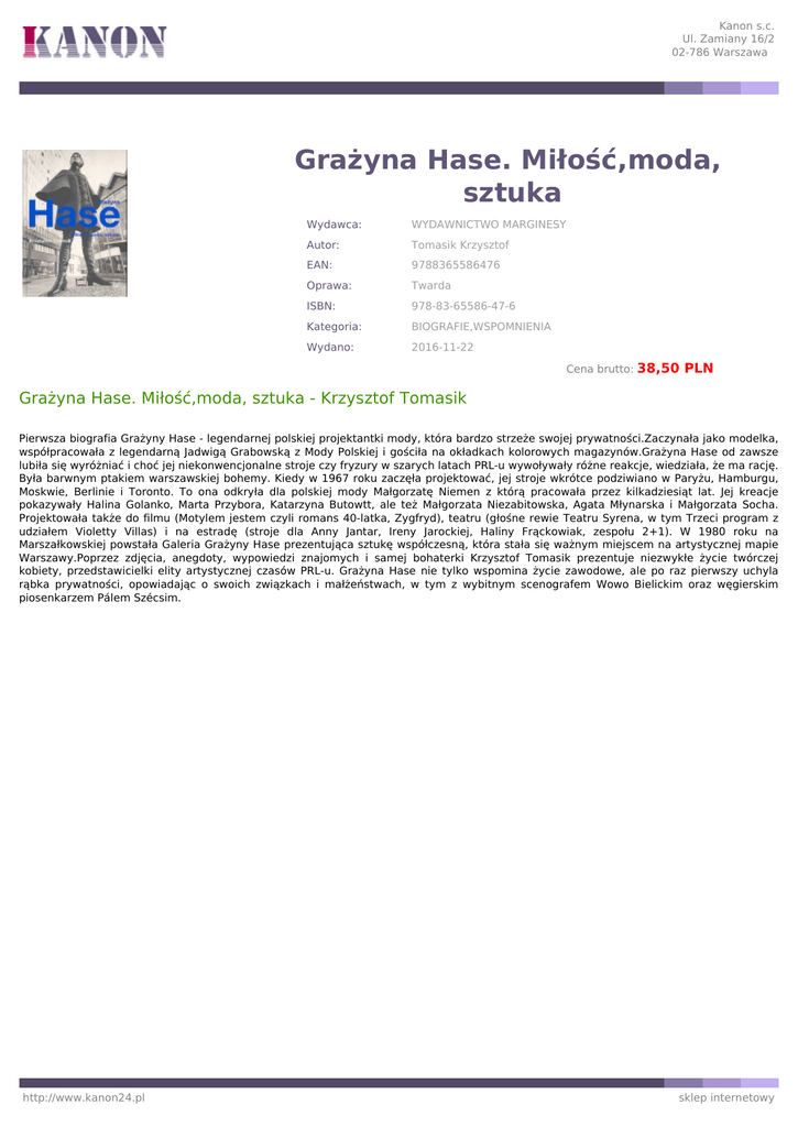 Kanon s.c. Ul. Zamiany 16/2 02-786 Warszawa Grażyna Hase. Miłość,moda, sztuka Wydawca: WYDAWNICTWO MARGINESY Autor: Tomasik Krzysztof EAN: 9788365586476 Oprawa: Twarda ISBN: 978-83-65586-47-6 Kategoria: BIOGRAFIE,WSPOMNIENIA Wydano: 2016-11-22 Cena brutto: 38,50 PLN Grażyna Hase. Miłość,moda, sztuka - Krzysztof Tomasik Pierwsza biografia Grażyny Hase - legendarnej polskiej projektantki mody, która bardzo strzeże swojej prywatności.Zaczynała jako modelka, współpracowała z legendarną Jadwigą Grabowską z Mody Polskiej i gościła na okładkach kolorowych magazynów.Grażyna Hase od zawsze lubiła się wyróżniać i choć jej niekonwencjonalne stroje czy fryzury w szarych latach PRL-u wywoływały różne reakcje, wiedziała, że ma rację. Była barwnym ptakiem warszawskiej bohemy. Kiedy w 1967 roku zaczęła projektować, jej stroje wkrótce podziwiano w Paryżu, Hamburgu, Moskwie, Berlinie i Toronto. To ona odkryła dla polskiej mody Małgorzatę Niemen z którą pracowała przez kilkadziesiąt lat. Jej kreacje pokazywały Halina Golanko, Marta Przybora, Katarzyna Butowtt, ale też Małgorzata Niezabitowska, Agata Młynarska i Małgorzata Socha. Projektowała także do filmu (Motylem jestem czyli romans 40-latka, Zygfryd), teatru (głośne rewie Teatru Syrena, w tym Trzeci program z udziałem Violetty Villas) i na estradę (stroje dla Anny Jantar, Ireny Jarockiej, Haliny Frąckowiak, zespołu 2+1). W 1980 roku na Marszałkowskiej powstała Galeria Grażyny Hase prezentująca sztukę współczesną, która stała się ważnym miejscem na artystycznej mapie Warszawy.Poprzez zdjęcia, anegdoty, wypowiedzi znajomych i samej bohaterki Krzysztof Tomasik prezentuje niezwykłe życie twórczej kobiety, przedstawicielki elity artystycznej czasów PRL-u. Grażyna Hase nie tylko wspomina życie zawodowe, ale po raz pierwszy uchyla rąbka prywatności, opowiadając o swoich związkach i małżeństwach, w tym z wybitnym scenografem Wowo Bielickim oraz węgierskim piosenkarzem Pálem Szécsim. http://www.kanon24.pl sklep internetowy