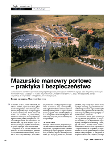 Żagle sierpień 2010 Poradnik „Żagli” henryk mieszkowski Śródlądzie Mazurskie manewry portowe – praktyka i bezpieczeństwo Manewrowanie jachtem w porcie dla jednych jest najbardziej stresującym elementem żeglugi, a dla innych najciekawszym momentem rejsu. Dlaczego? To kwestia indywidualnych umiejętności skiperów. Ci, co już dobrze potrafią, czerpią satysfakcję ze swej wiedzy i umiejętności, inni walczą o życie... Tekst i zdjęcia Mariusz Główka Mazurskie porty są różne. Od dużych, na kilkaset jachtów, często osłoniętych, gdzie nawet w najgorszych warunkach jest bezpiecznie, do pojedynczych kei wysuniętych w jezioro, nie dających dobrej osłony od wiatru i fali. Jednakże i tu, i tam, zawsze, niezależnie od miejsca, ważna jest precyzja w prowadzeniu jachtu i jak największa kontrola nad jego ruchem. Na środku jeziora nie ma znaczenia, czy jacht znajdzie się w zamierzonym miejscu, czy kilka metrów dalej. W porcie często pół metra ma znaczenie. Przypomnę to, co i tak jest oczywiste: do portu nie wchodzimy na żaglach, tylko na silniku, i na silniku manewrujemy. Podobnie na silniku wychodzimy z portu, choć 58 przyznam, że z nostalgią wspominam pływanie Ramblerem, moją pierwszą łódką, która nigdy nie widziała silnika i wszystkie manewry wykonywałem na żaglach bądź za pomocą pagajów. Teraz nie odważyłbym się na to w większości mazurskich portów. To nie te czasy, kiedy to w porcie cumowały trzy jachty na krzyż... Cumowanie Jeżeli jest taka możliwość, to przed rozpoczęciem manewru cumowania warto zrobić rozpoznanie, czyli wykonać kółko bądź dwa przed keją czy kejami i przyjrzeć się warunkom, jakie mamy w porcie. Istotne jest, aby ocenić, jak najlepiej podejść do pomostu (dziobem, rufą, burtą), czy w porcie mamy boje bądź mooringi, czy jednak trzeba rzucać kotwicę i wcześniej odpowiednio się do cumowania przygotować. Warto też ocenić, które miejsce jest bezpieczniejsze przy danym kierunku i sile wiatru. Cumowanie w porcie, gdzie są mooringi lub boje, to sama przyjemność. To wszystkim wiadomo, już po dojściu do kei łapiemy boję albo wybieramy mooring. Gorzej, gdy ich nie ma i musimy rzucić kotwicę. Jeśli manewr mamy dobrze zaplanowany i nie podchodzimy do kei po łuku, to odpowiednio wcześniej upuszczamy kotwicę do wody, w takiej odległości, na jaką pozwala długość liny kotwicznej. Gdyby się nam tego Żagle | www.zagle.com.pl