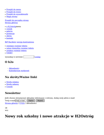 ● ● ● ● Przejdź do menu Przejdź do treści Przejdź do wyszukiwarki Mapa strony Przejdź do początku strony Strona główna ● ● ● ● ● ● o H2Ostrógmenu cennik galeria promocje oferta kontakt BiP Racibórz wersja kontrastowa ● ● ● ● zmniejsz rozmiar tekstu ustaw domyślny rozmiar tekstu zwiększ rozmiar tekstu ČESKY wyszukaj w serwisie szukaj O h2o ❍ ❍ Aktualności Kalendarium wydarzeń Na skróty/Ważne linki ● ● ● Strefa relaksu Strefa zabawy Cennik Newsletter Jeśli chcesz otrzymywać aktualne informacje z witryny, dodaj swój adres e-mail Twój e-mail Twój e-mail Zapisz Wypisz Strona główna / O h2o / Aktualności 18 wrz Nowy rok szkolny i nowe atrakcje w H2Ostróg Na dobre rozpoczął się rok szkolny, a wraz z nim nauki pływania dla uczniów z raciborskich szkół podstawowych. Nie oznacza to jednak, że pozostali młodzi i starsi użytkownicy aquaparku będą się nudzić. Zarządcy dbają, aby każdy mógł się tu dobrze czuć, więc swoją ofertę postanowili jeszcze bardziej uatrakcyjnić m.in. pokazami pierwszej pomocy przedmedycznej. Cała infomacja prasowa! wszystkie drukuj zapisz jako pdf Redagował: anna koza 2015-09-18 14:10:21 ● ● ● ● 32 415 48 09 32 415 37 17 Mail Facebook Ośrodek Sportu i Rekreacji ul. Zamkowa 4, 47-400 Racibórzgodziny otwarcia obiektu: 7 dni w tygodniu, od poniedziałku do niedzieli 6.00-22.00 ● ● ● ● ● ● ● O h2o cennik galeria promocje oferta kontakt mapa witryny Projektowanie stron: IntraCOM.pl