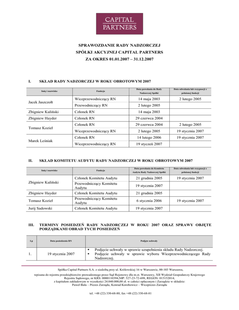 SPRAWOZDANIE RADY NADZORCZEJ SPÓŁKI AKCYJNEJ CAPITAL PARTNERS ZA OKRES 01.01.2007 – 31.12.2007 I. SKŁAD RADY NADZORCZEJ W ROKU OBROTOWYM 2007 Data powołania do Rady Data odwołania lub rezygnacji z Nadzorczej Spółki pełnionej funkcji Wiceprzewodniczący RN 14 maja 2003 2 lutego 2005 Przewodniczący RN 2 lutego 2005 Zbigniew Kuliński Członek RN 14 maja 2003 Zbigniew Hayder Członek RN 29 czerwca 2004 Członek RN 29 czerwca 2004 2 lutego 2005 Wiceprzewodniczący RN 2 lutego 2005 19 stycznia 2007 Członek RN 14 lutego 2006 19 stycznia 2007 Wiceprzewodniczący RN 19 styczeń 2007 Imię i nazwisko Funkcja Jacek Jaszczołt Tomasz Kozieł Marek Leśniak II. SKŁAD KOMITETU AUDYTU RADY NADZORCZEJ W ROKU OBROTOWYM 2007 Imię i nazwisko Funkcja Zbigniew Kuliński Zbigniew Hayder Tomasz Kozieł Jurij Sadowski III. Lp 1. Członek Komitetu Audytu Przewodniczący Komitetu Audytu Członek Komitetu Audytu Przewodniczący Komitetu Audytu Członek Komitetu Audytu Data powołania do Komitetu Data odwołania lub rezygnacji z Audytu Rady Nadzorczej Spółki pełnionej funkcji 21 grudnia 2005 19 stycznia 2007 19 stycznia 2007 21 grudnia 2005 6 stycznia 2006 19 stycznia 2007 19 stycznia 2007 TERMINY POSIEDZEŃ RADY NADZORCZEJ W ROKU 2007 ORAZ SPRAWY OBJĘTE PORZĄDKAMI OBRAD TYCH POSIEDZEŃ Data posiedzenia RN 19 stycznia 2007 Podjęte uchwały Podjęcie uchwały w sprawie uzupełnienia składu Rady Nadzorczej. Podjęcie uchwały w sprawie wyboru Wiceprzewodniczącego Rady Nadzorczej. Spółka Capital Partners S.A. z siedzibą przy ul. Królewskiej 16 w Warszawie, 00-103 Warszawa, wpisana do rejestru przedsiębiorców prowadzonego przez Sąd Rejonowy dla m.st. Warszawy, XII Wydział Gospodarczy Krajowego Rejestru Sądowego, nr KRS: 0000110394,NIP: 527-23-72-698, REGON: 015152014; z kapitałem zakładowym w wysokości 24.040.000,00 zł. w całości opłaconym i Zarządzie w składzie: Paweł Bala – Prezes Zarządu, Konrad Korobowicz – Wiceprezes Zarządu tel. +48 (22) 330-68-80, fax +48 (22) 330-68-81 2. 3. 4. 5. 6. 7. IV. Lp 20 lutego 2007 (na podst. par. 14 ust. 13) 11 kwietnia 2007 12 czerwca 2007 12 września 2007 (na podst. par. 14 ust. 11) 12 września 2007 (na podst. par. 14 ust. 11) 3 października 2007 Sprawozdanie Rady Nadzorczej Spółki Akcyjnej Capital Partners za okres 01.01.2006 – 31.12.2006 Podjęcie uchwały w sprawie uzupełnienia składu Komitetu Audytu. Podjęcie uchwały w sprawie wyboru firmy audytorskiej do zbadania jednostkowego i skonsolidowanego sprawozdania finansowego za 2006r. oraz przeglądu sprawozdania finansowego za I półrocze 2007r. Przedstawienie przez Zarząd sprawozdania z wykonania budŜetu kosztowego w 2006 roku oraz kosztów poniesionych w roku bieŜącym. Przedstawienie przez Zarząd propozycji budŜetu kosztowego na 2007 rok. Podjęcie uchwały w sprawie przyjęcia budŜetu kosztowego na 2007 rok. Podjęcie uchwały w sprawie przyjęcia tekstu jednolitego Statutu Spółki. Podjęcie uchwały w sprawie inwestycji kapitałowej w spółkę BAĆPOL Sp. z o.o. Podjęcie uchwały w sprawie wyraŜenia zgody na zbycie akcji HAWE S.A. Omówienie jednostkowego sprawozdania finansowego Spółki za rok obrotowy 2006 oraz sprawozdania Zarządu z działalności w roku 2006. Omówienie skonsolidowanego sprawozdania finansowego Spółki za rok obrotowy 2006 oraz sprawozdania Zarządu z działalności Grupy Kapitałowej w roku 2006. Przyjęcie rekomendacji Komitetu Audytu Rady Nadzorczej Capital Partners S.A. w sprawie dokonania oceny jednostkowego i skonsolidowanego sprawozdania finansowego za rok obrotowy 2006. Podjęcie uchwał w sprawie przyjęcia sprawozdania Rady Nadzorczej z oceny jednostkowego i skonsolidowanego sprawozdania finansowego i sprawozdania Zarządu z działalności Spółki oraz z działalności Grupy Kapitałowej za okres 01.01.2006r. do 31.12.2006r. Podjęcie uchwały w sprawie przyjęcia sprawozdania z działalności Rady Nadzorczej za okres 01.01.2006r. do 31.12.2006r. Przyjęcie zmiany par. 9 lit. h), i), j) i n).Regulaminu Rady Nadzorczej. Podjęcie uchwały w sprawie wyboru Pana Pawła Bala do Zarządu Spółki na następną kadencję i powierzenia mu funkcji Prezesa Zarządu. Podjęcie uchwały w sprawie wyboru Pana Macieja Górskiego do Zarządu Spółki i powierzenia mu funkcji Wiceprezesa Zarządu. WyraŜenie opinii do projektów uchwał na Zwyczajne Walne Zgromadzenie Capital Partners S.A. zwołane na dzień 19 czerwca 2007r. Podjęcie uchwały w sprawie ustalenia tekstu jednolitego Statutu Spółki Podjęcie uchwały w sprawie przyjęcia tekstu jednolitego Regulaminu Rady Nadzorczej Spółki Podjęcie uchwały w sprawie inwestycji kapitałowej w spółkę Piecexport Sp. z o.o. TERMINY POSIEDZEŃ KOMITETU AUDYTU RADY NADZORCZEJ W ROKU 2007 ORAZ SPRAWY OBJĘTE PORZĄDKAMI OBRAD TYCH POSIEDZEŃ Data posiedzenia Komitetu Audytu Podjęte tematy 1. 20 lutego 2007 2. 12 czerwca 2007 Wybór Przewodniczącego Komitetu Audytu Zapoznanie się z ofertami firm audytorskich i wybór jednej z nich do przeprowadzenia badania sprawozdania finansowego (jednostkowego i skonsolidowanego) za rok 2006 oraz przeglądu sprawozdania finansowego za I półrocze 2007r. Zapoznanie się z jednostkowym sprawozdaniem finansowym za rok obrotowy 2006 oraz z raportem i opinią biegłego rewidenta z badania, celem sporządzenia dla Rady Nadzorczej Capital Partners S.A. propozycji oceny jednostkowego sprawozdania finansowego za rok obrotowy 2006. 2/3 V. Sprawozdanie Rady Nadzorczej Spółki Akcyjnej Capital Partners za okres 01.01.2006 – 31.12.2006 Zapoznanie się ze skonsolidowanym sprawozdaniem finansowym za rok obrotowy 2006 oraz z raportem i opinią biegłego rewidenta z badania, celem sporządzenia dla Rady Nadzorczej Capital Partners S.A. propozycji oceny skonsolidowanego sprawozdania finansowego za rok obrotowy 2006. OCENA PRACY RADY NADZORCZEJ ZGODNIE Z ZASADAMI ŁADU KORPORACYJNEGO ZAWARTYMI W ZBIORZE „DOBRE PRAKTYKI SPÓŁEK NOTOWANYH NA GPW” W 2007 roku 