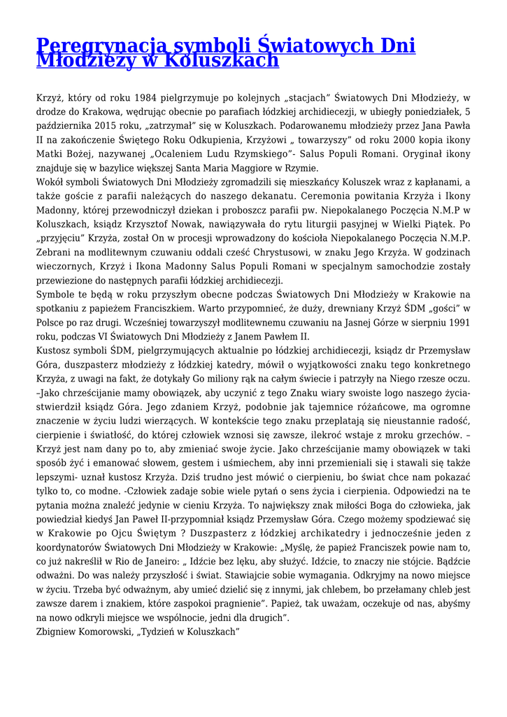 Peregrynacja symboli Światowych Dni Młodzieży w Koluszkach Krzyż, który od roku 1984 pielgrzymuje po kolejnych „stacjach” Światowych Dni Młodzieży, w drodze do Krakowa, wędrując obecnie po parafiach łódzkiej archidiecezji, w ubiegły poniedziałek, 5 października 2015 roku, „zatrzymał” się w Koluszkach. Podarowanemu młodzieży przez Jana Pawła II na zakończenie Świętego Roku Odkupienia, Krzyżowi „ towarzyszy” od roku 2000 kopia ikony Matki Bożej, nazywanej „Ocaleniem Ludu Rzymskiego”- Salus Populi Romani. Oryginał ikony znajduje się w bazylice większej Santa Maria Maggiore w Rzymie. Wokół symboli Światowych Dni Młodzieży zgromadzili się mieszkańcy Koluszek wraz z kapłanami, a także goście z parafii należących do naszego dekanatu. Ceremonia powitania Krzyża i Ikony Madonny, której przewodniczył dziekan i proboszcz parafii pw. Niepokalanego Poczęcia N.M.P w Koluszkach, ksiądz Krzysztof Nowak, nawiązywała do rytu liturgii pasyjnej w Wielki Piątek. Po „przyjęciu” Krzyża, został On w procesji wprowadzony do kościoła Niepokalanego Poczęcia N.M.P. Zebrani na modlitewnym czuwaniu oddali cześć Chrystusowi, w znaku Jego Krzyża. W godzinach wieczornych, Krzyż i Ikona Madonny Salus Populi Romani w specjalnym samochodzie zostały przewiezione do następnych parafii łódzkiej archidiecezji. Symbole te będą w roku przyszłym obecne podczas Światowych Dni Młodzieży w Krakowie na spotkaniu z papieżem Franciszkiem. Warto przypomnieć, że duży, drewniany Krzyż ŚDM „gości” w Polsce po raz drugi. Wcześniej towarzyszył modlitewnemu czuwaniu na Jasnej Górze w sierpniu 1991 roku, podczas VI Światowych Dni Młodzieży z Janem Pawłem II. Kustosz symboli ŚDM, pielgrzymujących aktualnie po łódzkiej archidiecezji, ksiądz dr Przemysław Góra, duszpasterz młodzieży z łódzkiej katedry, mówił o wyjątkowości znaku tego konkretnego Krzyża, z uwagi na fakt, że dotykały Go miliony rąk na całym świecie i patrzyły na Niego rzesze oczu. –Jako chrześcijanie mamy obowiązek, aby uczynić z tego Znaku wiary swoiste logo naszego życiastwierdził ksiądz Góra. Jego zdaniem Krzyż, podobnie jak tajemnice różańcowe, ma ogromne znaczenie w życiu ludzi wierzących. W kontekście tego znaku przeplatają się nieustannie radość, cierpienie i światłość, do której człowiek wznosi się zawsze, ilekroć wstaje z mroku grzechów. – Krzyż jest nam dany po to, aby zmieniać swoje życie. Jako chrześcijanie mamy obowiązek w taki sposób żyć i emanować słowem, gestem i uśmiechem, aby inni przemieniali się i stawali się także lepszymi- uznał kustosz Krzyża. Dziś trudno jest mówić o cierpieniu, bo świat chce nam pokazać tylko to, co modne. -Człowiek zadaje sobie wiele pytań o sens życia i cierpienia. Odpowiedzi na te pytania można znaleźć jedynie w cieniu Krzyża. To największy znak miłości Boga do człowieka, jak powiedział kiedyś Jan Paweł II-przypomniał ksiądz Przemysław Góra. Czego możemy spodziewać się w Krakowie po Ojcu Świętym ? Duszpasterz z łódzkiej archikatedry i jednocześnie jeden z koordynatorów Światowych Dni Młodzieży w Krakowie: „Myślę, że papież Franciszek powie nam to, co już nakreślił w Rio de Janeiro: „ Idźcie bez lęku, aby służyć. Idźcie, to znaczy nie stójcie. Bądźcie odważni. Do was należy przyszłość i świat. Stawiajcie sobie wymagania. Odkryjmy na nowo miejsce w życiu. Trzeba być odważnym, aby umieć dzielić się z innymi, jak chlebem, bo przełamany chleb jest zawsze darem i znakiem, które zaspokoi pragnienie”. Papież, tak uważam, oczekuje od nas, abyśmy na nowo odkryli miejsce we wspólnocie, jedni dla drugich”. Zbigniew Komorowski, „Tydzień w Koluszkach”