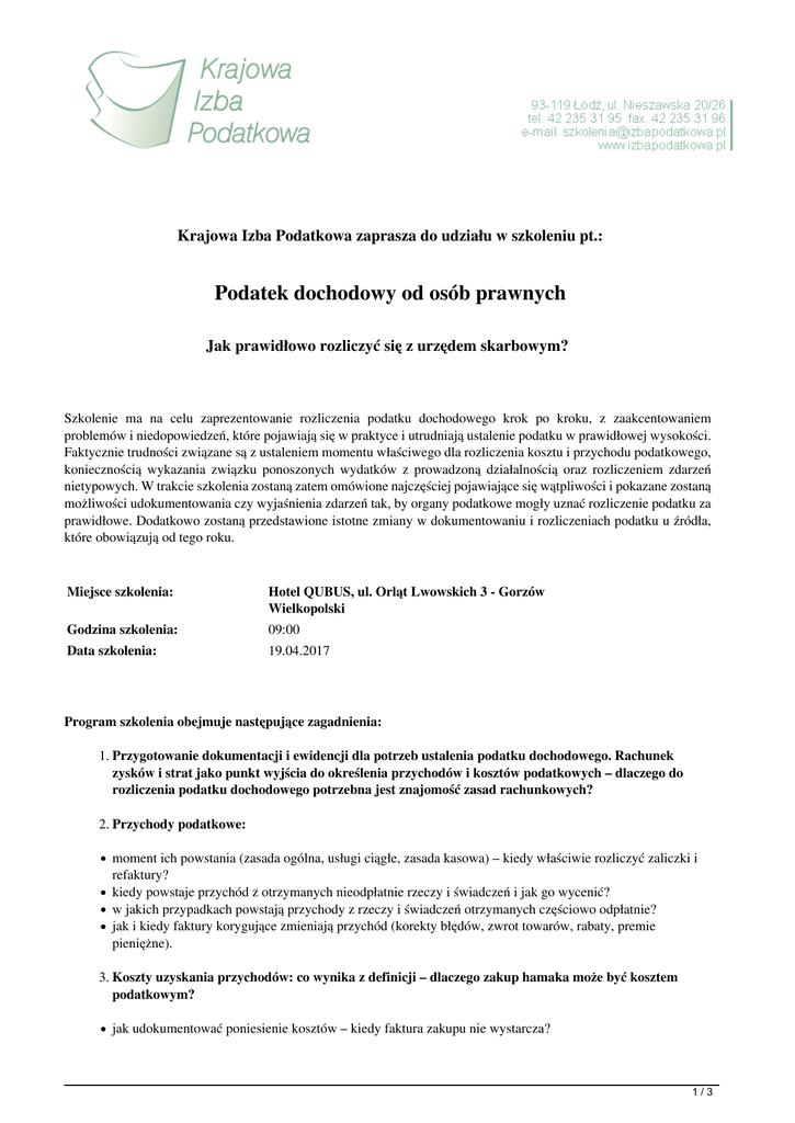 Krajowa Izba Podatkowa zaprasza do udziału w szkoleniu pt.: Podatek dochodowy od osób prawnych Jak prawidłowo rozliczyć się z urzędem skarbowym? Szkolenie ma na celu zaprezentowanie rozliczenia podatku dochodowego krok po kroku, z zaakcentowaniem problemów i niedopowiedzeń, które pojawiają się w praktyce i utrudniają ustalenie podatku w prawidłowej wysokości. Faktycznie trudności związane są z ustaleniem momentu właściwego dla rozliczenia kosztu i przychodu podatkowego, koniecznością wykazania związku ponoszonych wydatków z prowadzoną działalnością oraz rozliczeniem zdarzeń nietypowych. W trakcie szkolenia zostaną zatem omówione najczęściej pojawiające się wątpliwości i pokazane zostaną możliwości udokumentowania czy wyjaśnienia zdarzeń tak, by organy podatkowe mogły uznać rozliczenie podatku za prawidłowe. Dodatkowo zostaną przedstawione istotne zmiany w dokumentowaniu i rozliczeniach podatku u źródła, które obowiązują od tego roku. Miejsce szkolenia: Hotel QUBUS, ul. Orląt Lwowskich 3 - Gorzów Wielkopolski Godzina szkolenia: 09:00 Data szkolenia: 19.04.2017 Program szkolenia obejmuje następujące zagadnienia: 1. Przygotowanie dokumentacji i ewidencji dla potrzeb ustalenia podatku dochodowego. Rachunek zysków i strat jako punkt wyjścia do określenia przychodów i kosztów podatkowych – dlaczego do rozliczenia podatku dochodowego potrzebna jest znajomość zasad rachunkowych? 2. Przychody podatkowe: moment ich powstania (zasada ogólna, usługi ciągłe, zasada kasowa) – kiedy właściwie rozliczyć zaliczki i refaktury? kiedy powstaje przychód z otrzymanych nieodpłatnie rzeczy i świadczeń i jak go wycenić? w jakich przypadkach powstają przychody z rzeczy i świadczeń otrzymanych częściowo odpłatnie? jak i kiedy faktury korygujące zmieniają przychód (korekty błędów, zwrot towarów, rabaty, premie pieniężne). 3. Koszty uzyskania przychodów: co wynika z definicji – dlaczego zakup hamaka może być kosztem podatkowym? jak udokumentować poniesienie kosztów – kiedy faktura zakupu nie wystarcza? 1/3 koszty bezpośrednie i pośrednie – jak je odróżnić? moment poniesienia kosztu –dlaczego przyjęta polityka rachunkowości jest taka ważna? kiedy zapłaty gotówkowe nie są kosztem podatkowym? zasady przyporządkowania kosztu do roku podatkowego – które z kosztów należy rozliczać w czasie, a które nie? Omówienie różnic pomiędzy interpretacjami organów podatkowych a orzecznictwem sądowym. 4. Wycena kursów walut: moment przeliczenia przychodów i kosztów: dlaczego kurs faktyczny jest ważniejszy od średniego kursu NBP i kto właściwie określa czym jest kurs faktyczny? rodzaje podatkowych różnic kursowych – czy na koncie walutowym należy wyceniać odrębnie wpływ i rozchód waluty? 5. Rozliczenia z kontrahentami: kontrahenci dobrzy – czyli jak ich przyjąć i obdarować a wydatki rozliczyć w kosztach podatkowych? Czy logo na prezencie wystarczy by z reprezentacji przejść w reklamę? kontrahenci źli (bo nie płacą) – jak z niezapłaconych należności zrobić koszty podatkowe? kiedy zapłacone kary, odszkodowania, koszty sądowe i egzekucyjne są kosztem podatkowym? 6. Rozliczenia z pracownikami: które ze świadczeń rozlicza się kasowo a które memoriałowo? które świadczenia nie mogą być kosztem podatkowym? czy w ryczałcie za używanie firmowego samochodu jest uwzględnione paliwo? 7. Podatek u źródła: dookreślenie od 2017r. pojęcia „przychody osiągane na terytorium Polski” oraz „faktyczny właściciel” – jakie konsekwencje praktyczne mają powyższe zmiany? kiedy można skorzystać ze zwolnienia a kiedy można zastosować obniżoną stawkę podatku? terminy rozliczenia z organem podatkowym oraz wymagane dokumenty 8. Odliczenia od dochodu lub podstawy opodatkowania: jak otrzymanie dotacji (środków UE) wpływa na korektę kosztów związanych z amortyzacją podatkową? zasady odliczania darowizn ulga na działalność badawczo-rozwojową po zmianach Cena szkolenia obejmuje: zajęcia dydaktyczne, materiały szkoleniowe przygotowane przez eksperta, dyplom ukończenia szkolenia, lunch, serwis kawowy. Rezerwacja wg kolejności zgłoszeń. Ilość miejsc ograniczona. W celu zgłoszenia udziału w szkoleniu należy wypełnić formularz zgłoszeniowy i przesłać go faksem na numer: (042) 235-31-96. Po otrzymaniu zgłoszenia odeślemy Państwu potwierdzenie przyjęcia rezerwacji. Dodatkowe informacje można uzyskać pod numerem (042) 235-31-95. Serdecznie zapraszamy. 2/3 Rozpoczęcie szkolenia: 19.04.2017 09:00 Ilość godzin: 5 Miejsce szkolenia: Hotel QUBUS, ul. Orląt Lwowskich 3 - Gorzów Wielkopolski Cena regularna uczestnictwa jednej osoby netto: 390,00 zł Cena regularna uczestnictwa jednej osoby brutto: 479,70 zł 3/3 Powered by TCPDF (www.tcpdf.org)